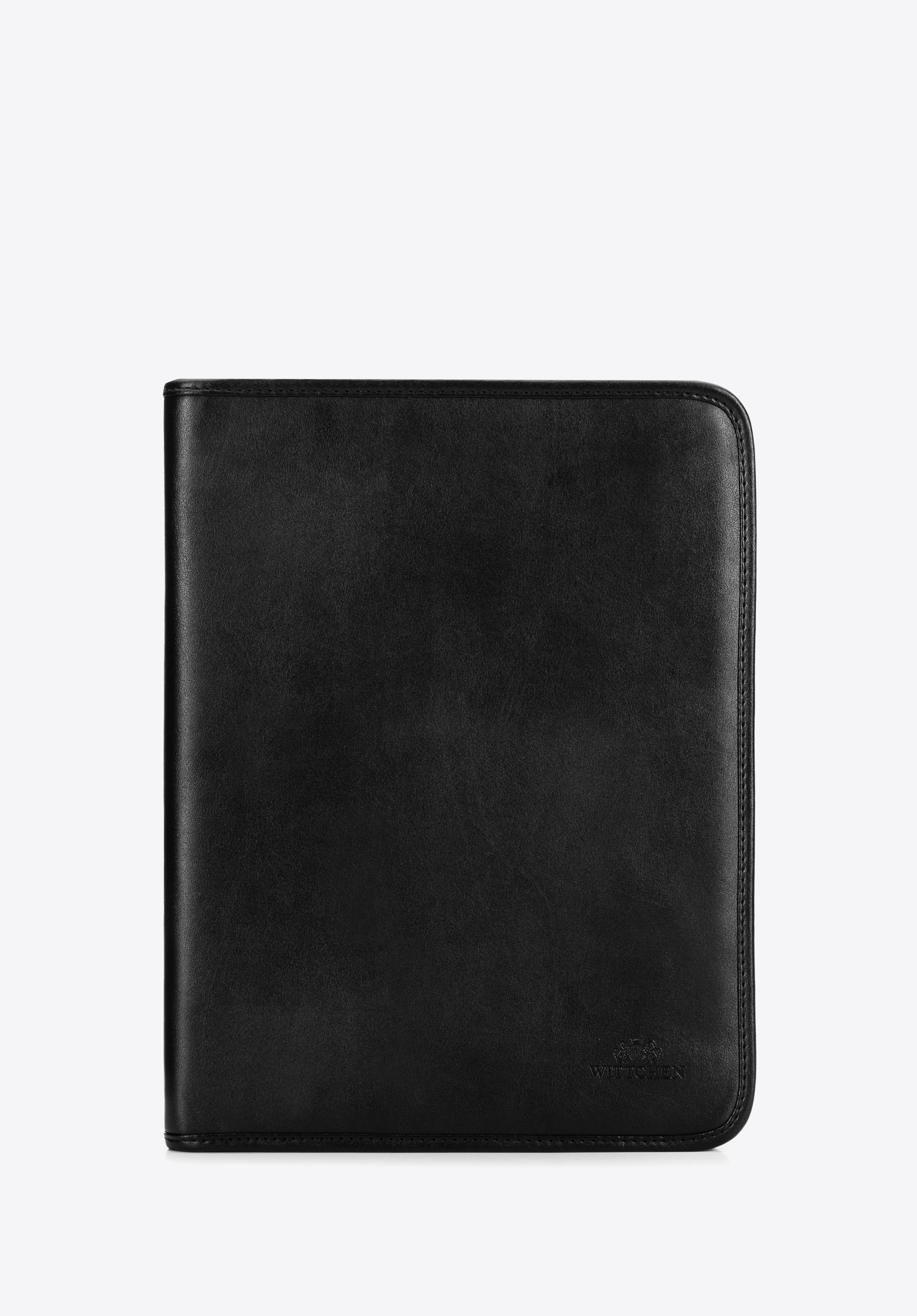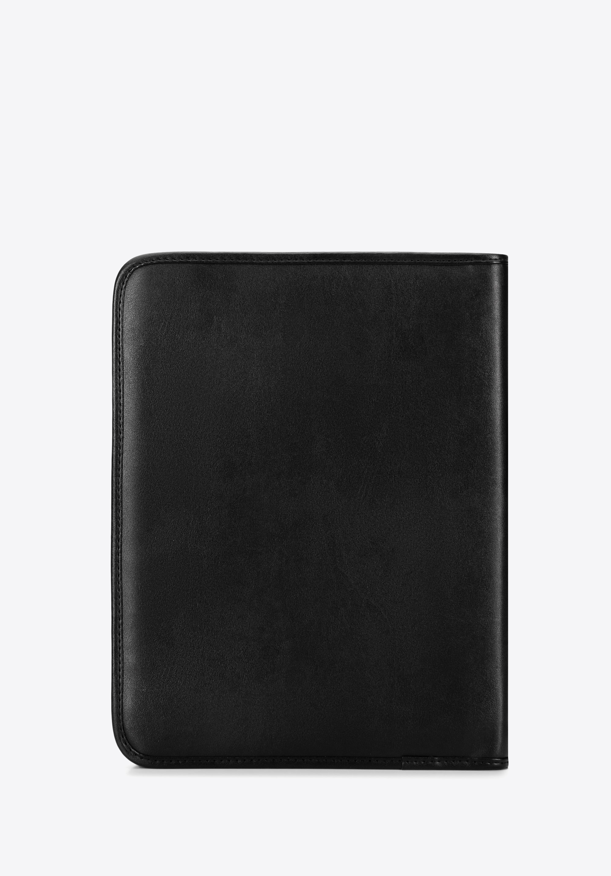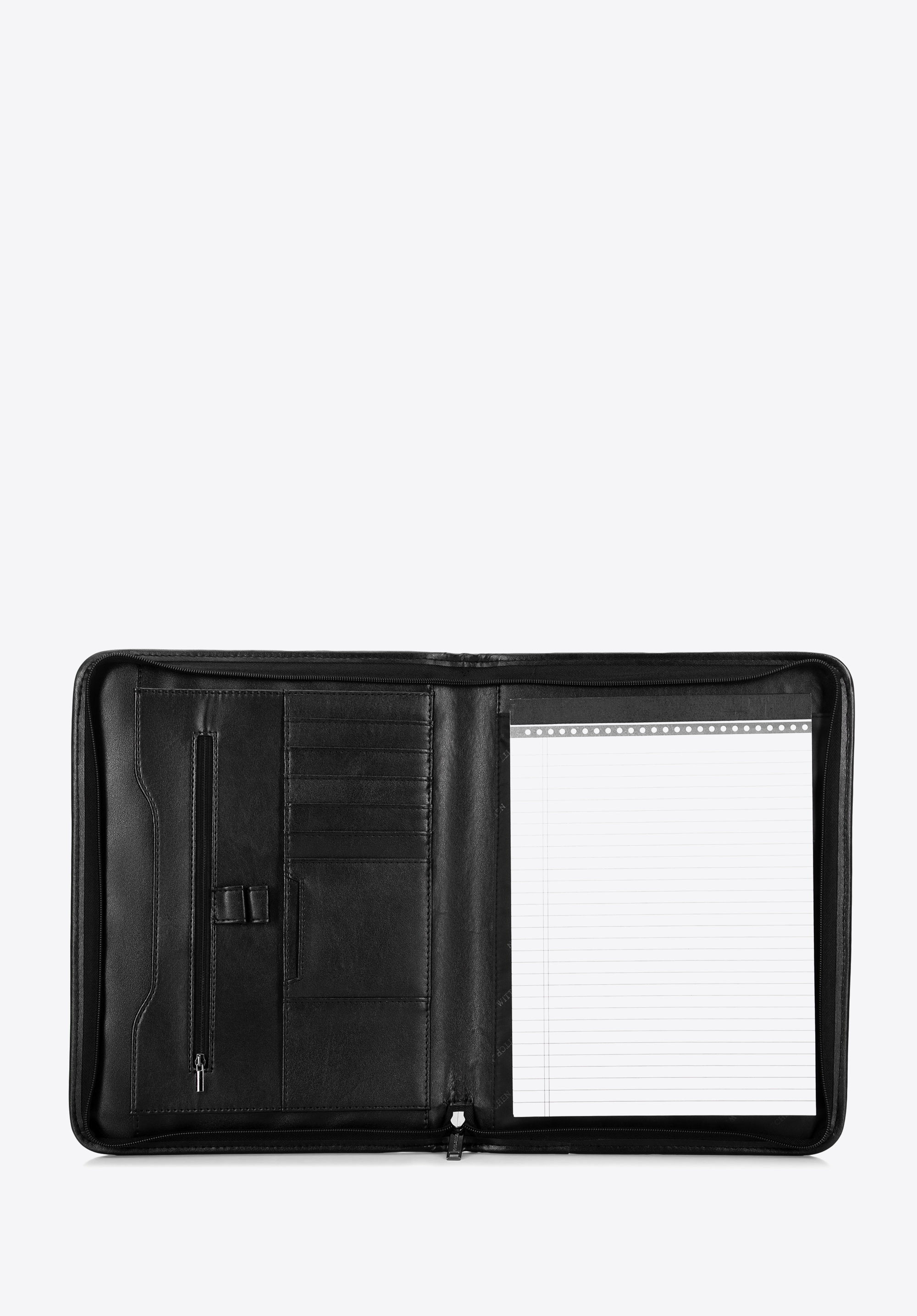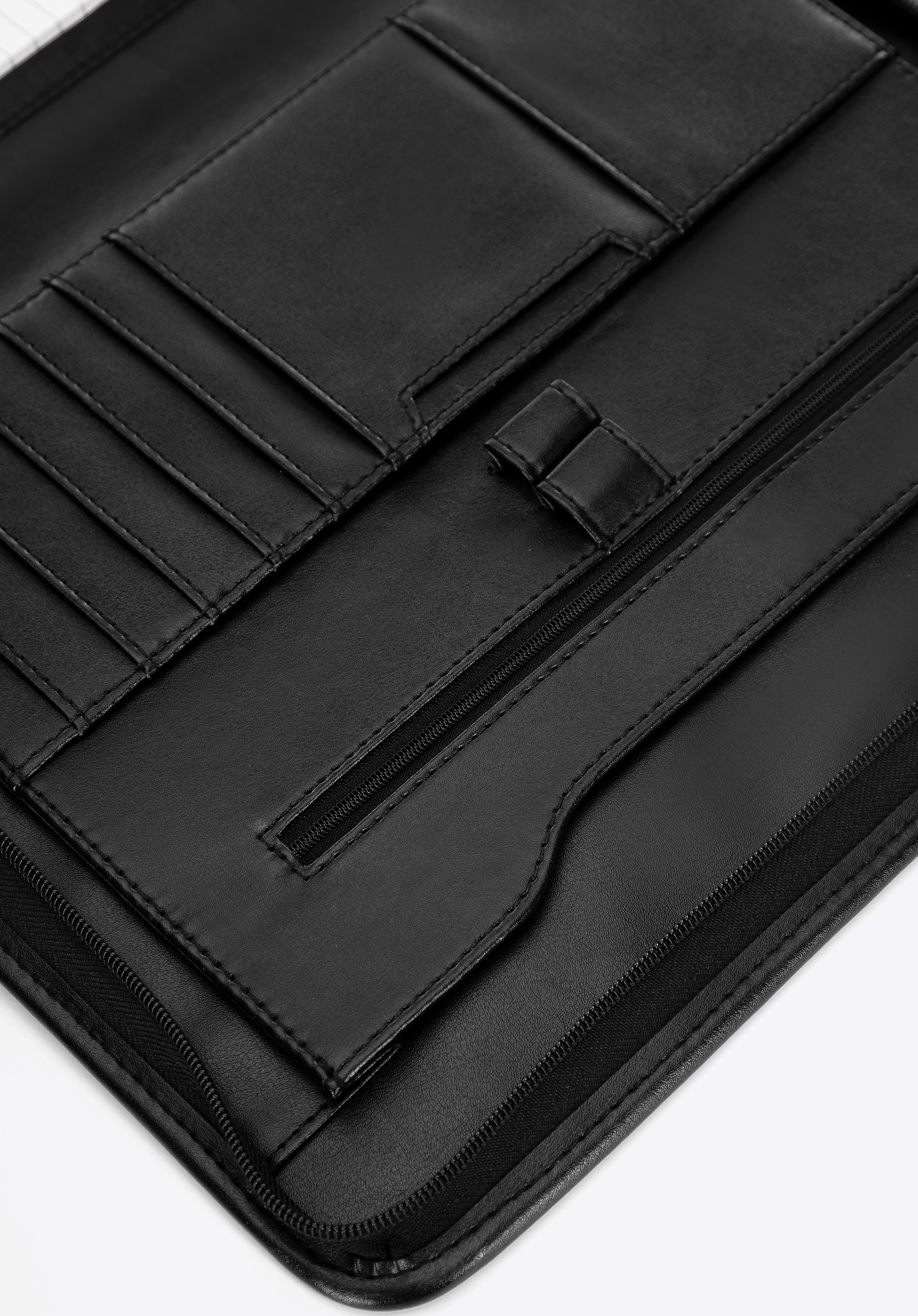 - Wnętrze: Po jednej stronie znajduje się 6 miejsc na karty i wizytówki oraz kilka kieszeni. Druga strona wyposażona jest w zakładkę na dokumenty A4.