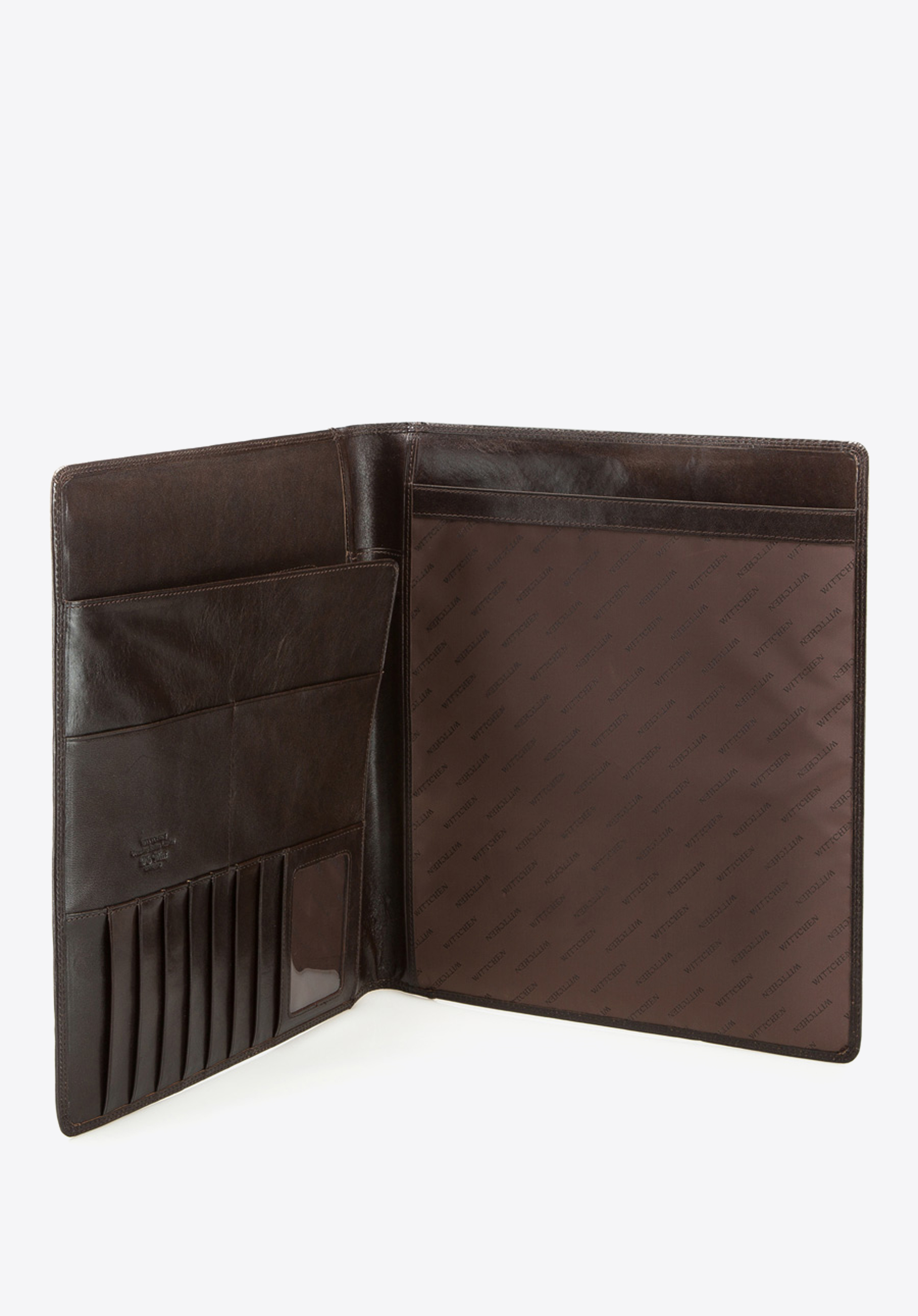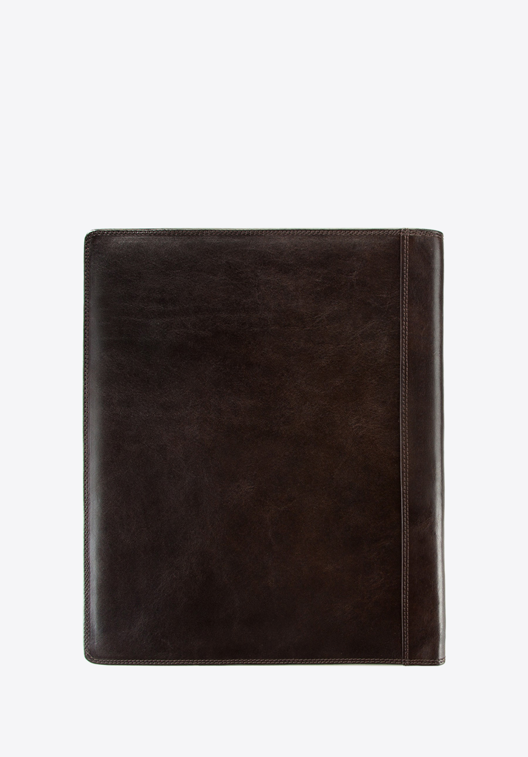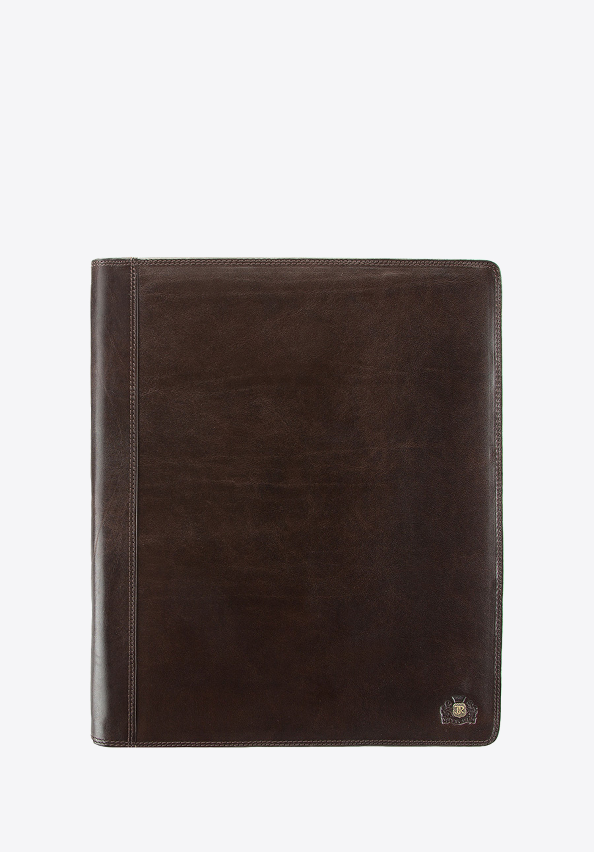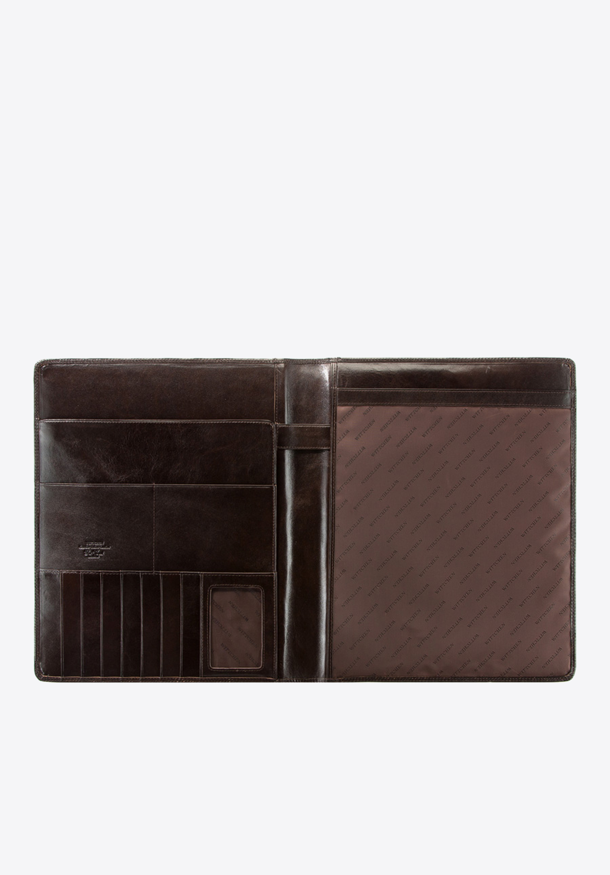 Elegancka aktówka wykonana ręcznie z najwyższej jakości skóry cielęcej to model, który wyróżnia się elegancją i luksusowym wykończeniem. Z przodu posiada widoczne logo - inicjały ozdobione tarczą w kolorze złotym na wytłoczonym herbie. Aktówka pomieści dokumenty w formacie A4.