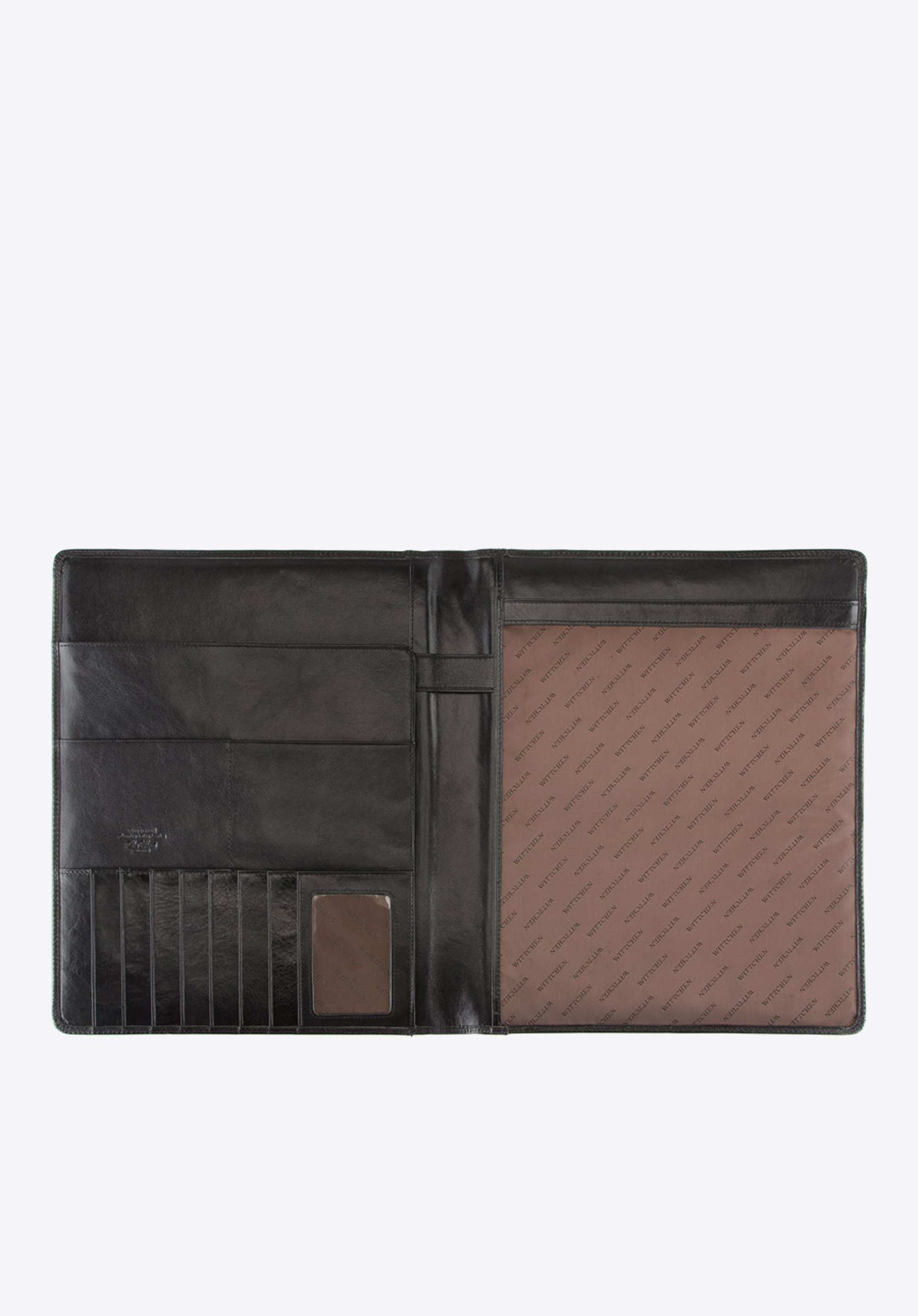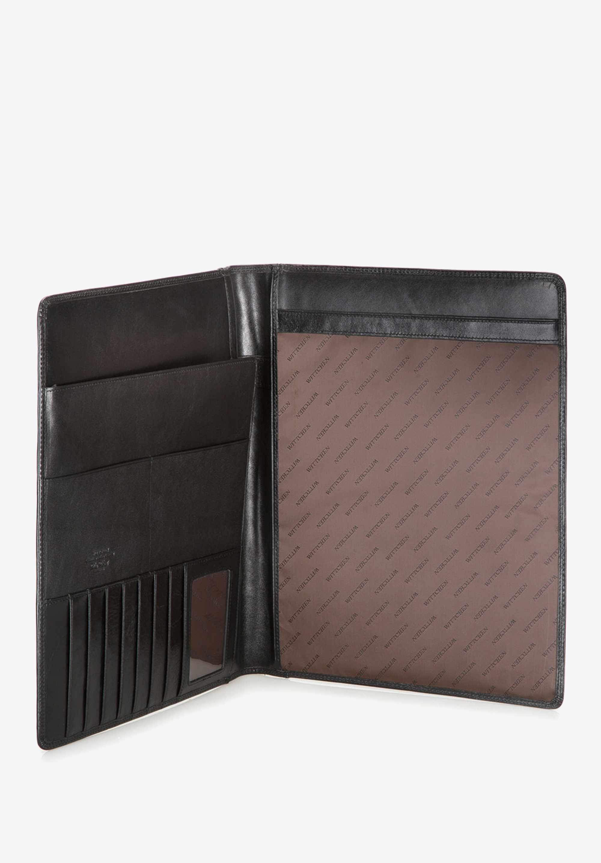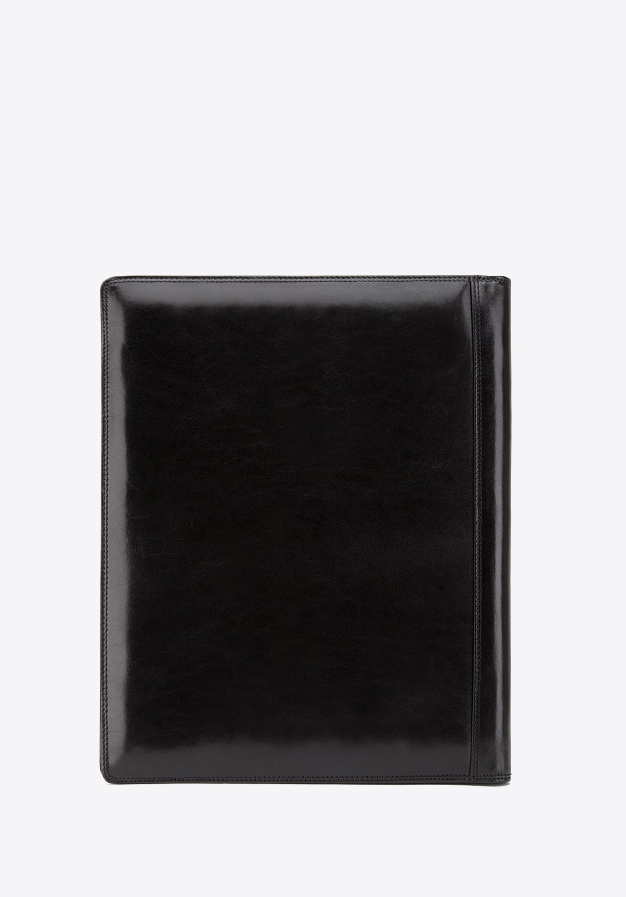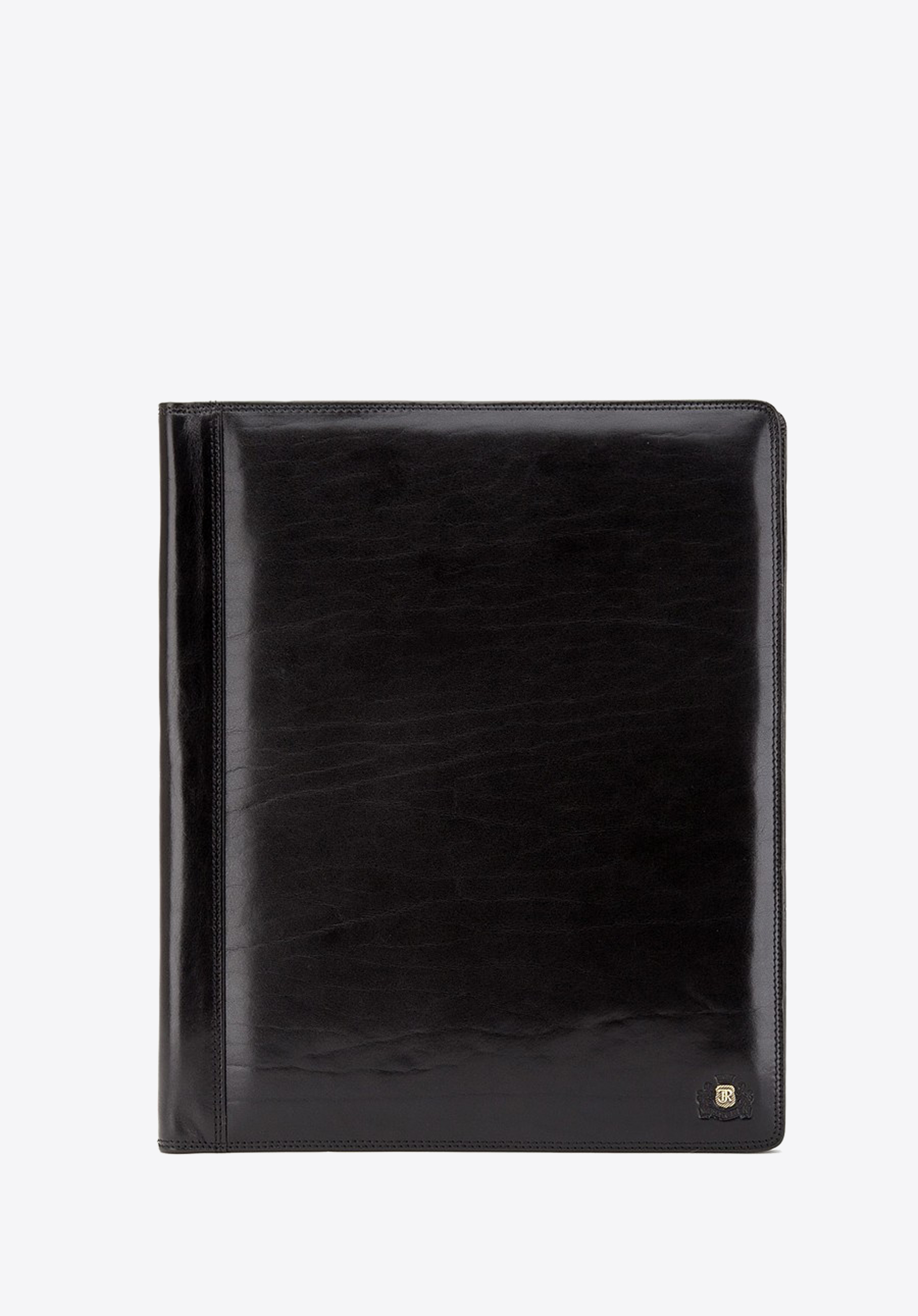 Elegancka aktówka wykonana ręcznie z najwyższej jakości skóry cielęcej to model, który wyróżnia się elegancją i luksusowym wykończeniem. Z przodu posiada widoczne logo - inicjały ozdobione tarczą w kolorze złotym na wytłoczonym herbie. Aktówka pomieści dokumenty w formacie A4.