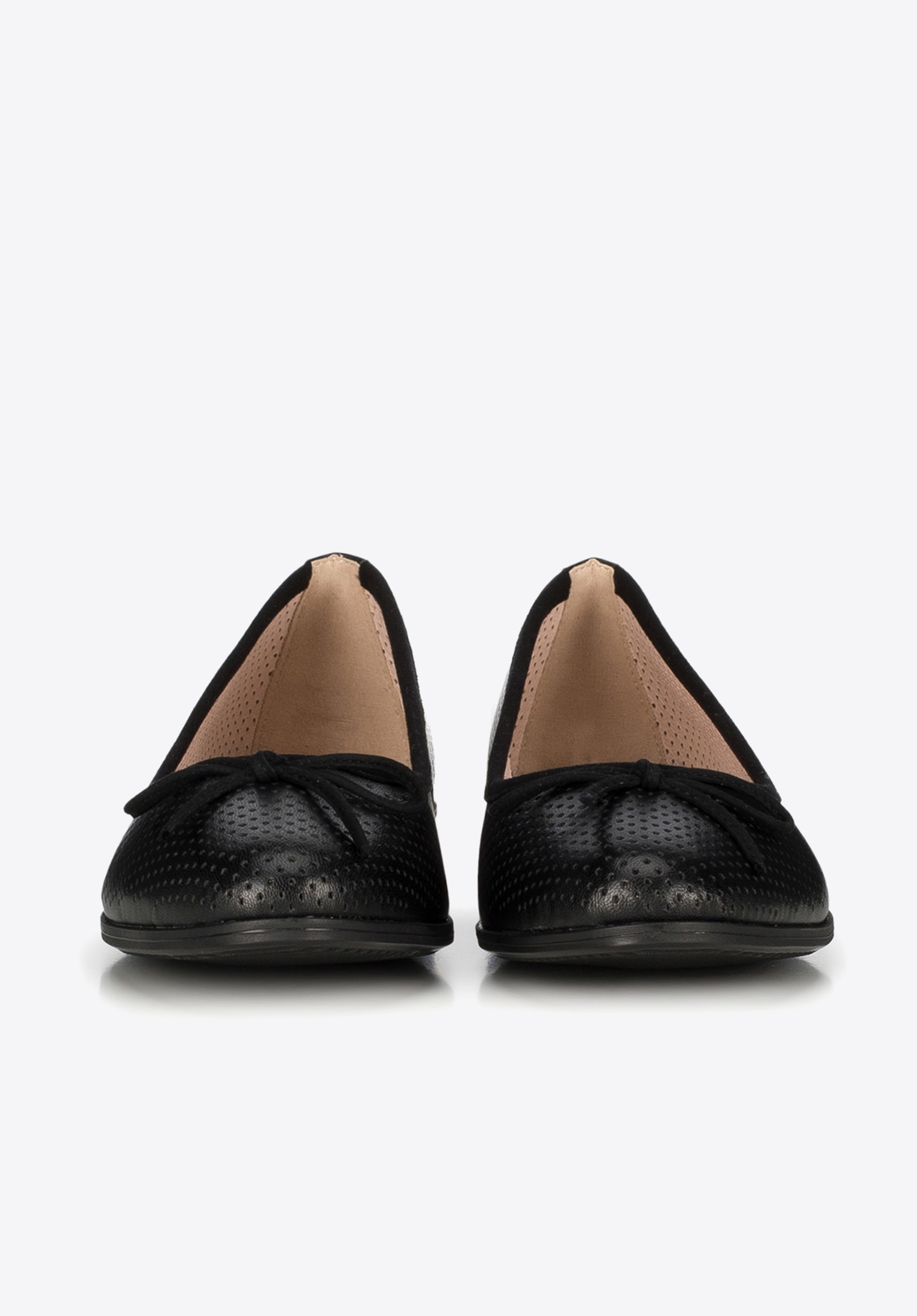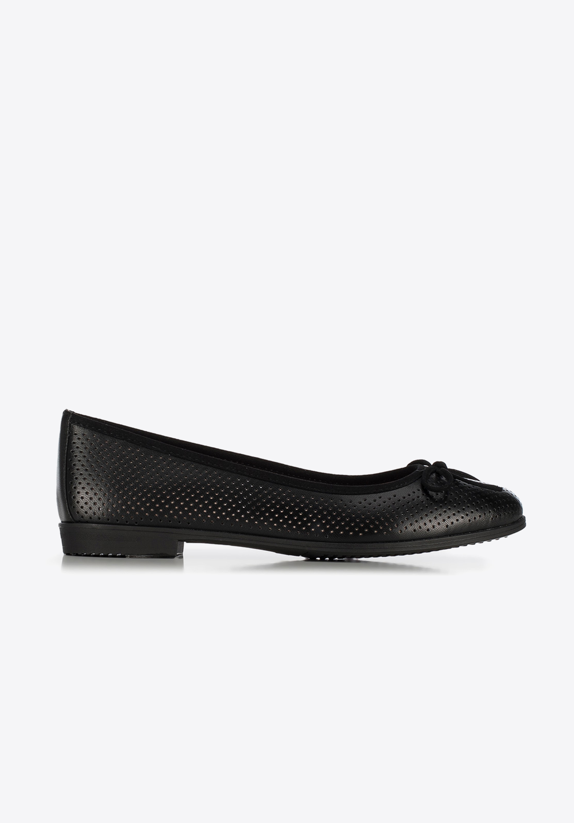 Baleriny z kokardką to świetny wybór na każdy dzień. Buty pokryte punktowym dziurkowaniem są przewiewne i zapewniają komfort użytkowania w czasie upalnych dni. Dopracowana stylistyka z nubukowymi akcentami podkreśli szykowny image użytkowniczki modelu.