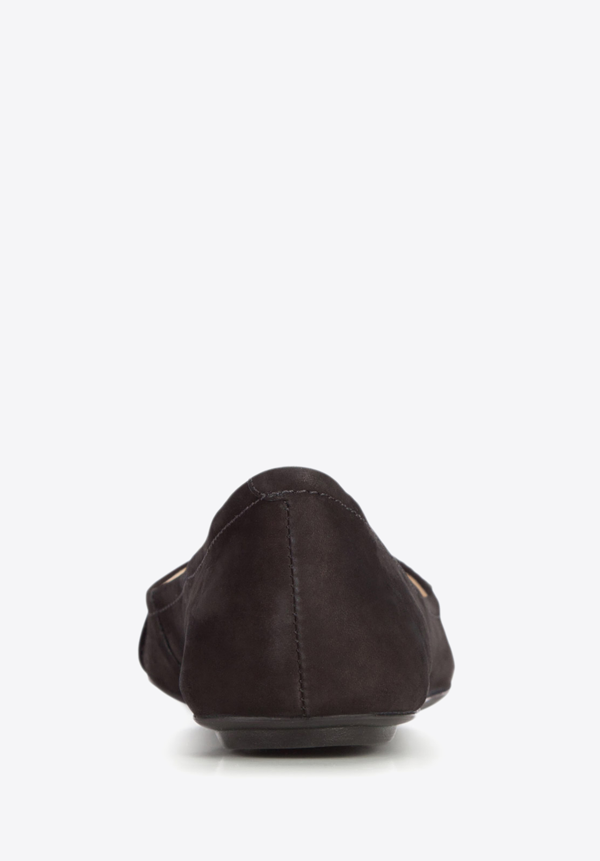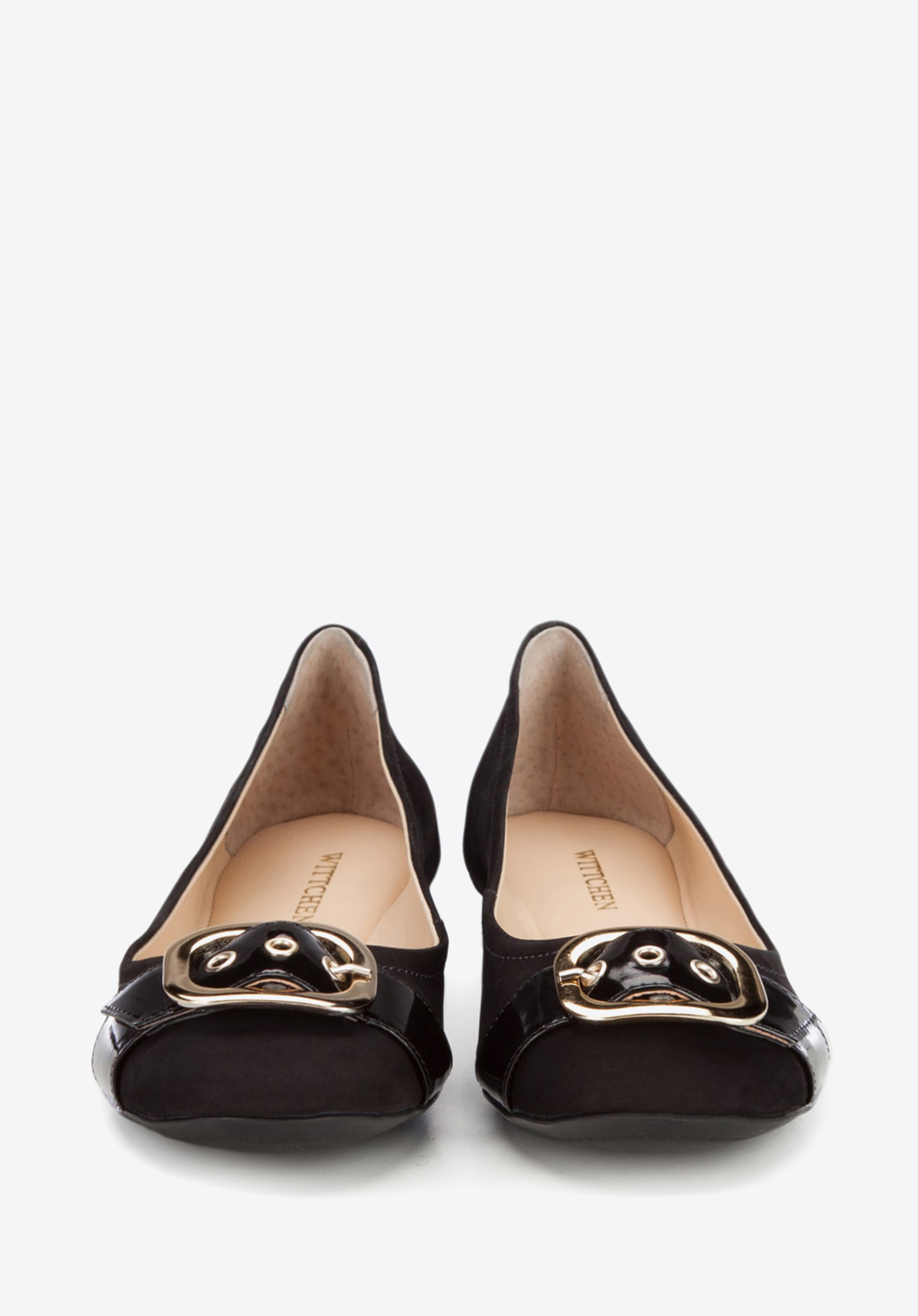 Skórzane balerinki wykonane ręcznie z dbałością o każdy detal. Prosty, klasyczny krój buta urozmaica ozdoba na nosku - czarna nubukowa skóra stała się doskonałym tłem dla ozdobnego lakierowanego paska wykończonego dużą klamrą w kolorze żółtego złota.