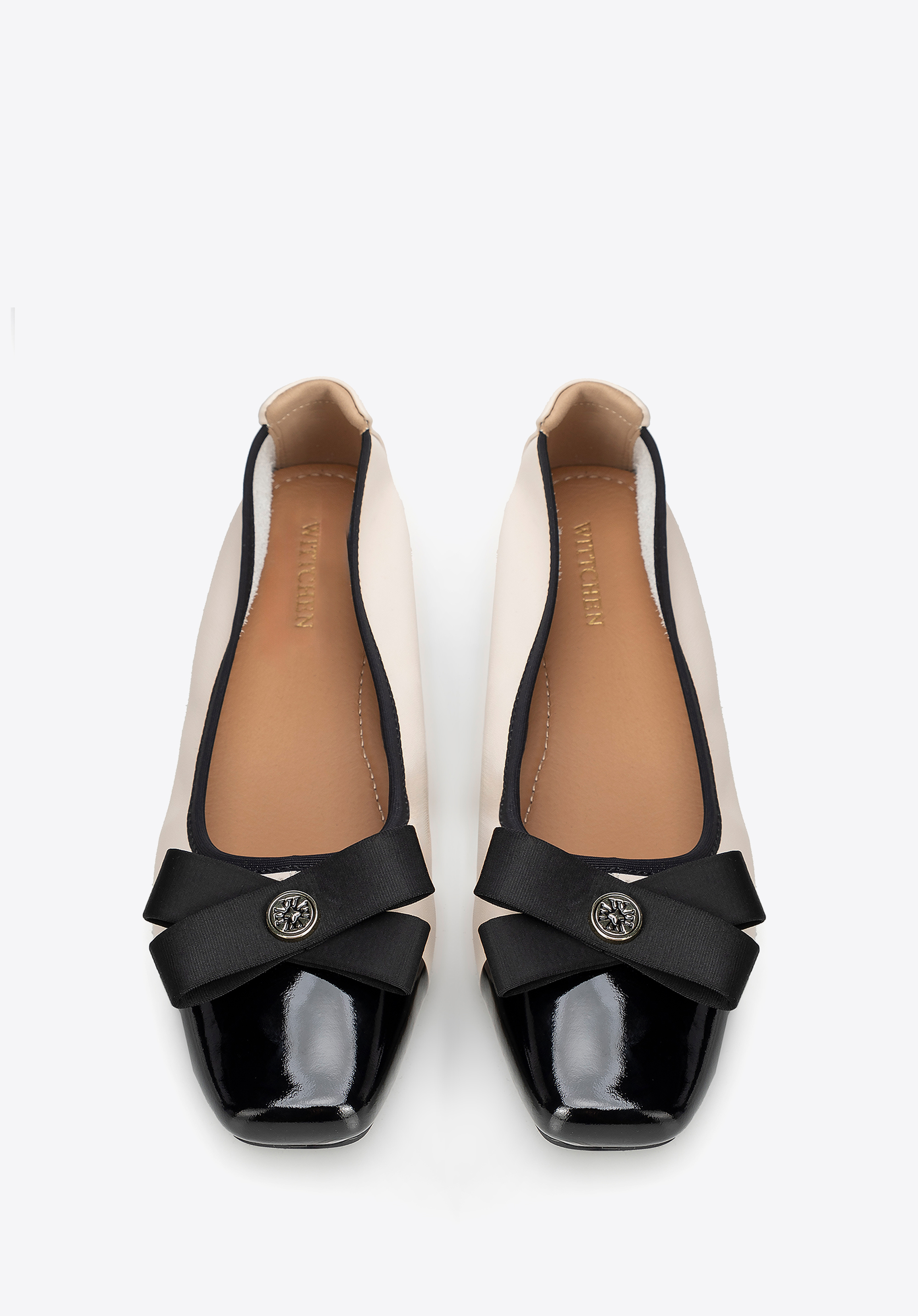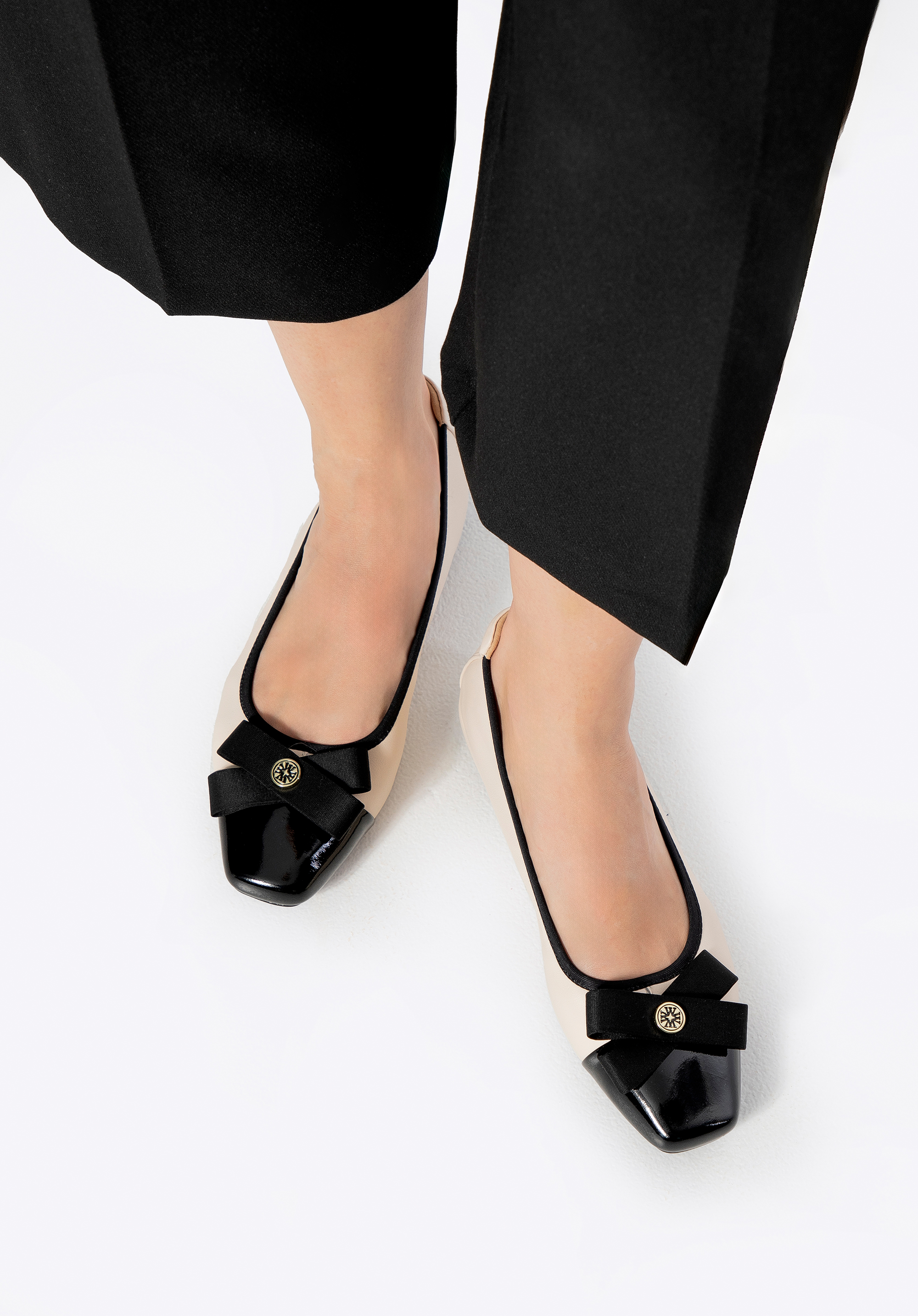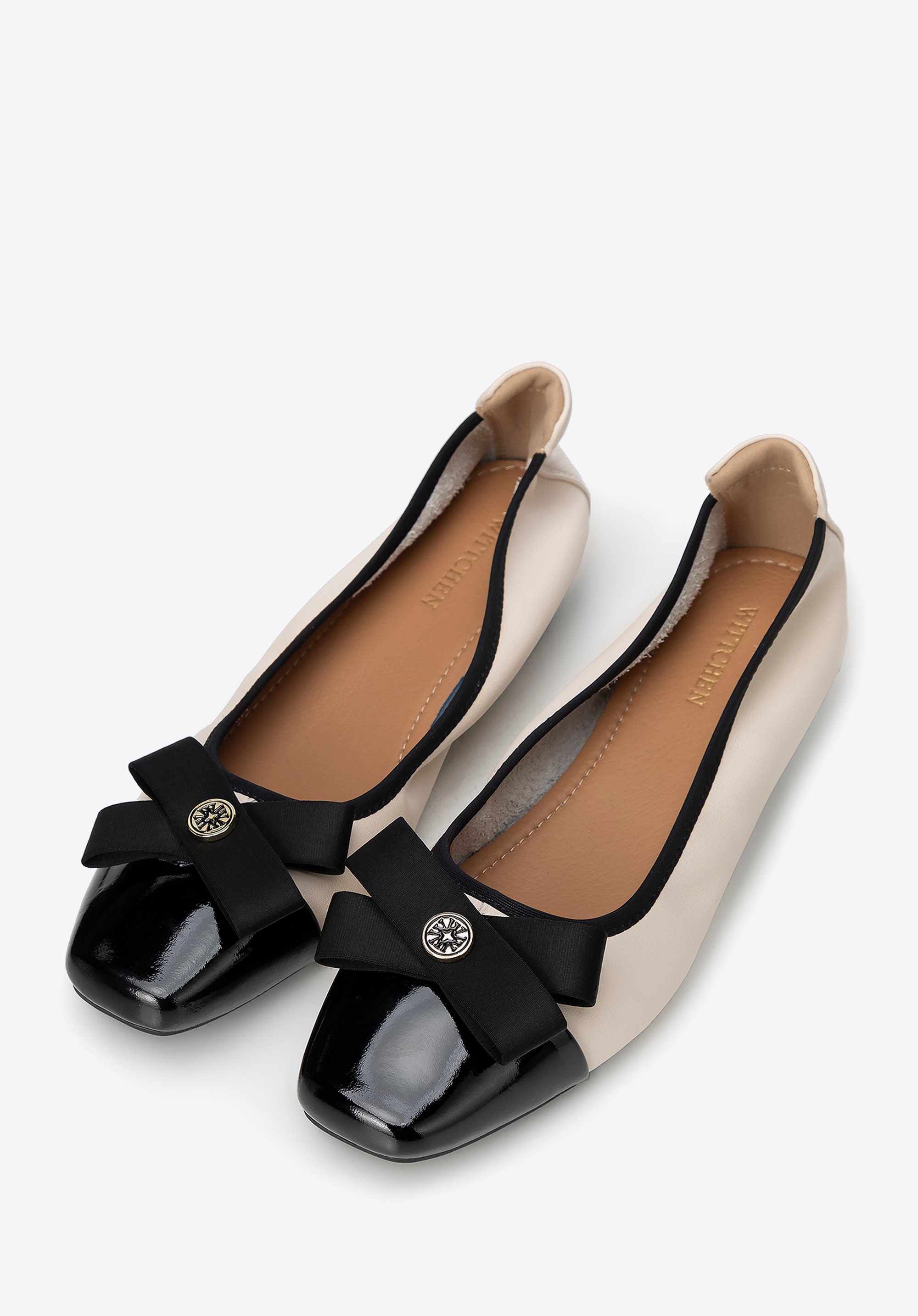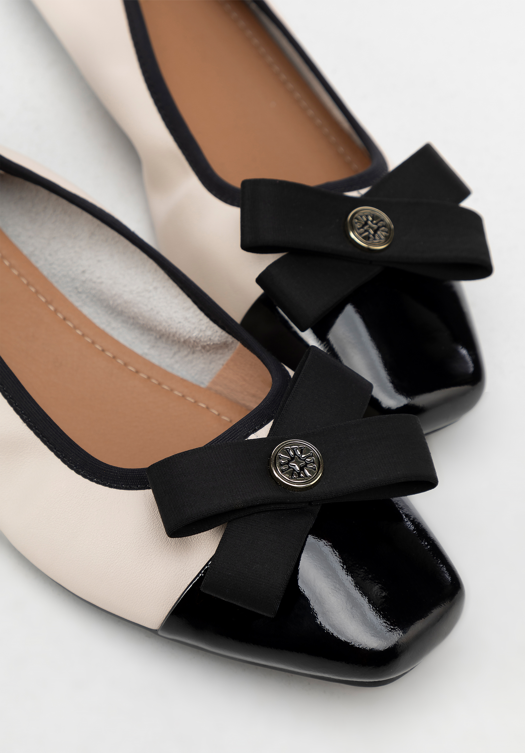 Stylowe baleriny ze skóry naturalnej to klasyka z nowoczesnym akcentem. Miękka wkładka ze skóry i wyściółka z ekoskóry gwarantują komfort przez cały dzień. Kwadratowy nosek nadaje elegancji, a kokarda ze złotym logo producenta podkreśla luksusowy charakter. Połączenie matowej i lakierowanej skóry dodaje butom wyjątkowego stylu.