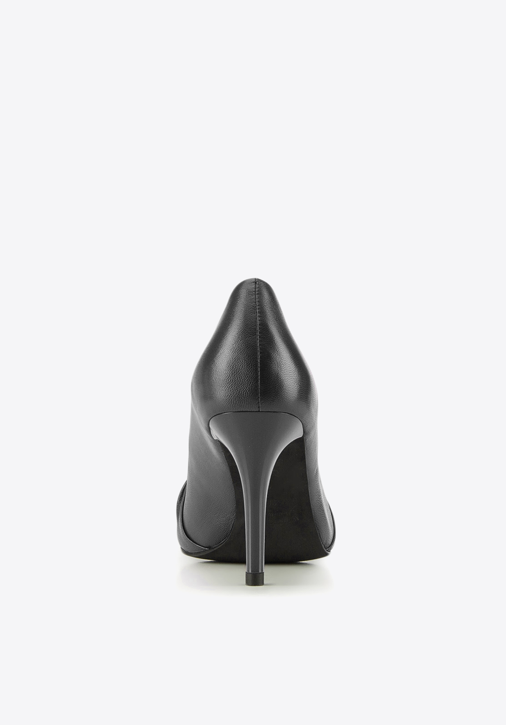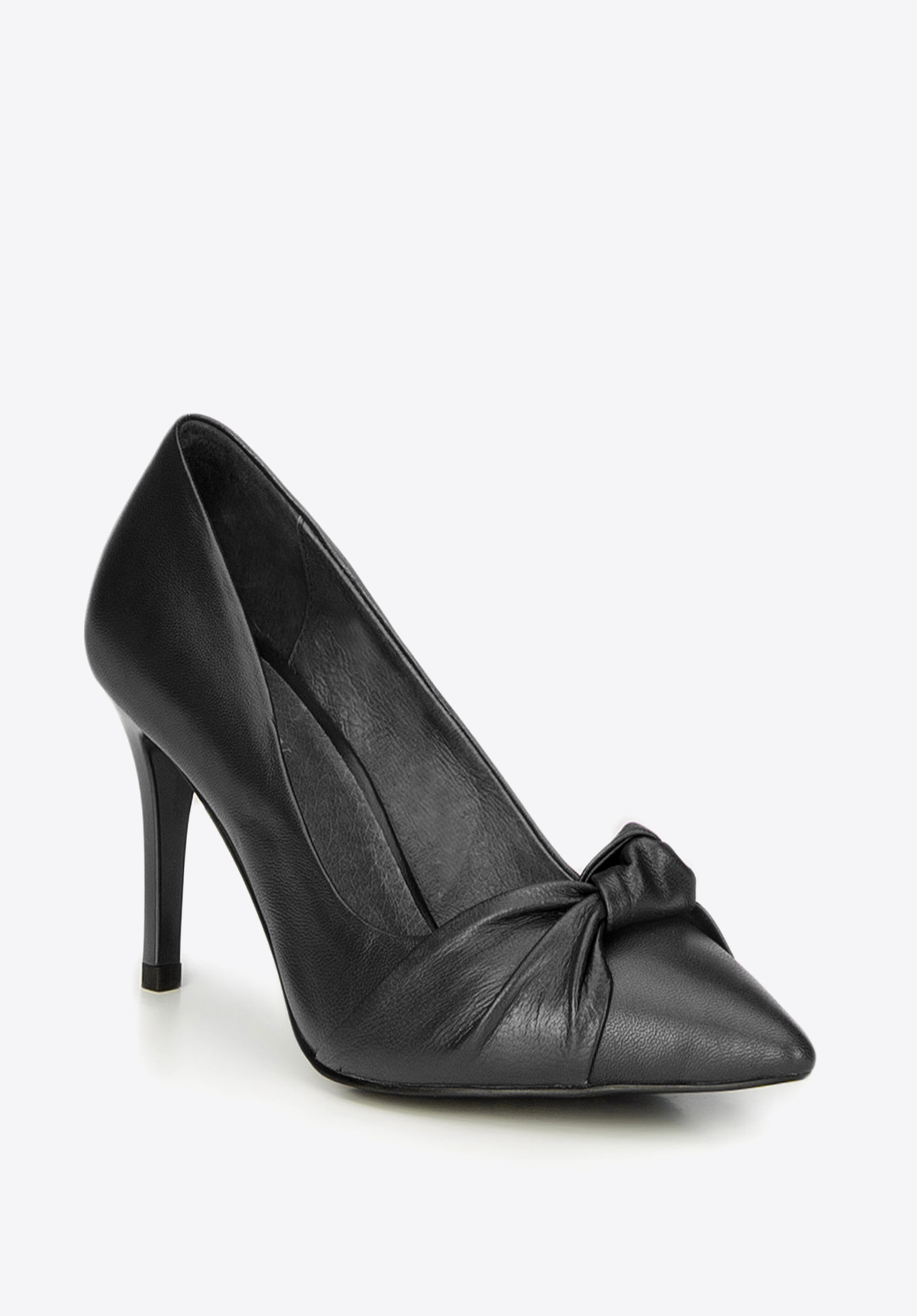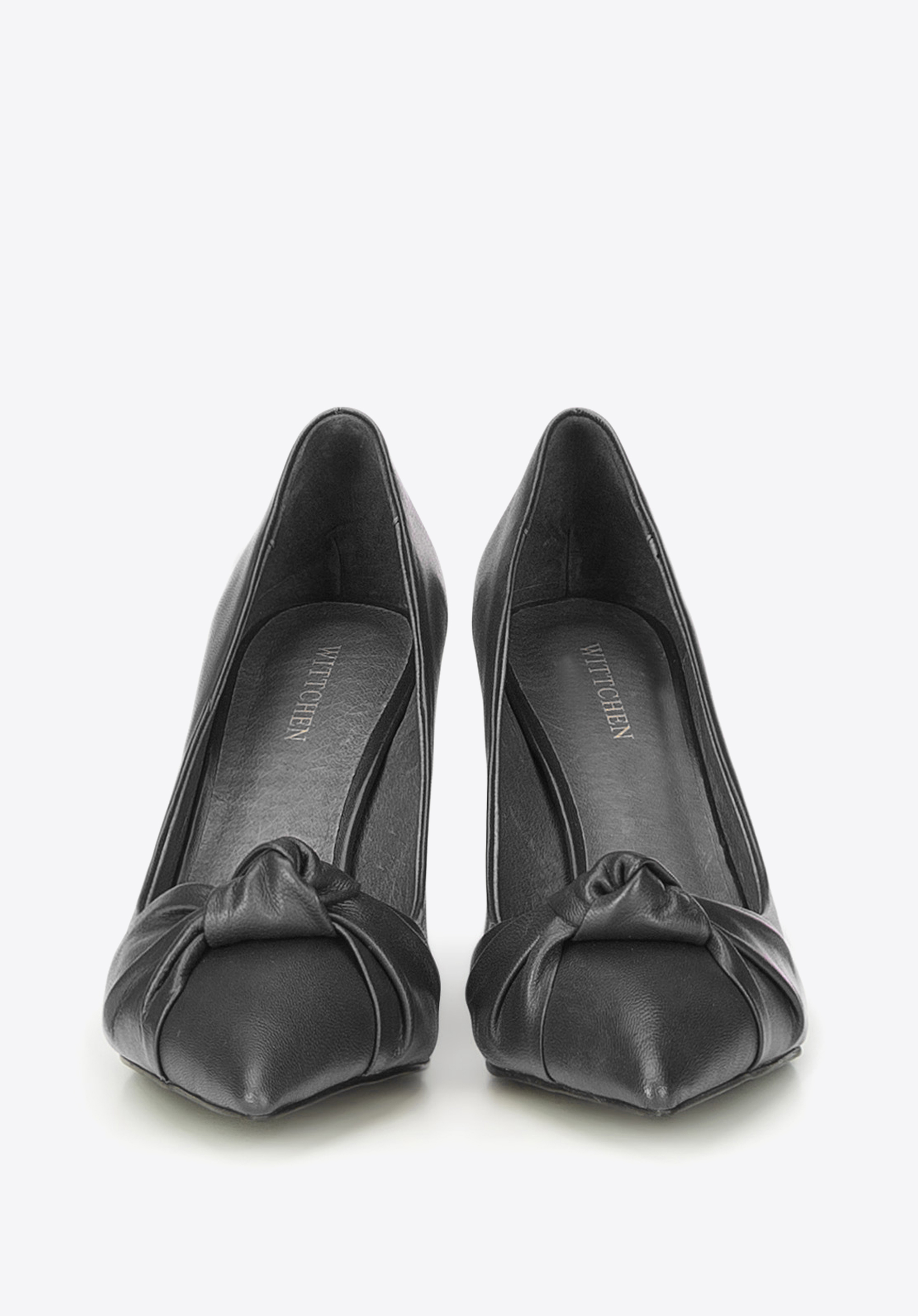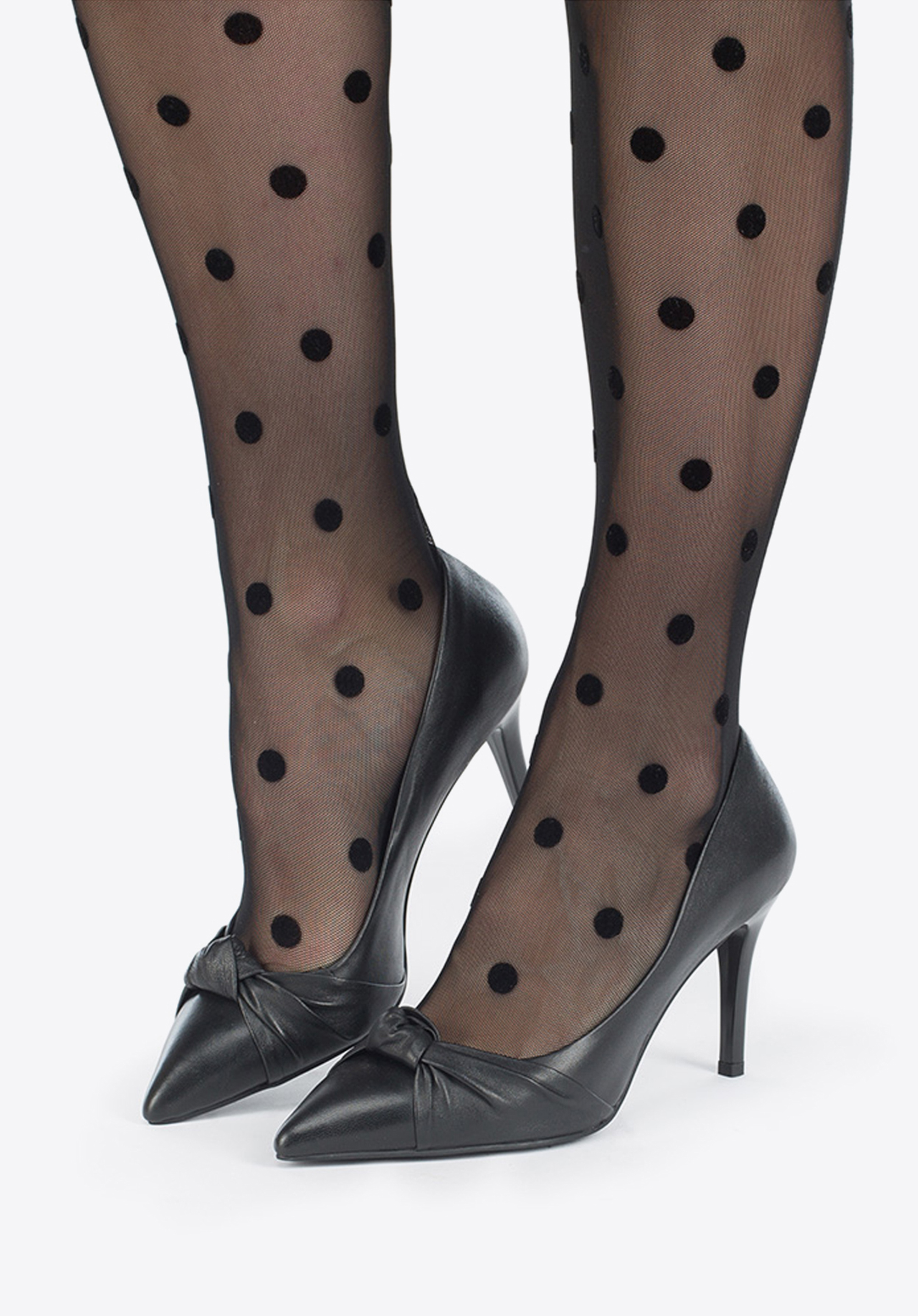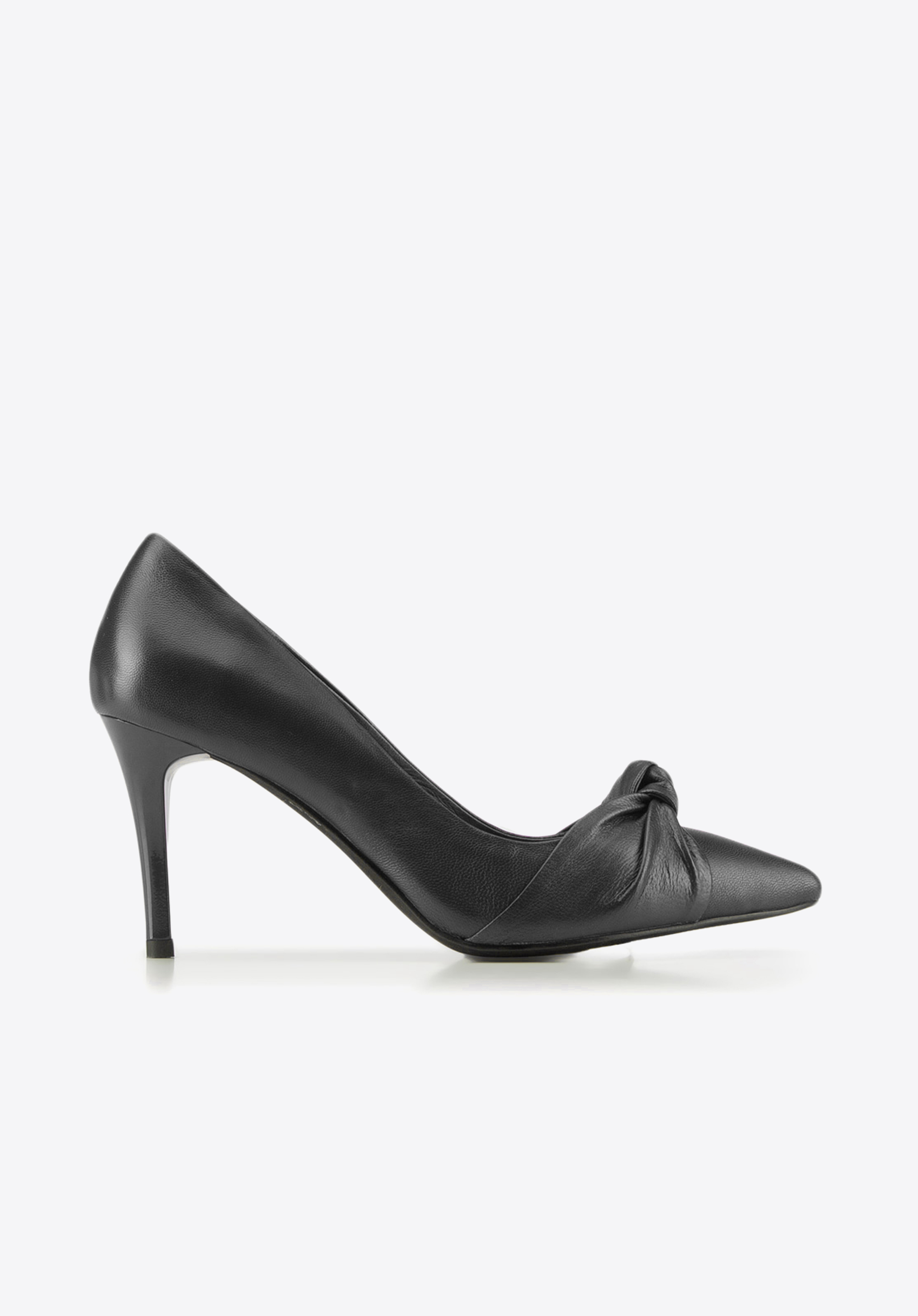 skórzaną kokardą, która wieńczy centralną część buta zakończonego w szpic. Lakierowany obcas typu szpilka stanowi kontrast dla groszkowanej faktury skóry licowej.