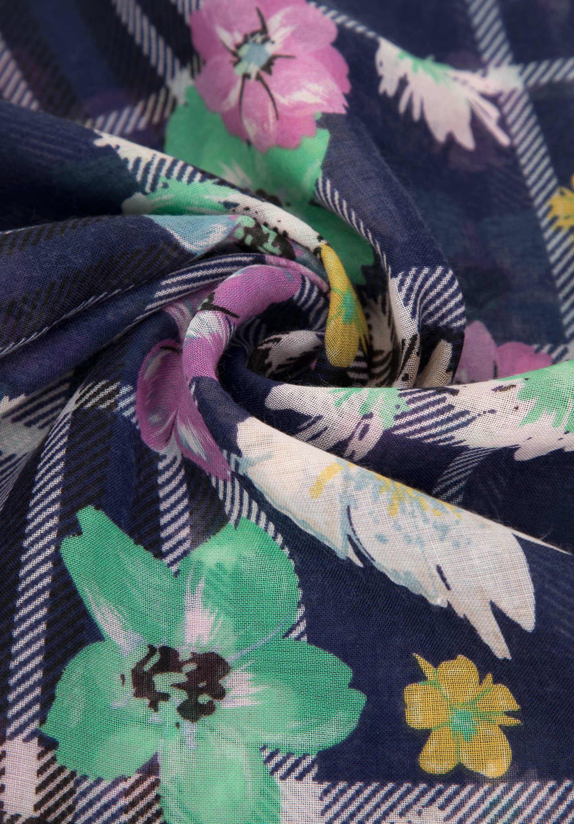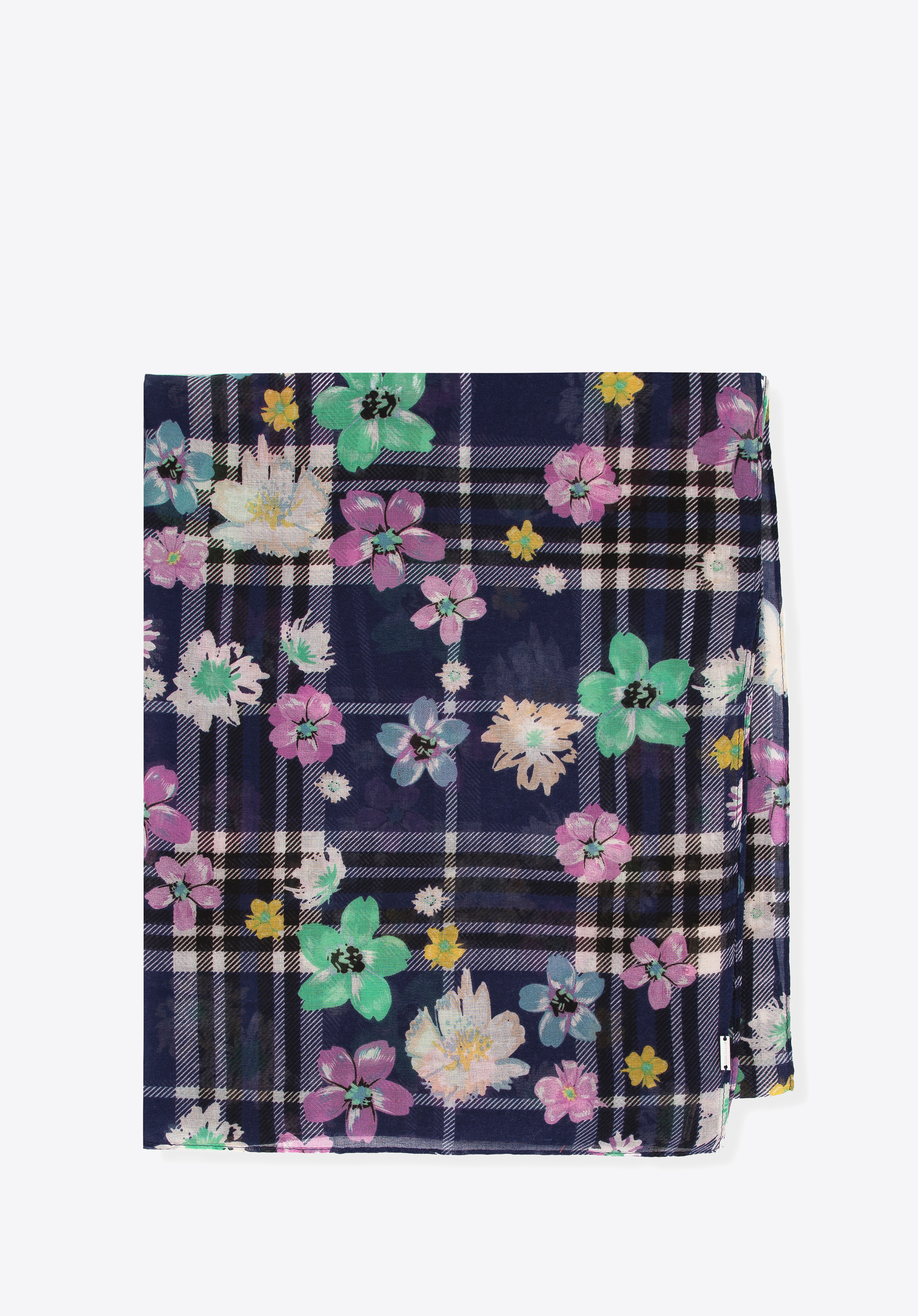 Ten ultraprzyjemny w dotyku i lekki szal to niezbędna ozdoba w garderobie każdej współczesnej i ciekawej modowych eksperymentów kobiety. Szal łączy w sobie dwa trendowe wzory: stylową kratę i kwiaty, tworząc jedną spójną efektowną całość. Dodatkowo harmonijna gra różnych barw i odcieni oraz wzorów tworzy fascynująco piękny oryginalny dodatek.