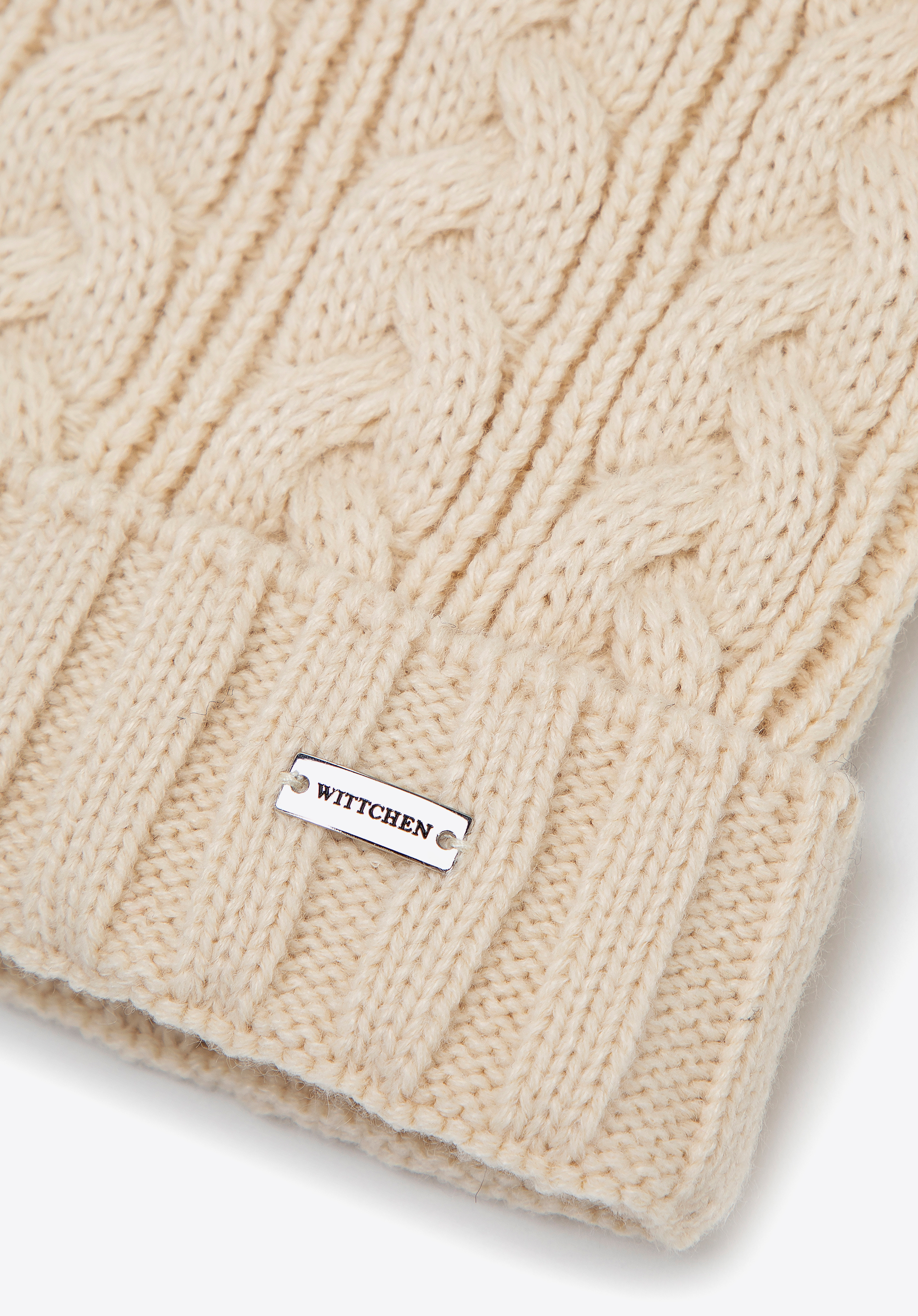 Czapka damska z warkoczowym splotem i pomponem jasnobeżowa