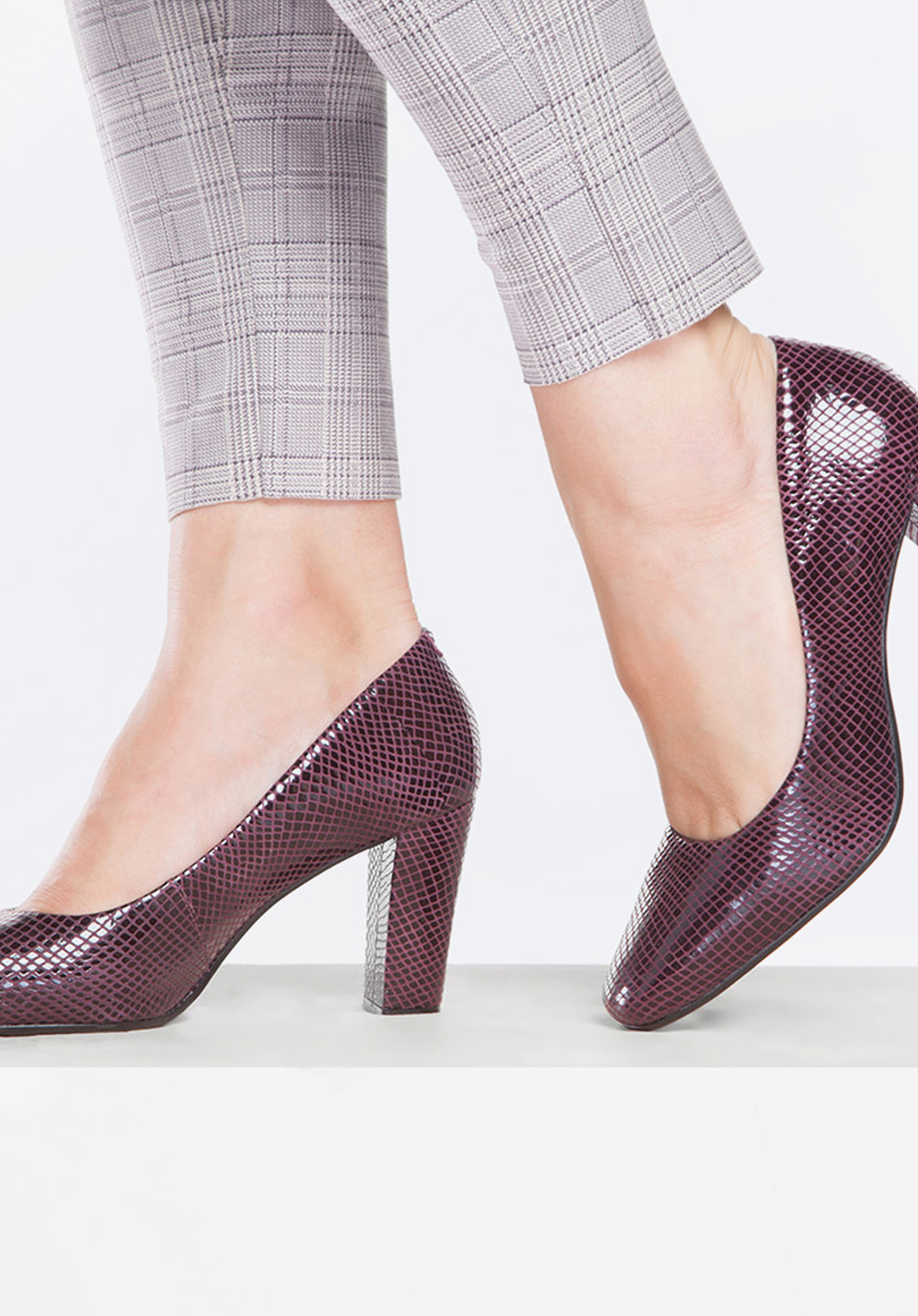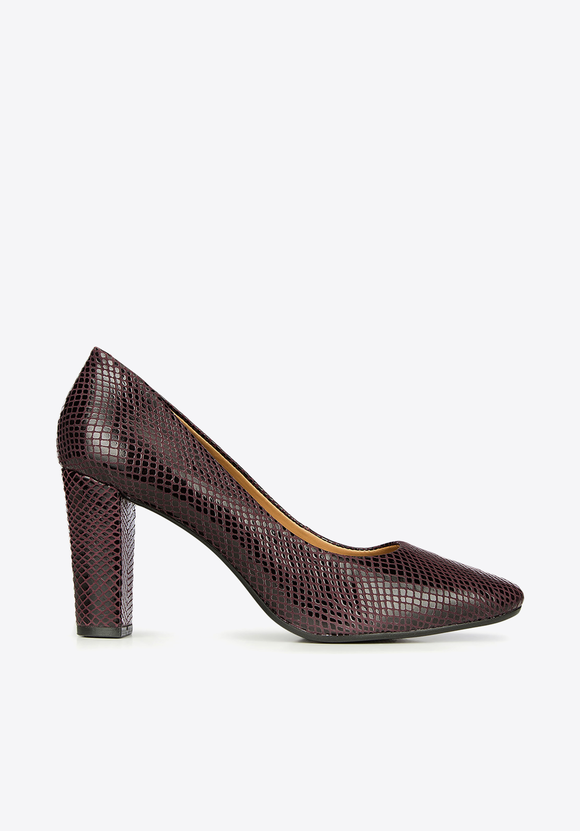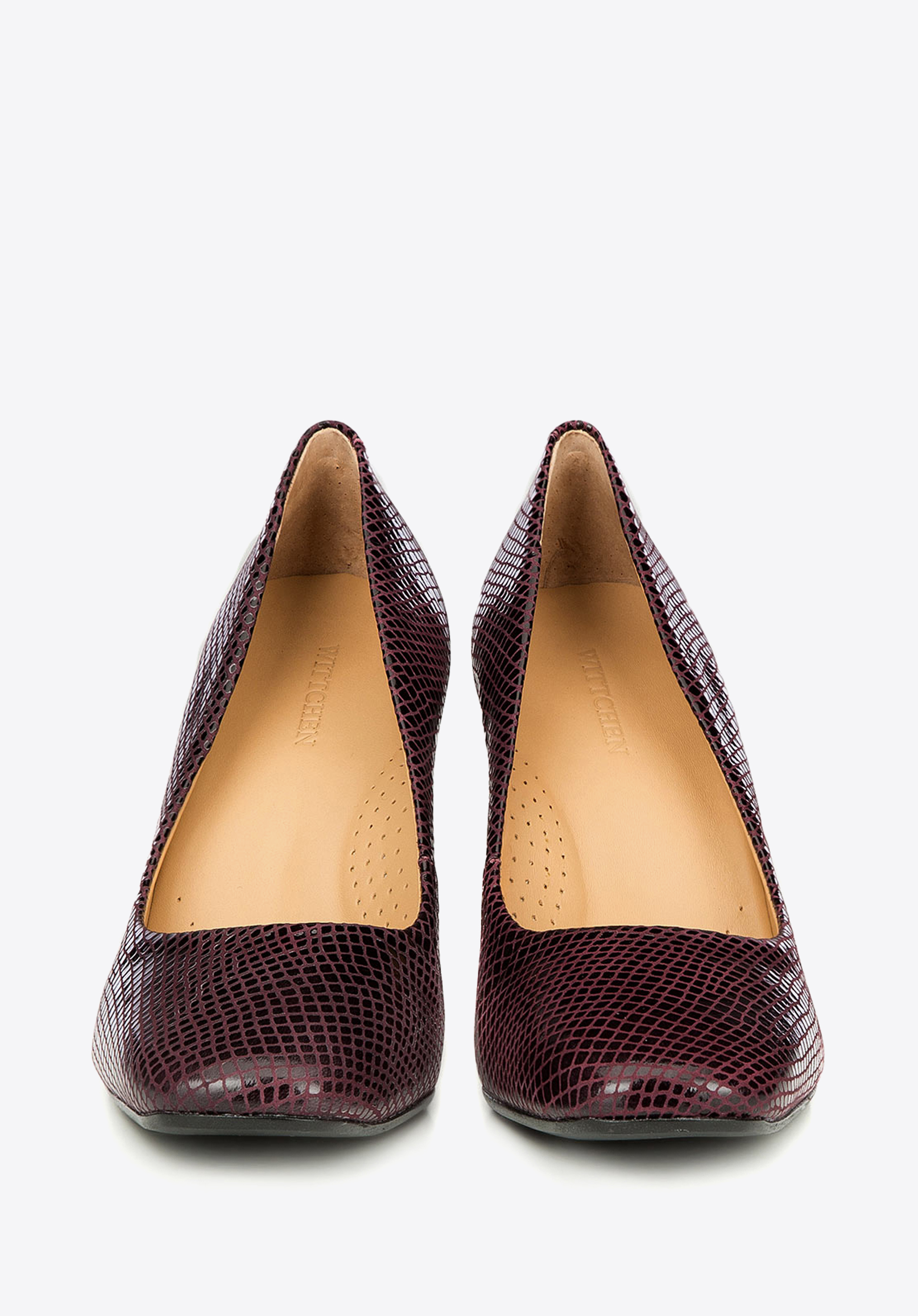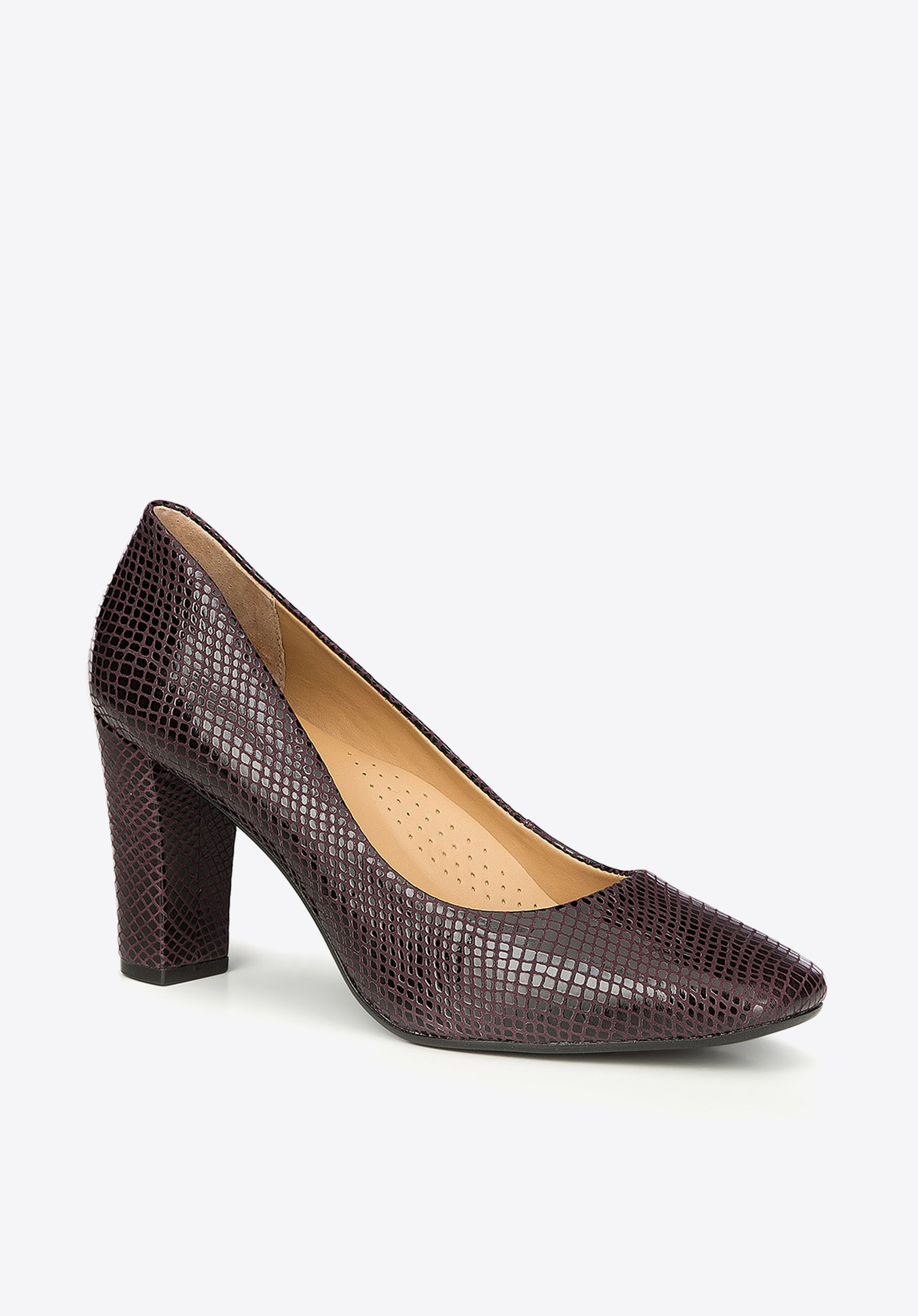 Klasyczne czółenka damskie o wyróżniającej się fakturowanej powierzchni imitującej skórę węża, całość w oryginalnym połączeniu czerni z fioletem. Najwyższa jakość naturalnej skóry, precyzyjne wykonanie z dbałością o detale oraz optymalnej wysokości słupek wpływają na wyjątkowy komfort użytkowania. Nasza rada: 9cm to optymalna wysokość obcasa dla komfortu stopy.