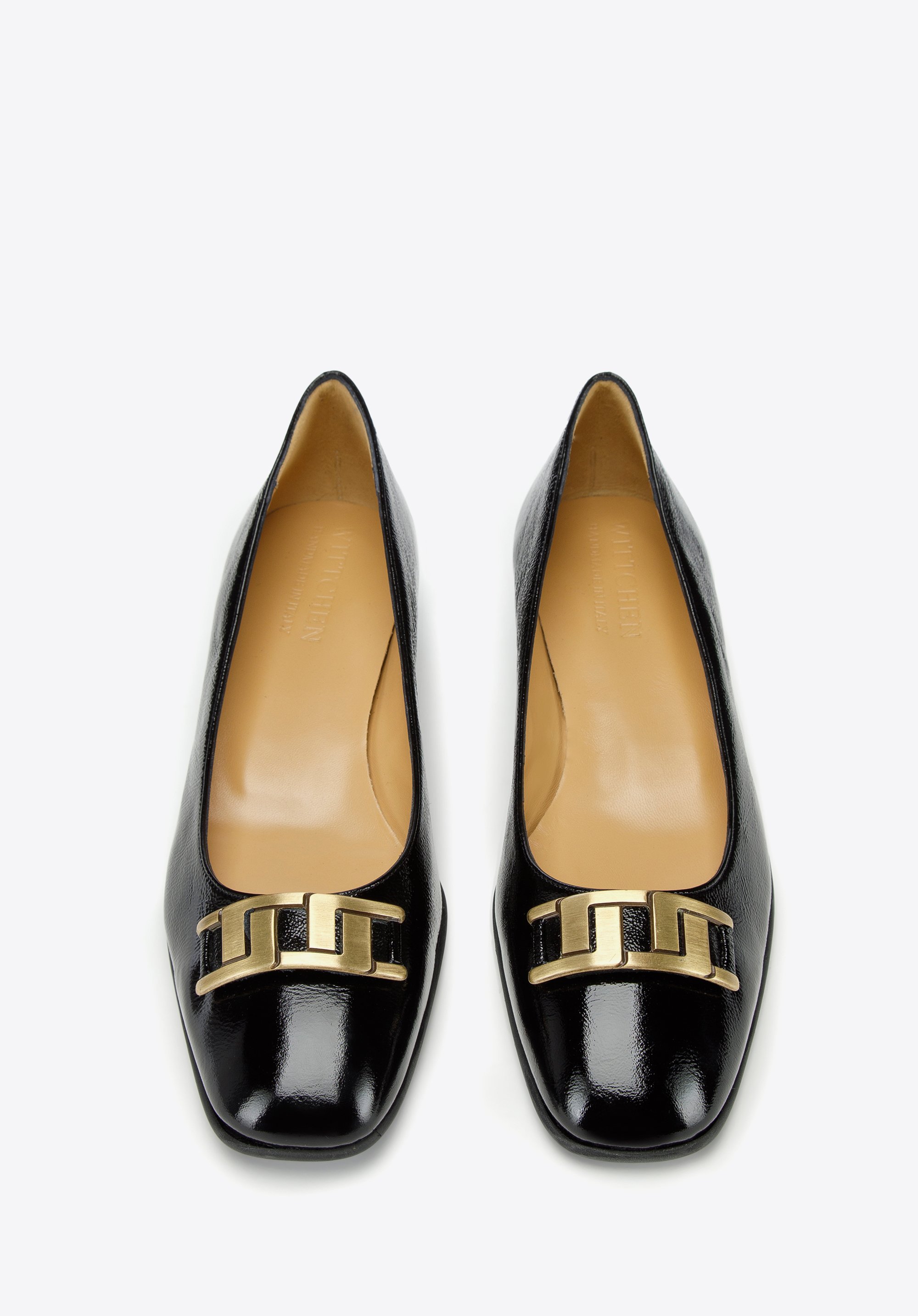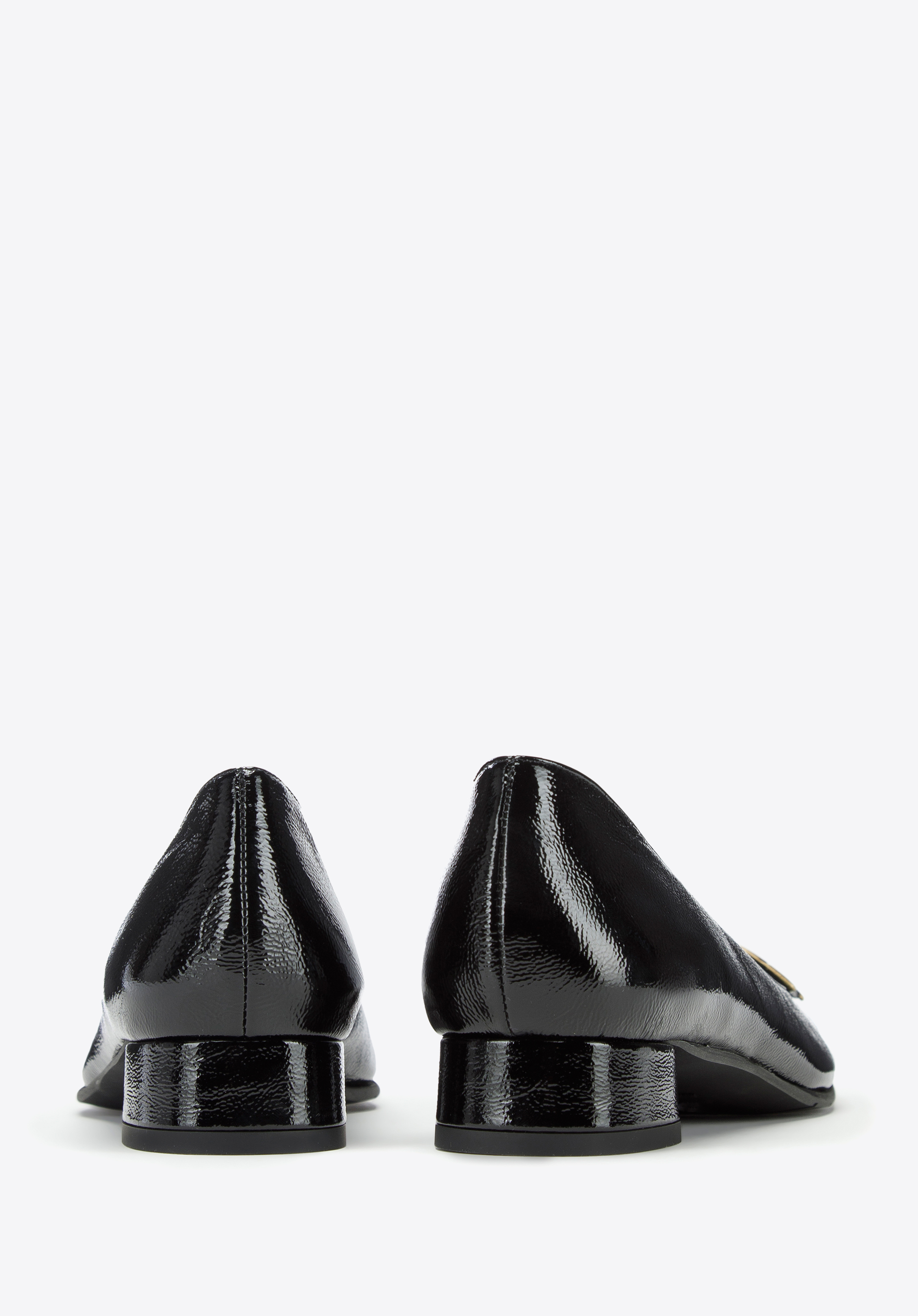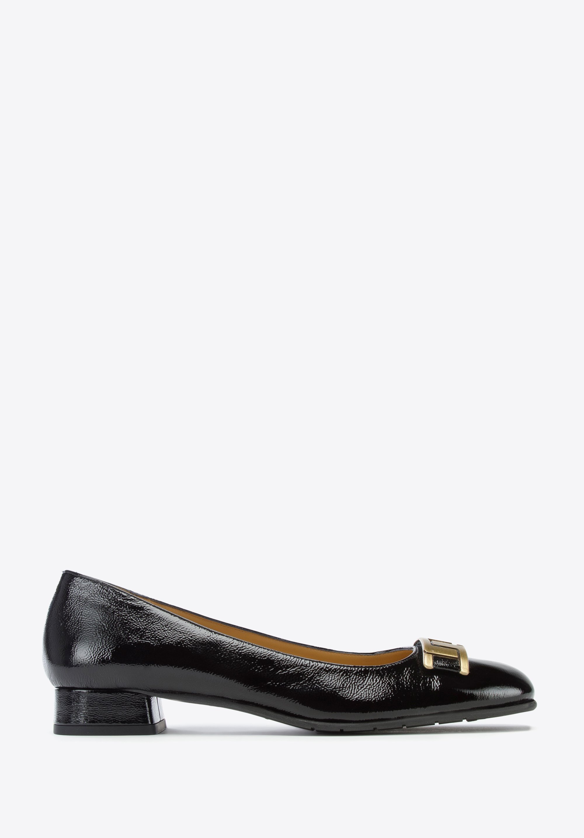 czółenka z lakierowanej skóry z geometryczną ozdobą to świetny wybór dla każdej kobiety lubiącej wygodne i stylowe dodatki.