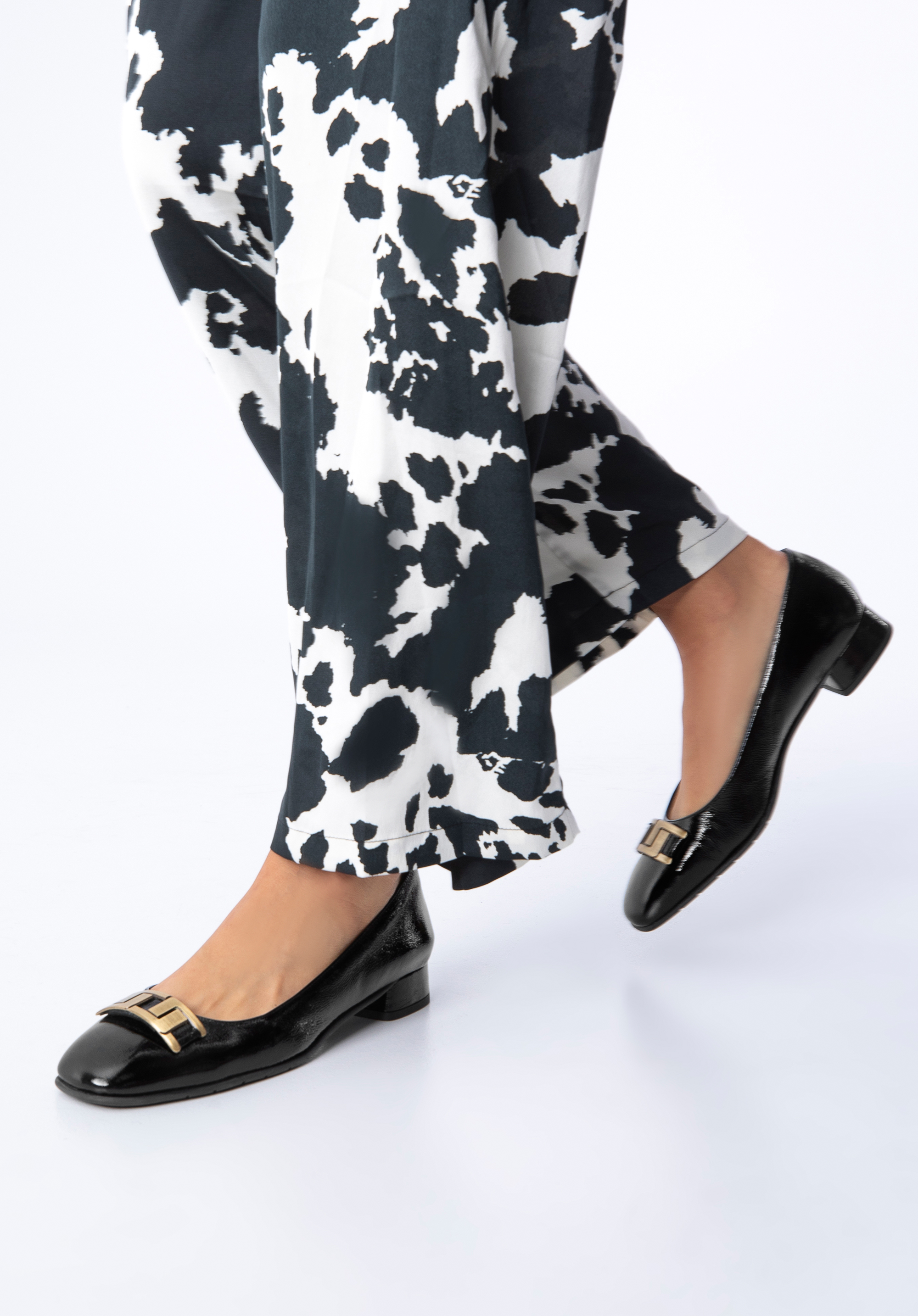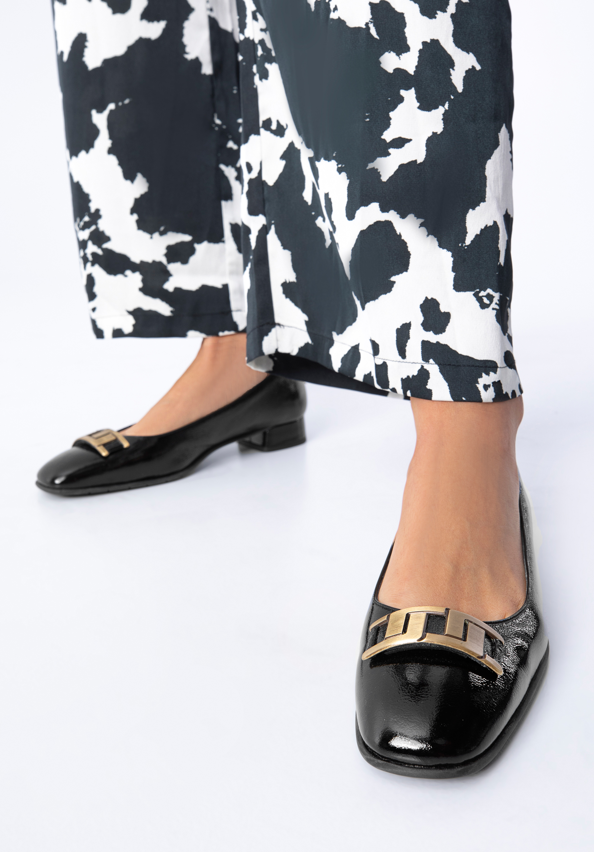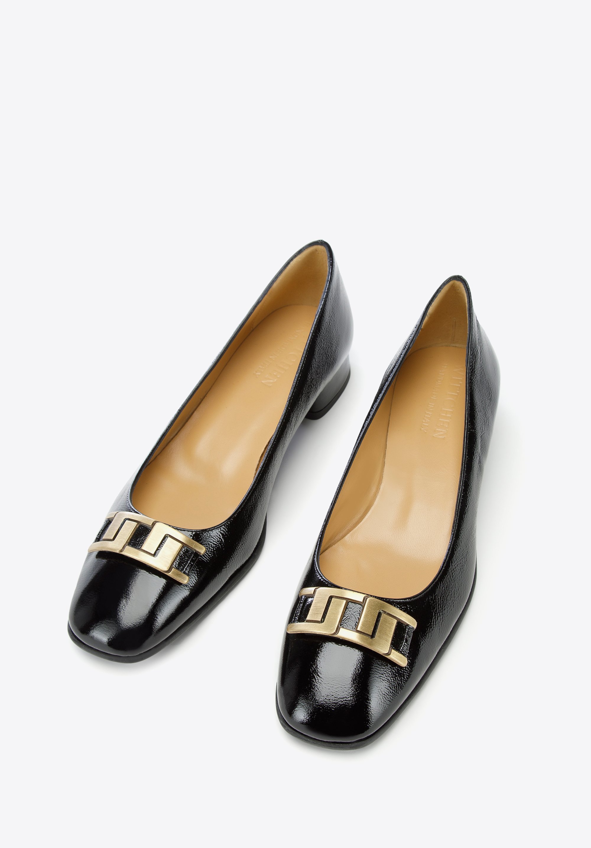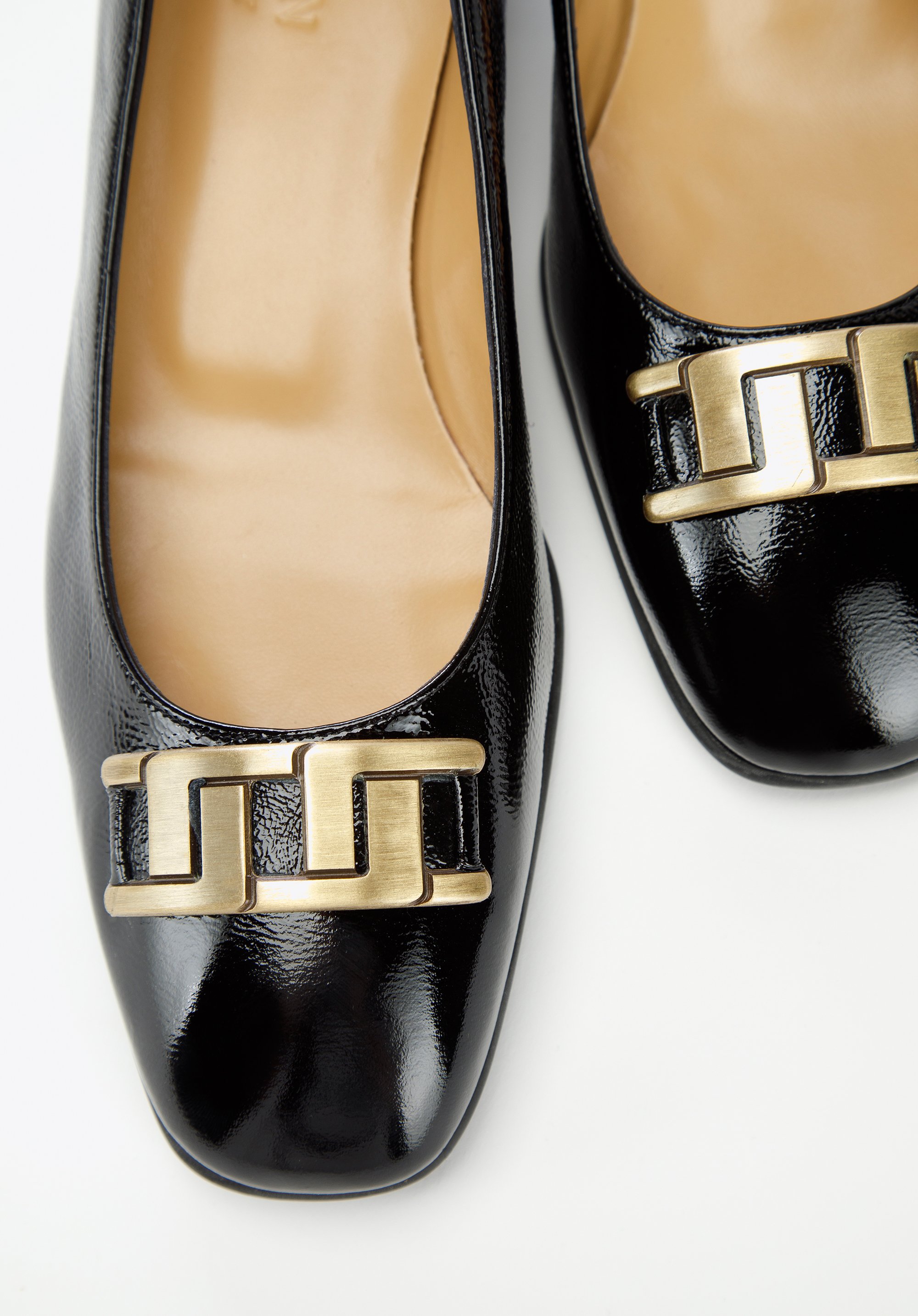 czółenka z lakierowanej skóry z geometryczną ozdobą to świetny wybór dla każdej kobiety lubiącej wygodne i stylowe dodatki.