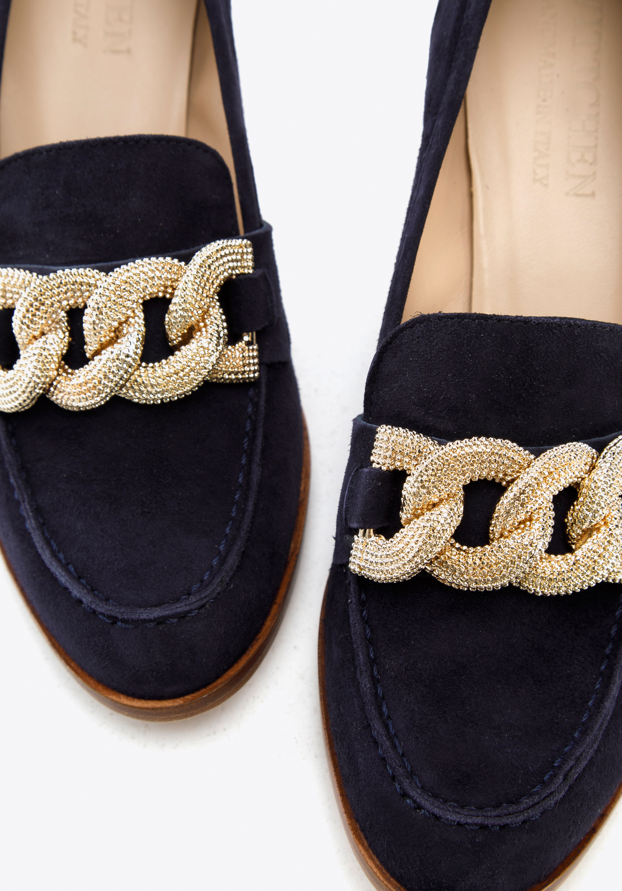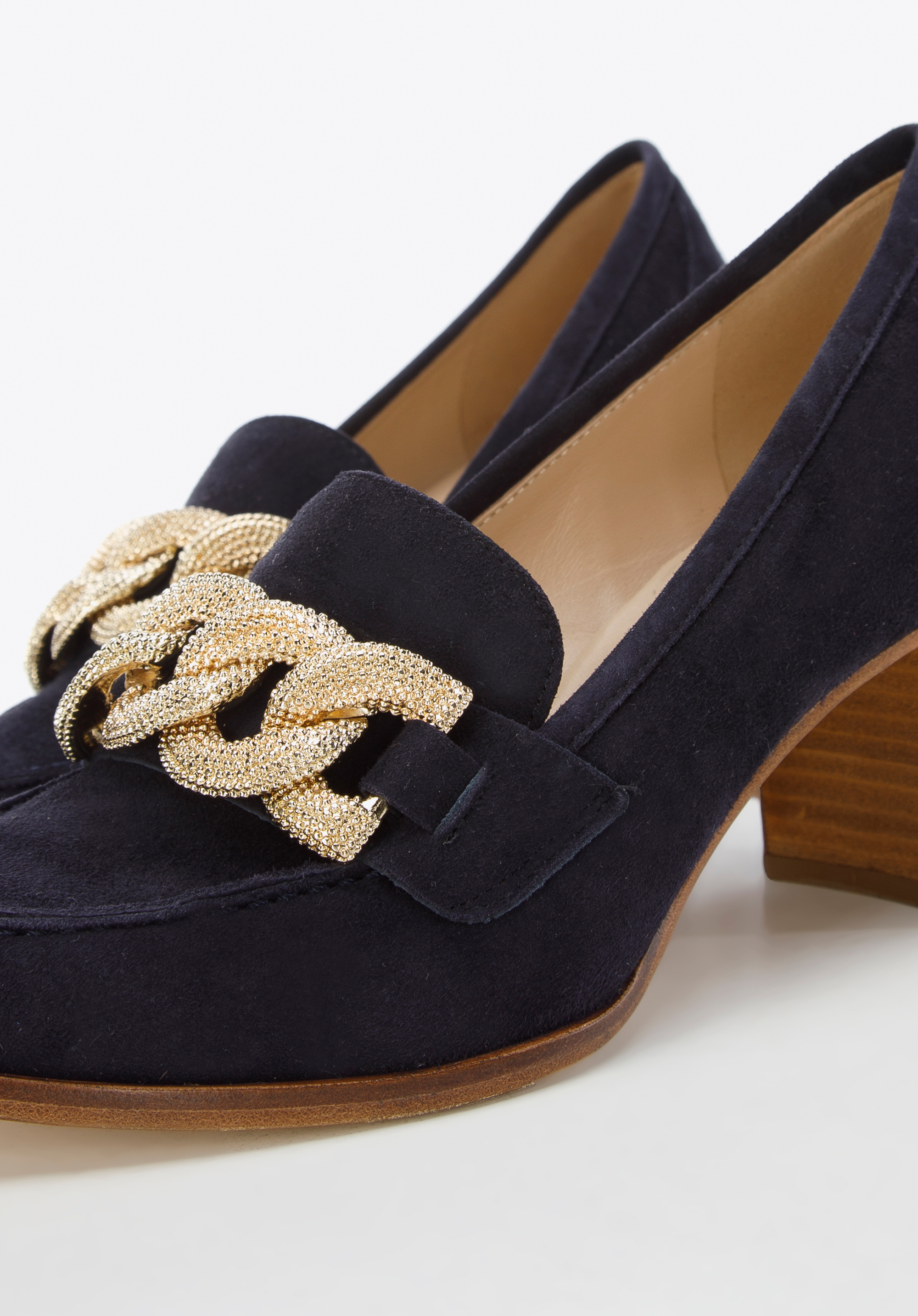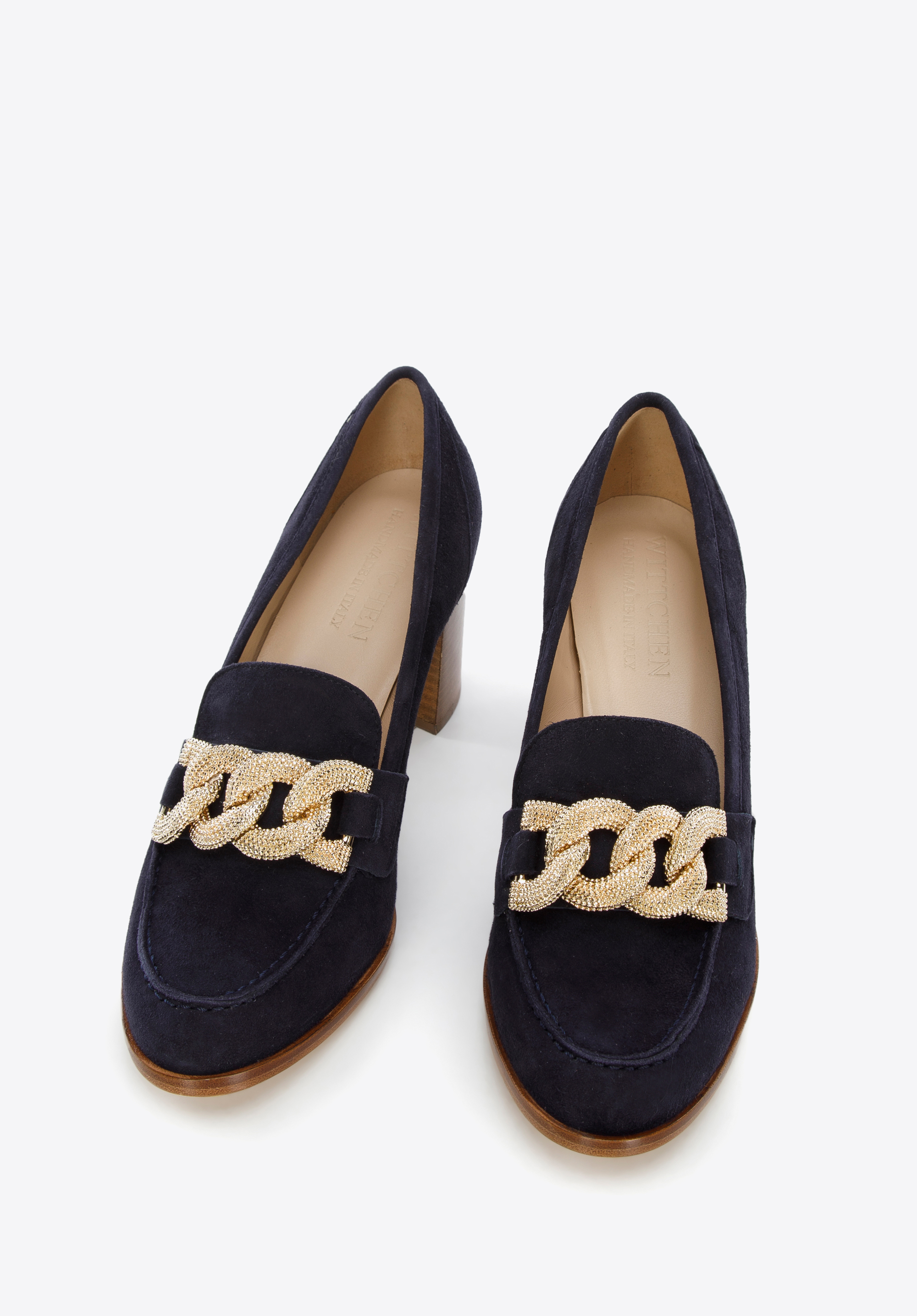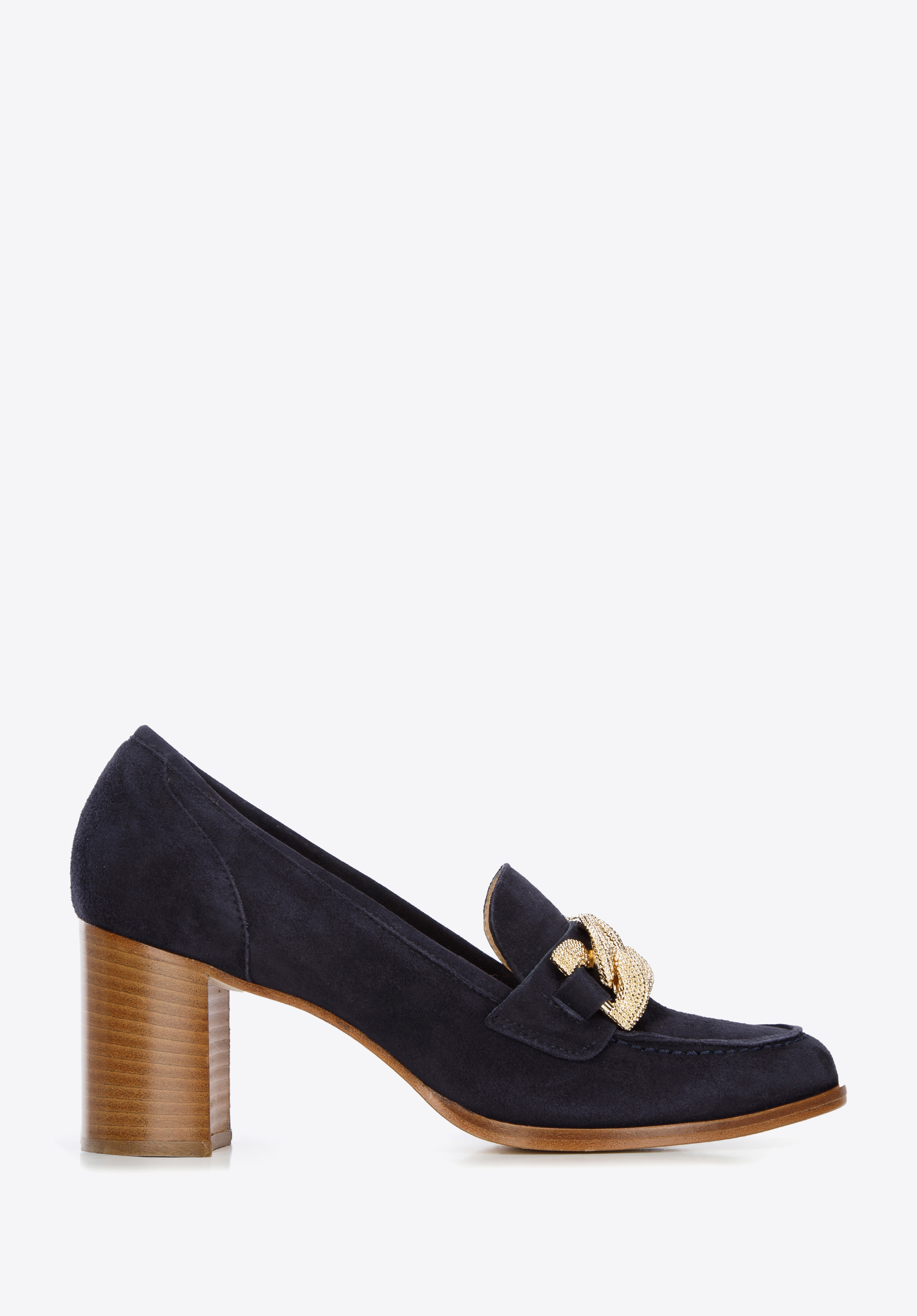 Czółenka zamszowe z ozdobnym łańcuchem stylowo dopełni i ulubioną sukienkę z kołnierzykiem, i szerokie spodnie i koszulę. To ponadczasowy dodatek, który warto mieć w swojej szafie.
