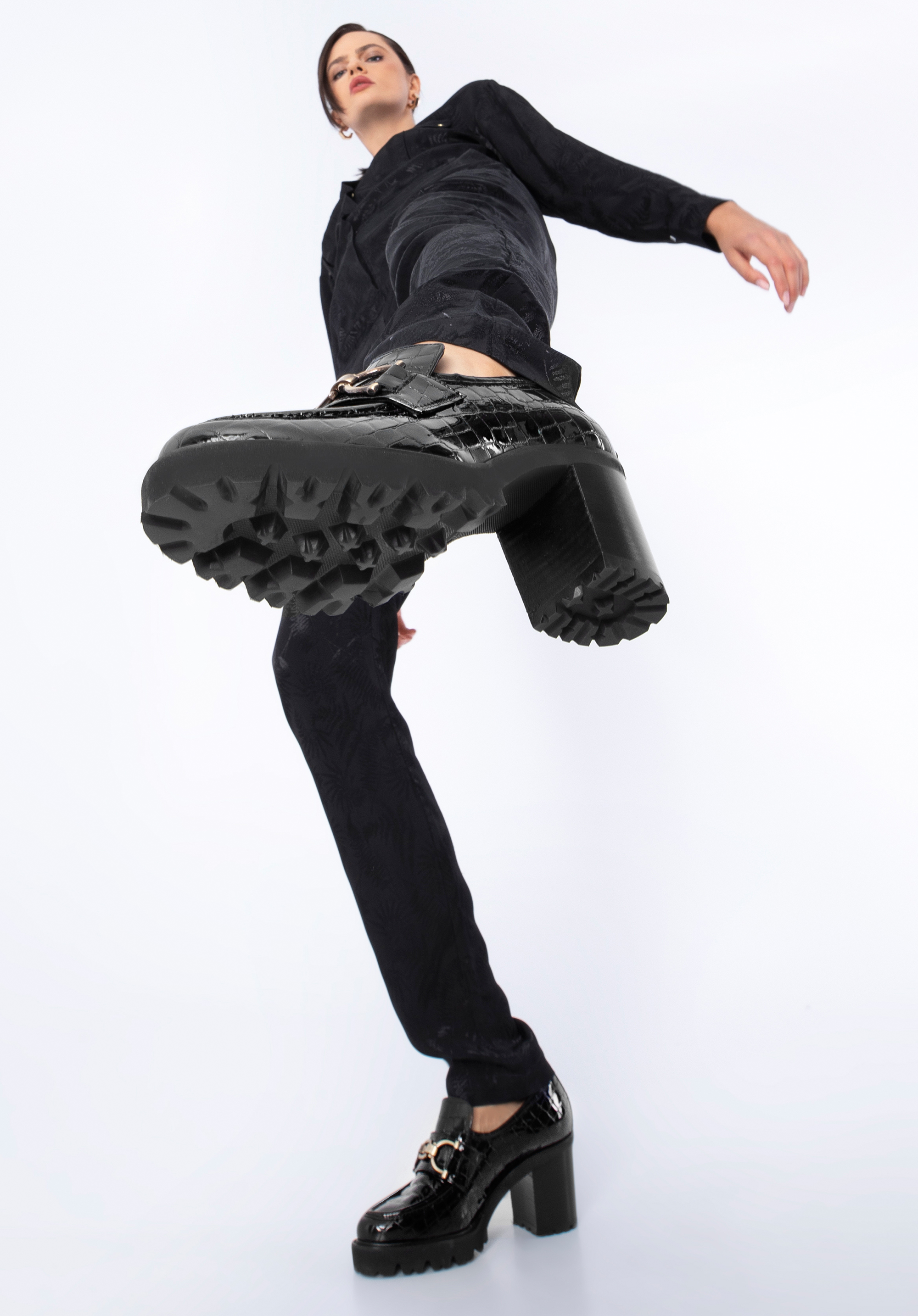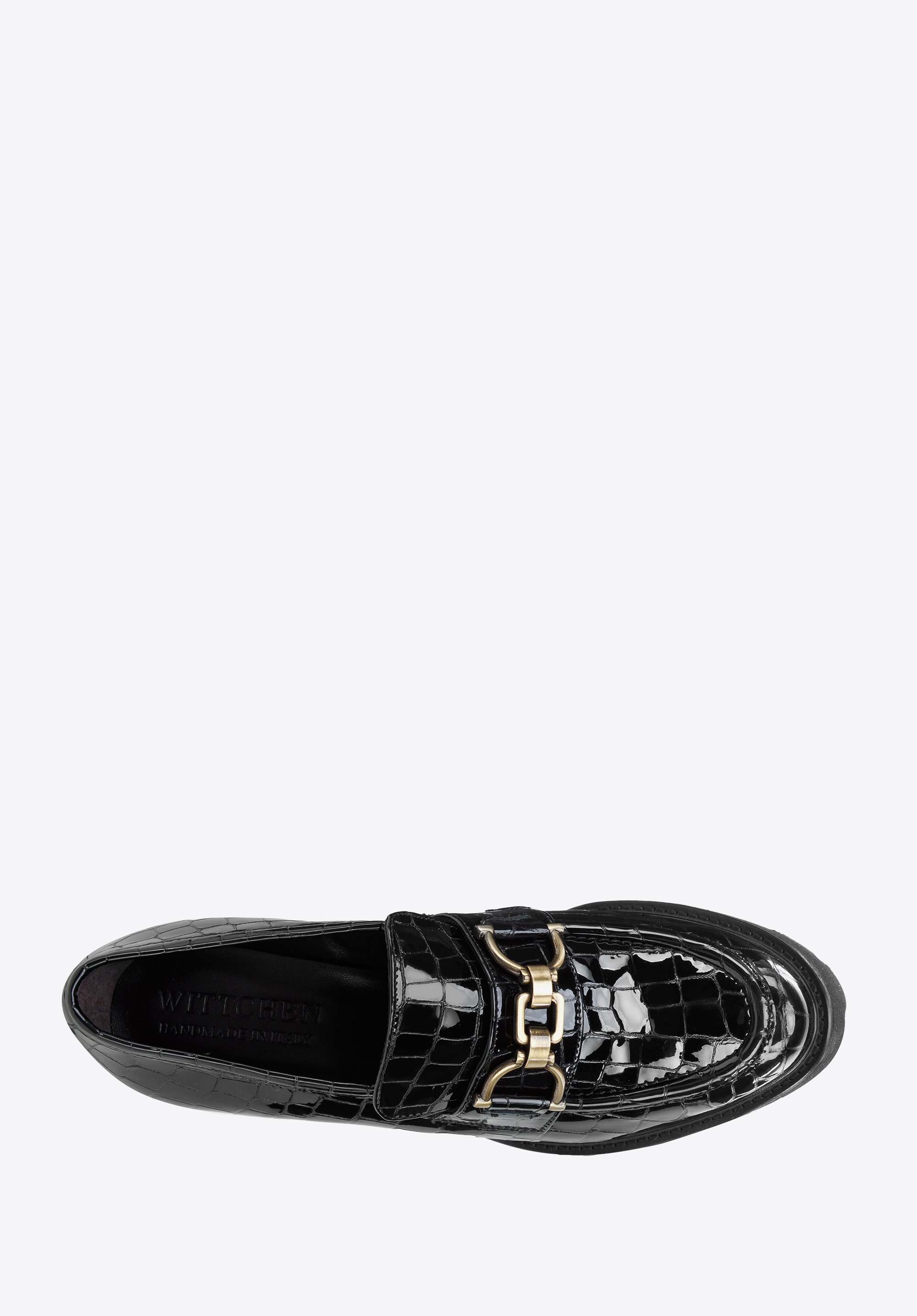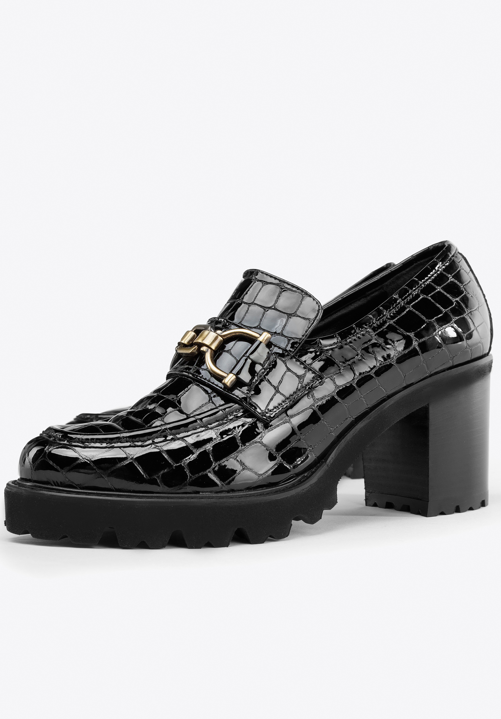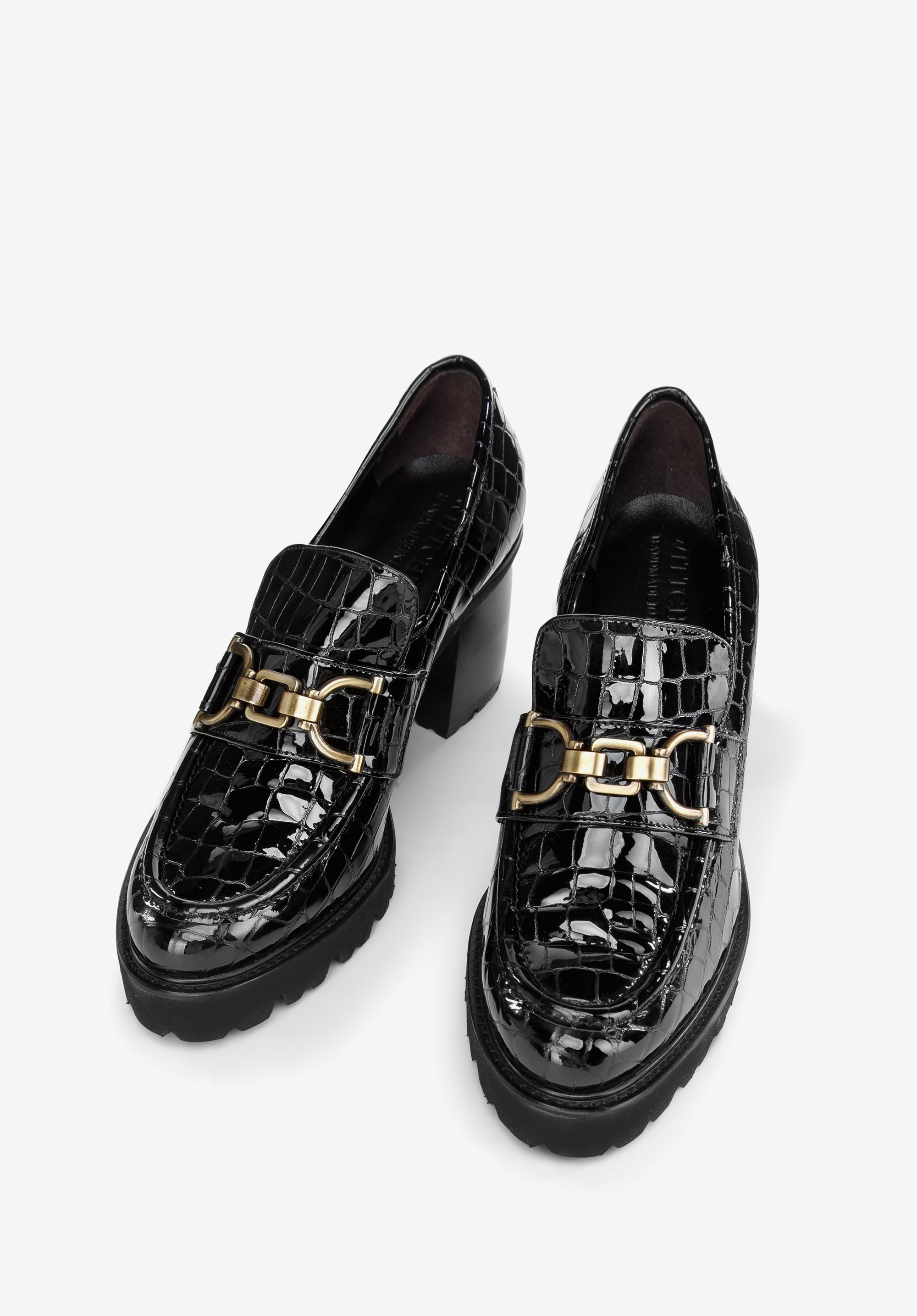 Te buty dodadzą szyku każdej Twojej stylizacji. Wykonane zostały z wysokiej jakości skóry lakierowanej o fakturze croco z delikatnym połyskiem. Dopełnia je klamra ze szczotkowanego metalu w kolorze mosiądzu. Ten model ma wysoki, ale wygodny obcas słupek, który wysmukli sylwetkę i doda Ci kilku centymetrów wzrostu. Żłobiona, gruba podeszwa zapewni dobrą przyczepność i stabilność. Dodaj blasku małej czarnej lub noś je do chinosów i koszuli – są stylowe i charakterystyczne. Czółenka ze skóry lakierowanej croco z klamerką to świetny wybór dla każdej eleganckiej kobiety.