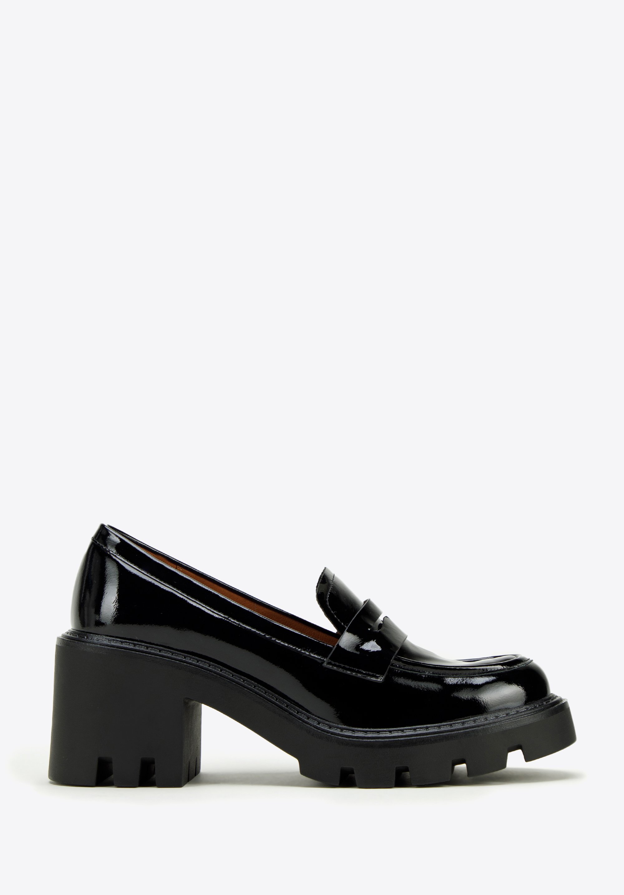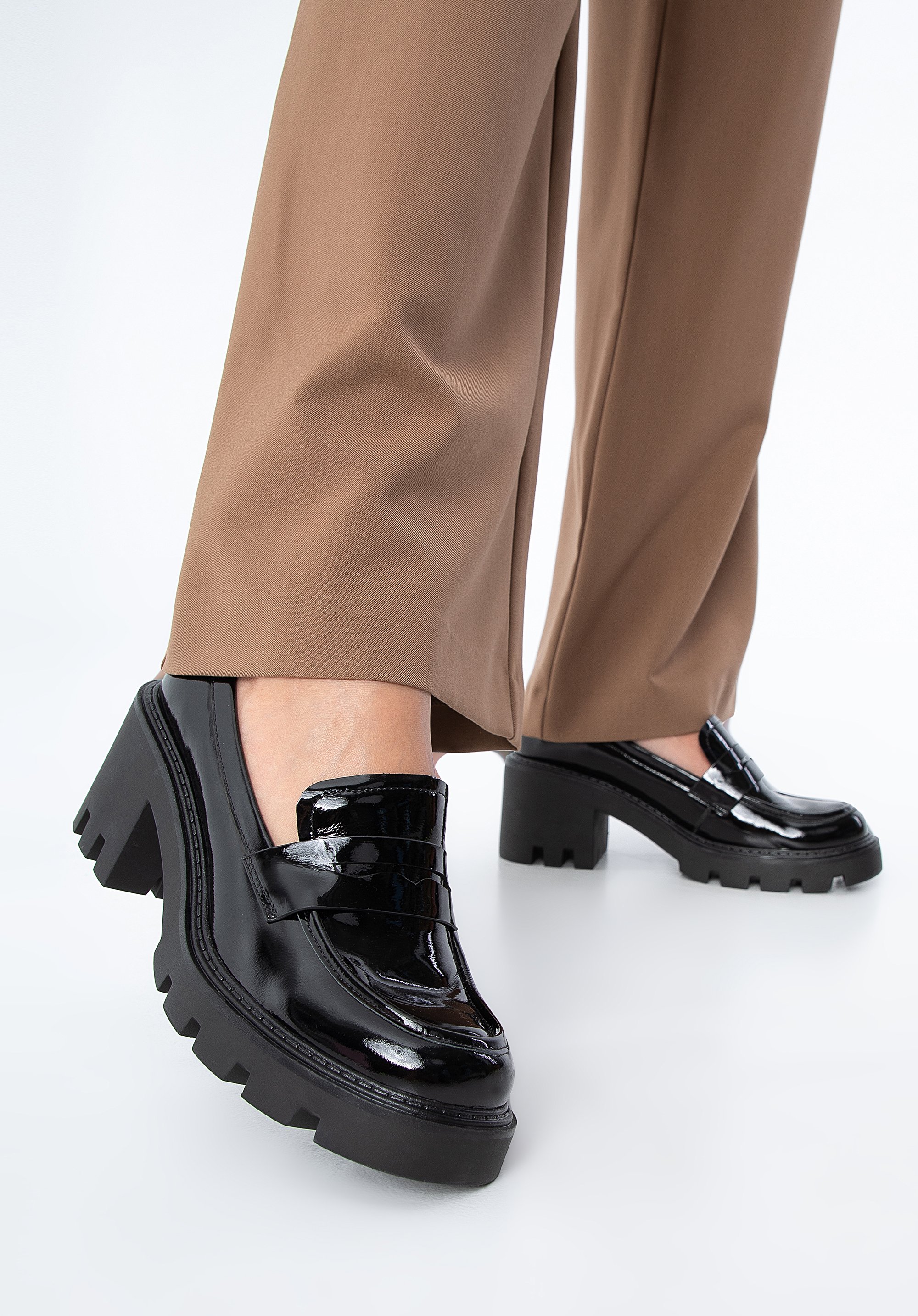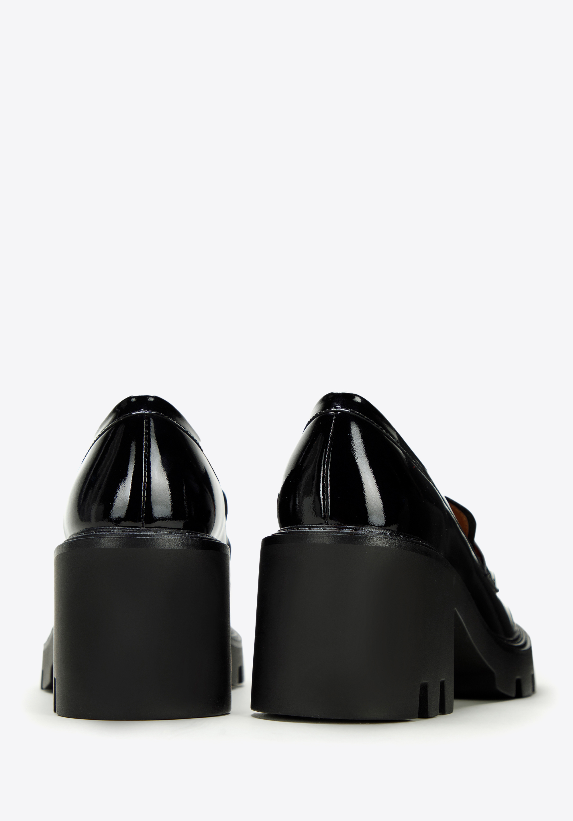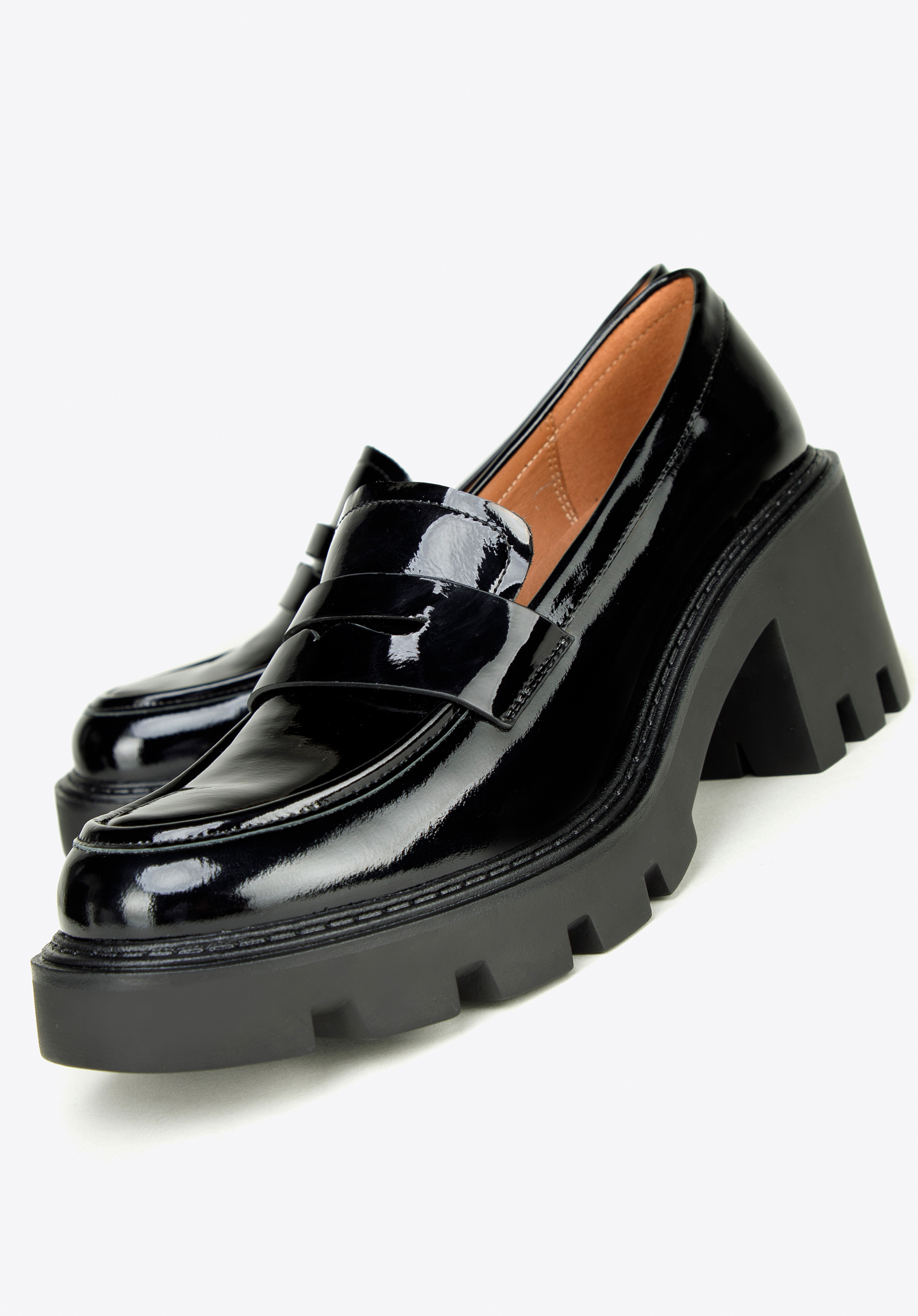 z wysokiej jakości skóry lakierowanej. Gruba platforma z obcasem na słupku zapewni komfortowe chodzenie i wysmukli sylwetkę.