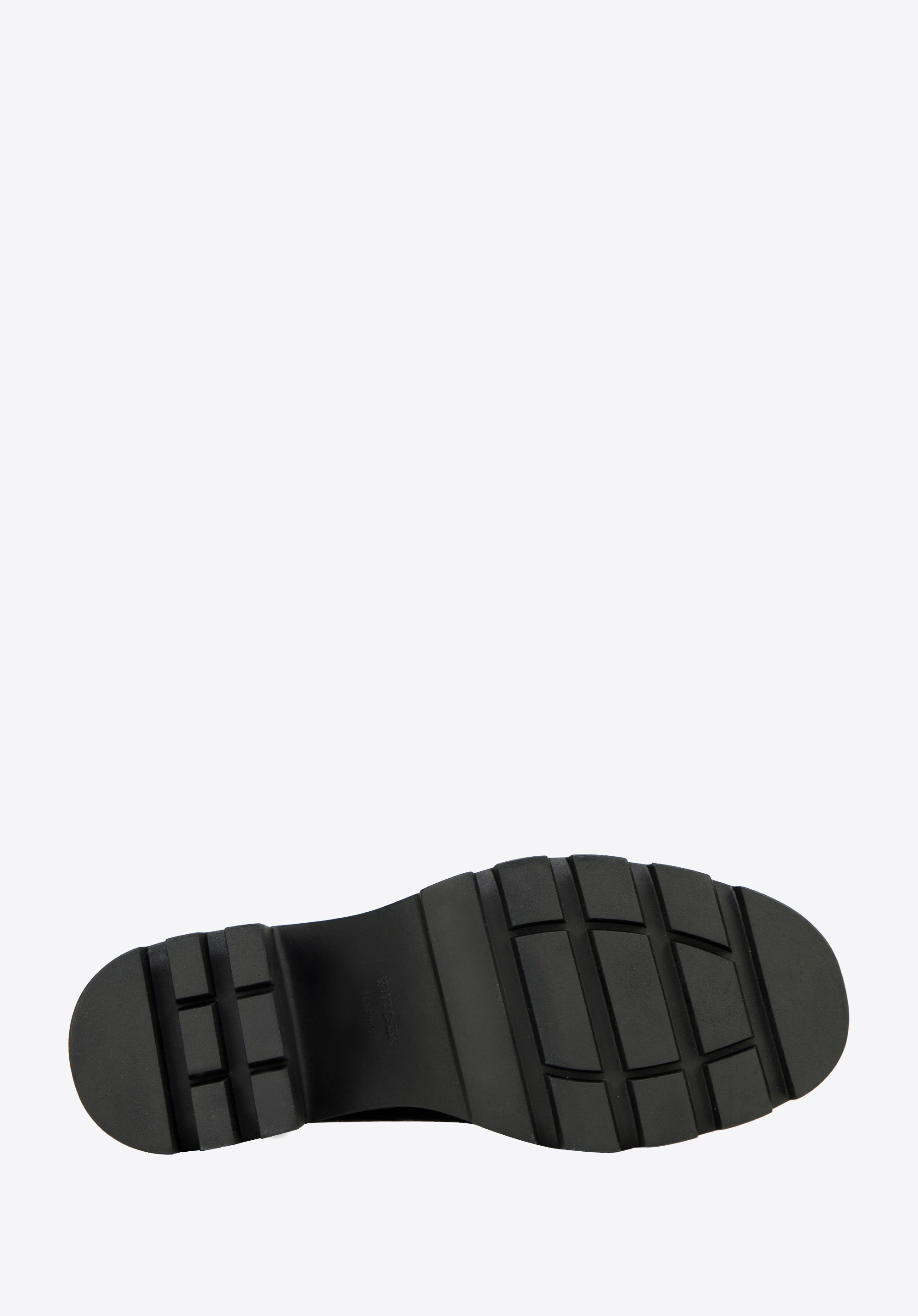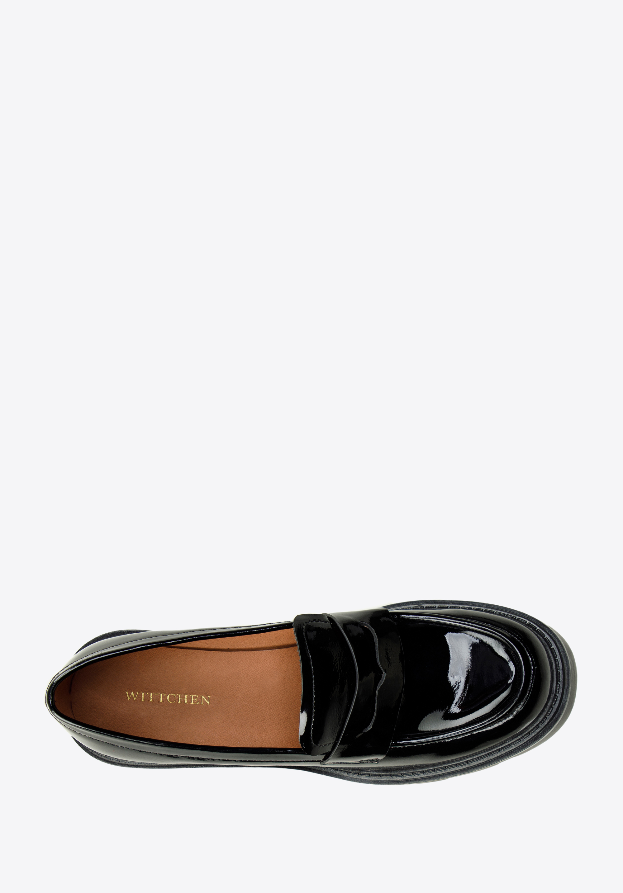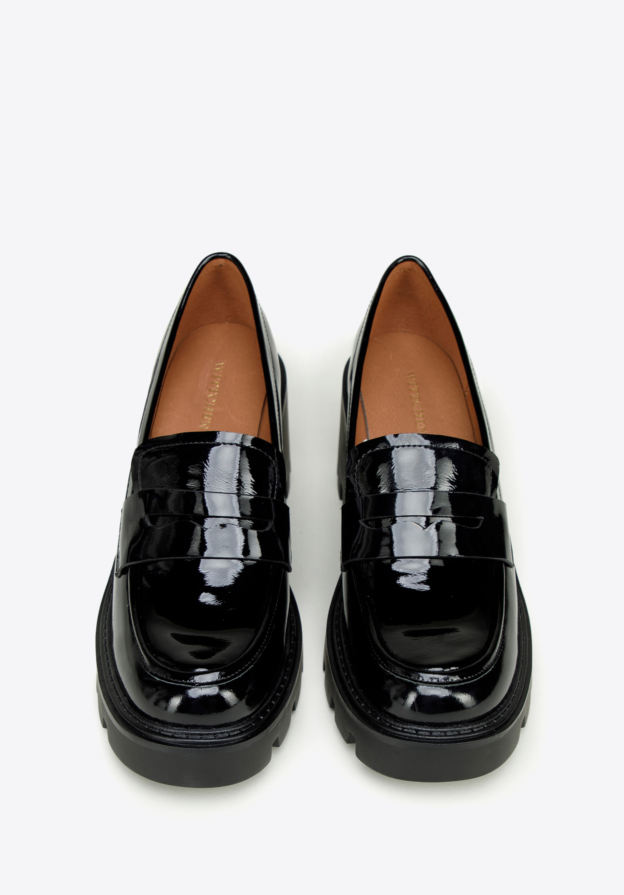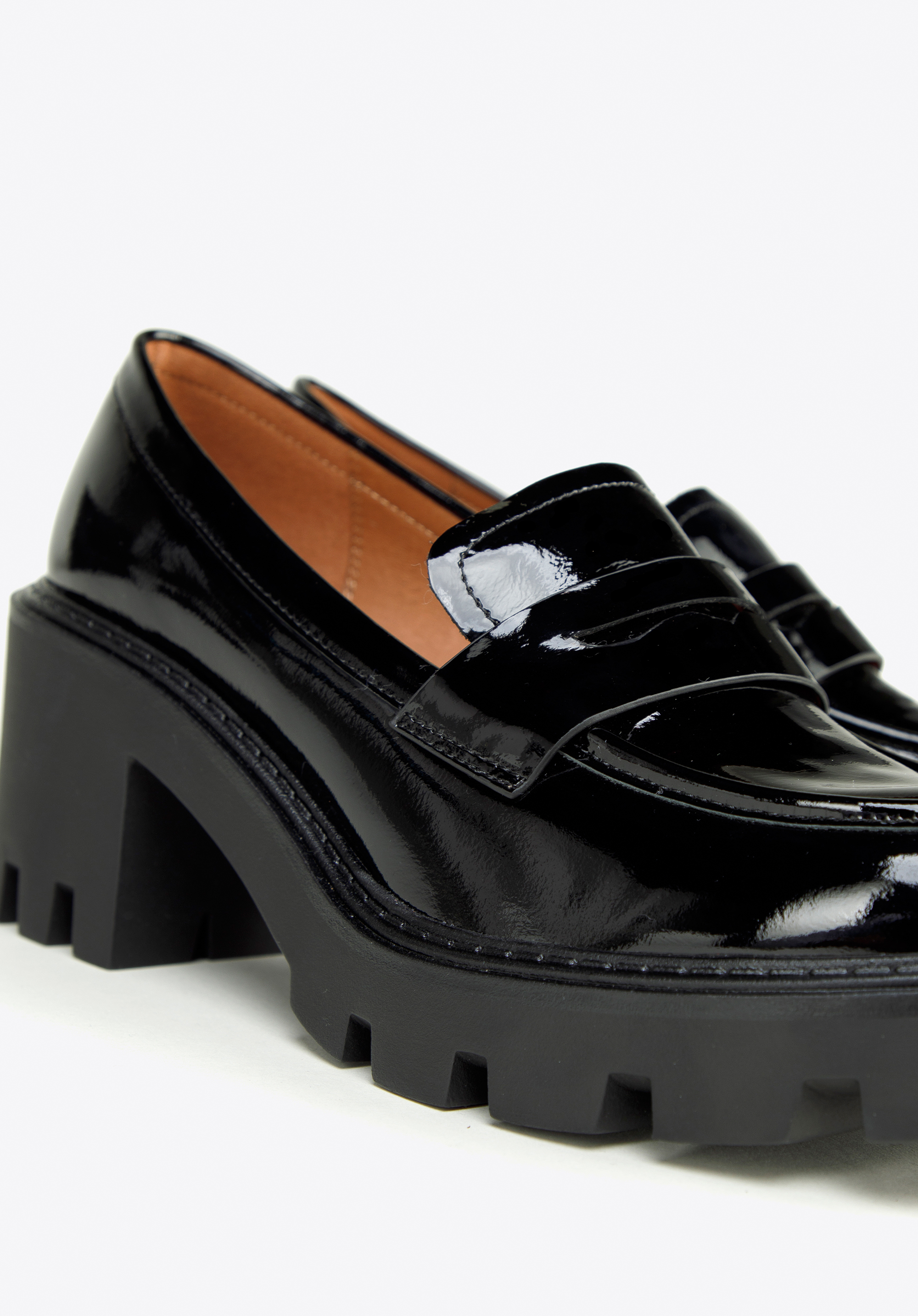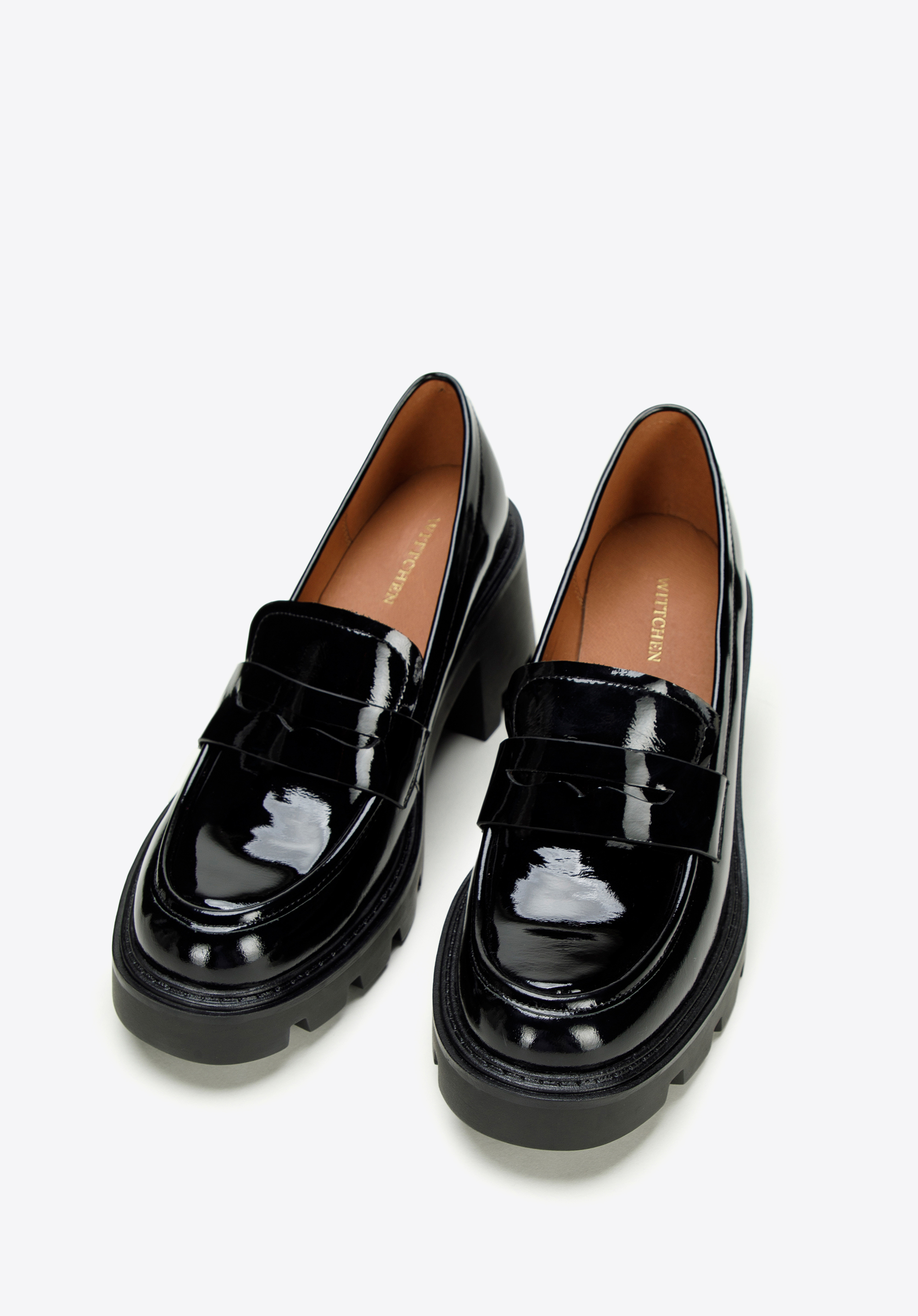 z wysokiej jakości skóry lakierowanej. Gruba platforma z obcasem na słupku zapewni komfortowe chodzenie i wysmukli sylwetkę.