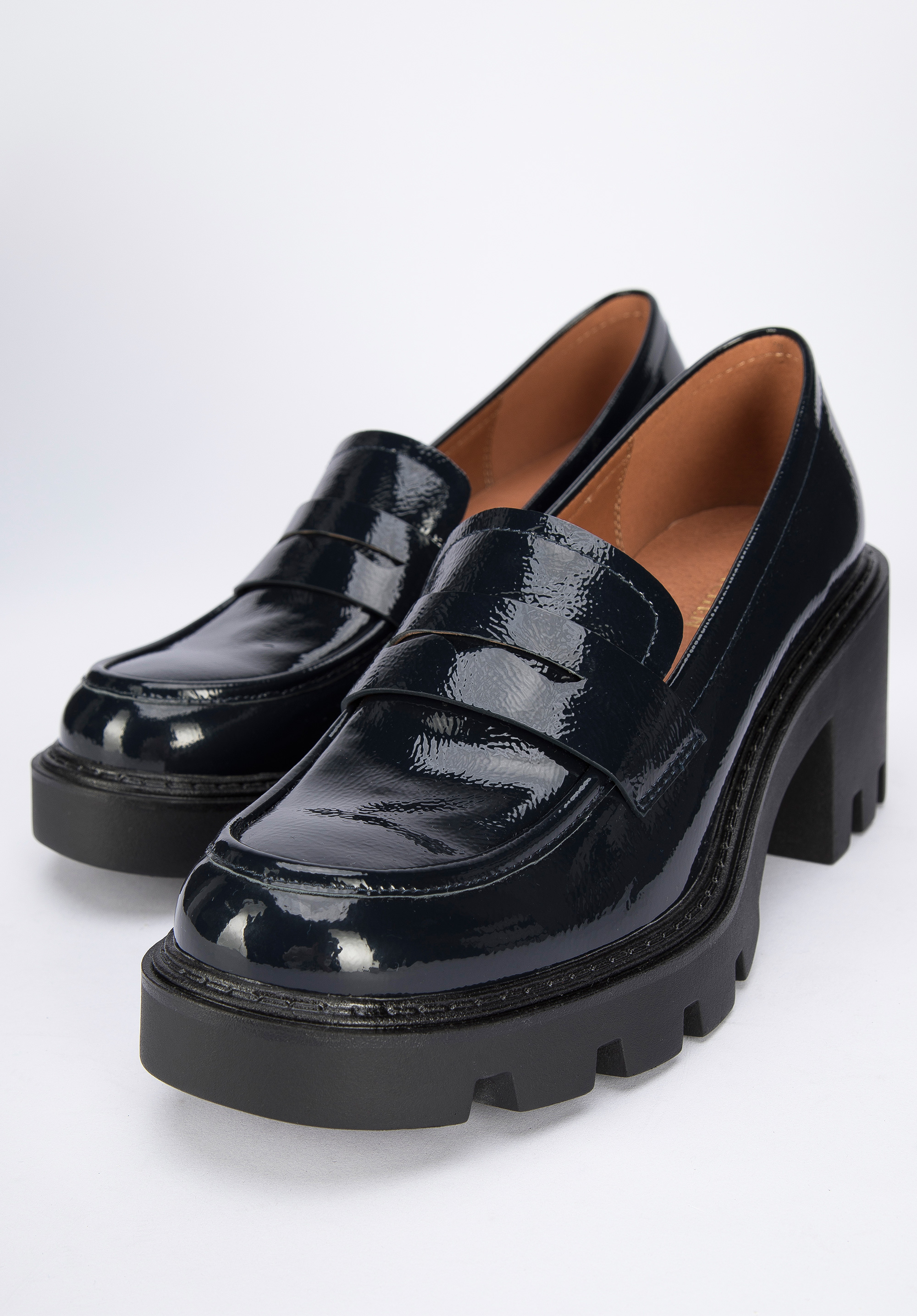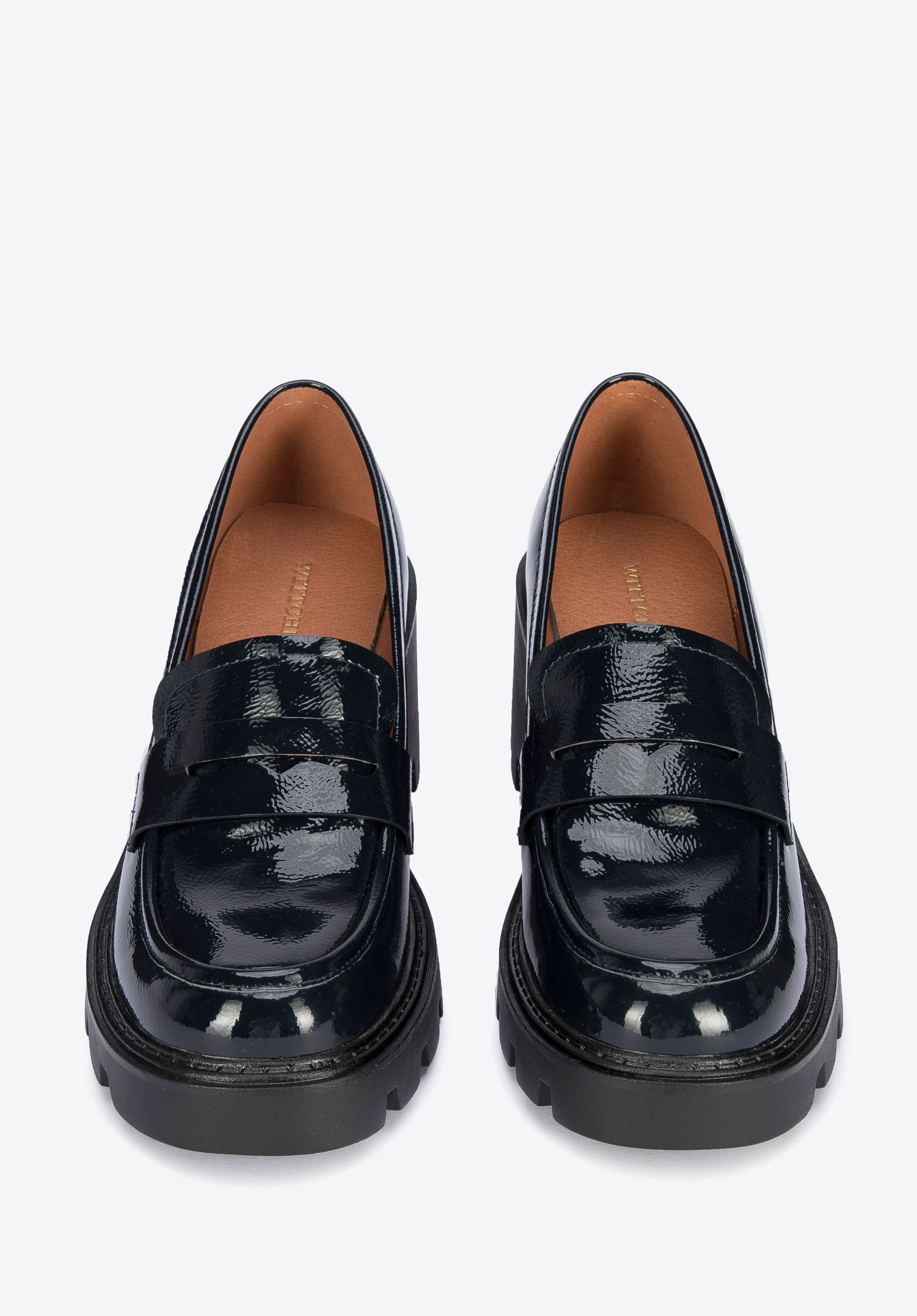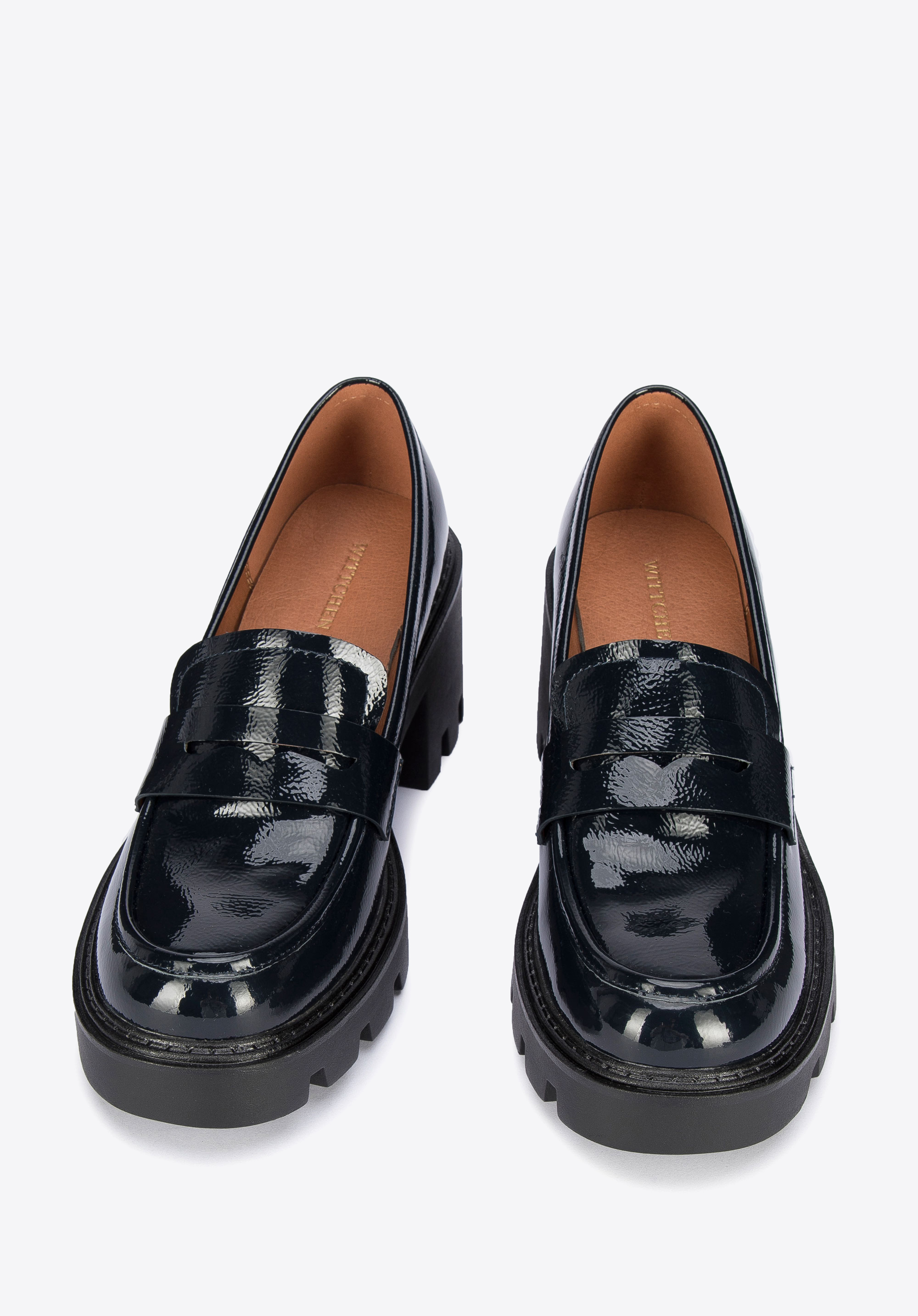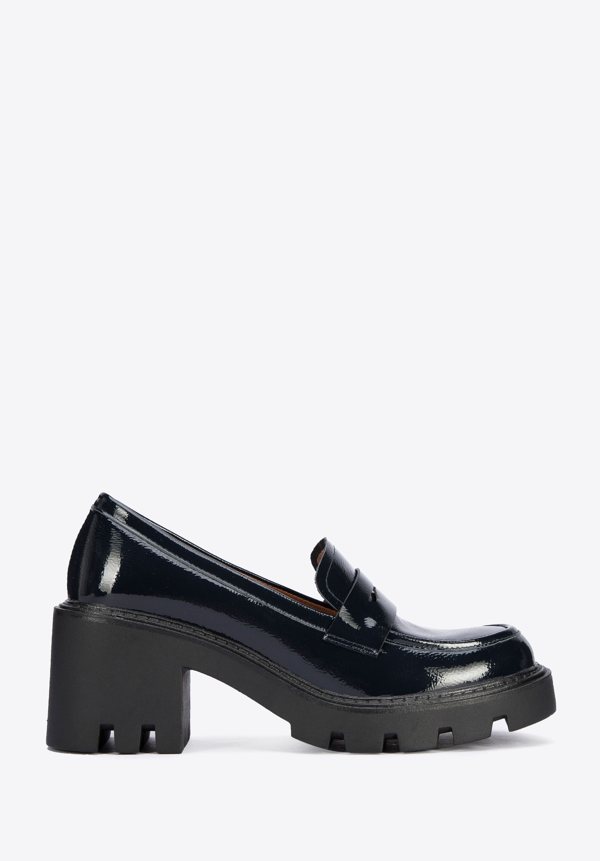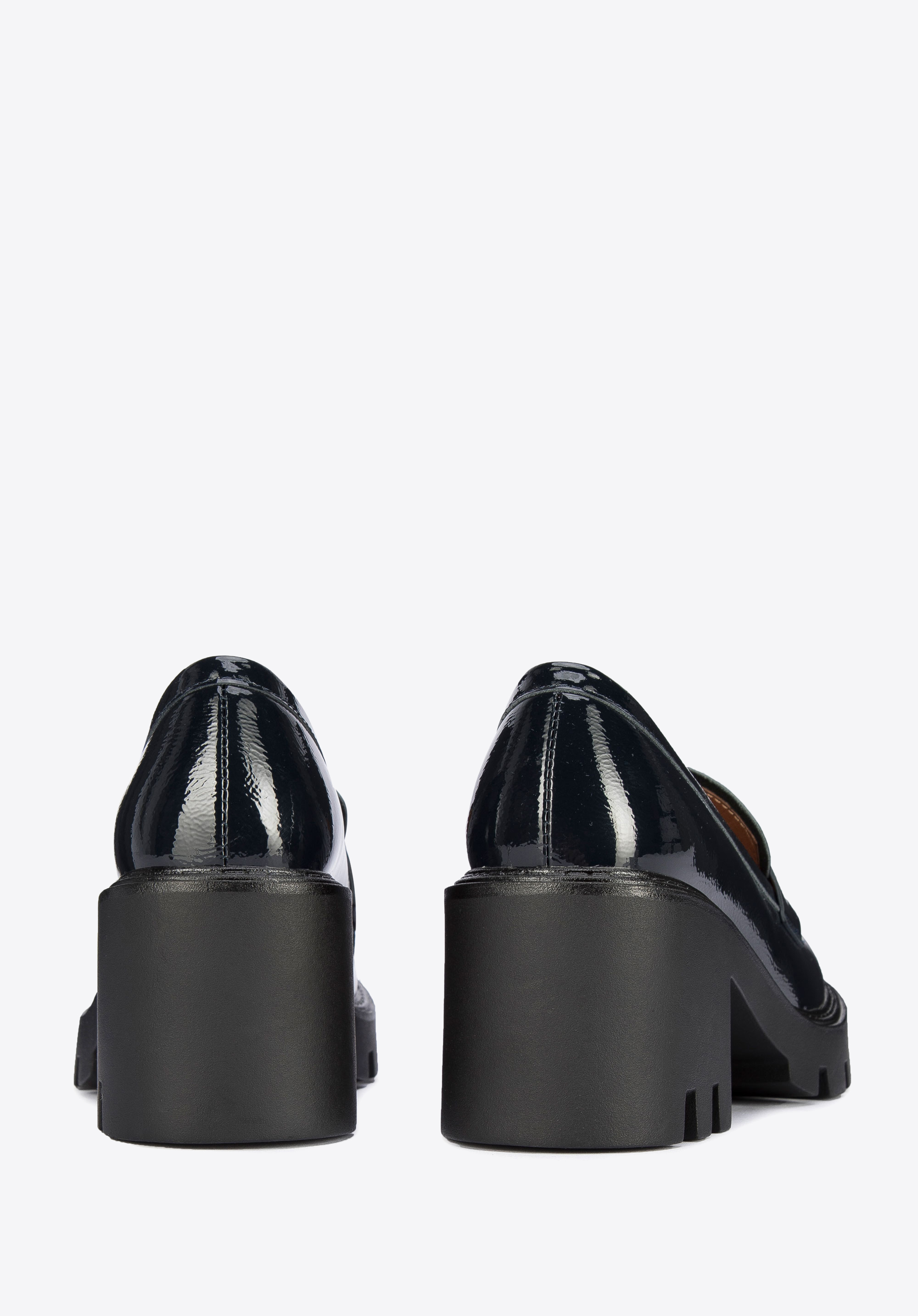 Czółenka ze skóry lakierowanej na grubej platformie z bieżnikiem to stylowy dodatek, zarówno modny, jak i wygodny.