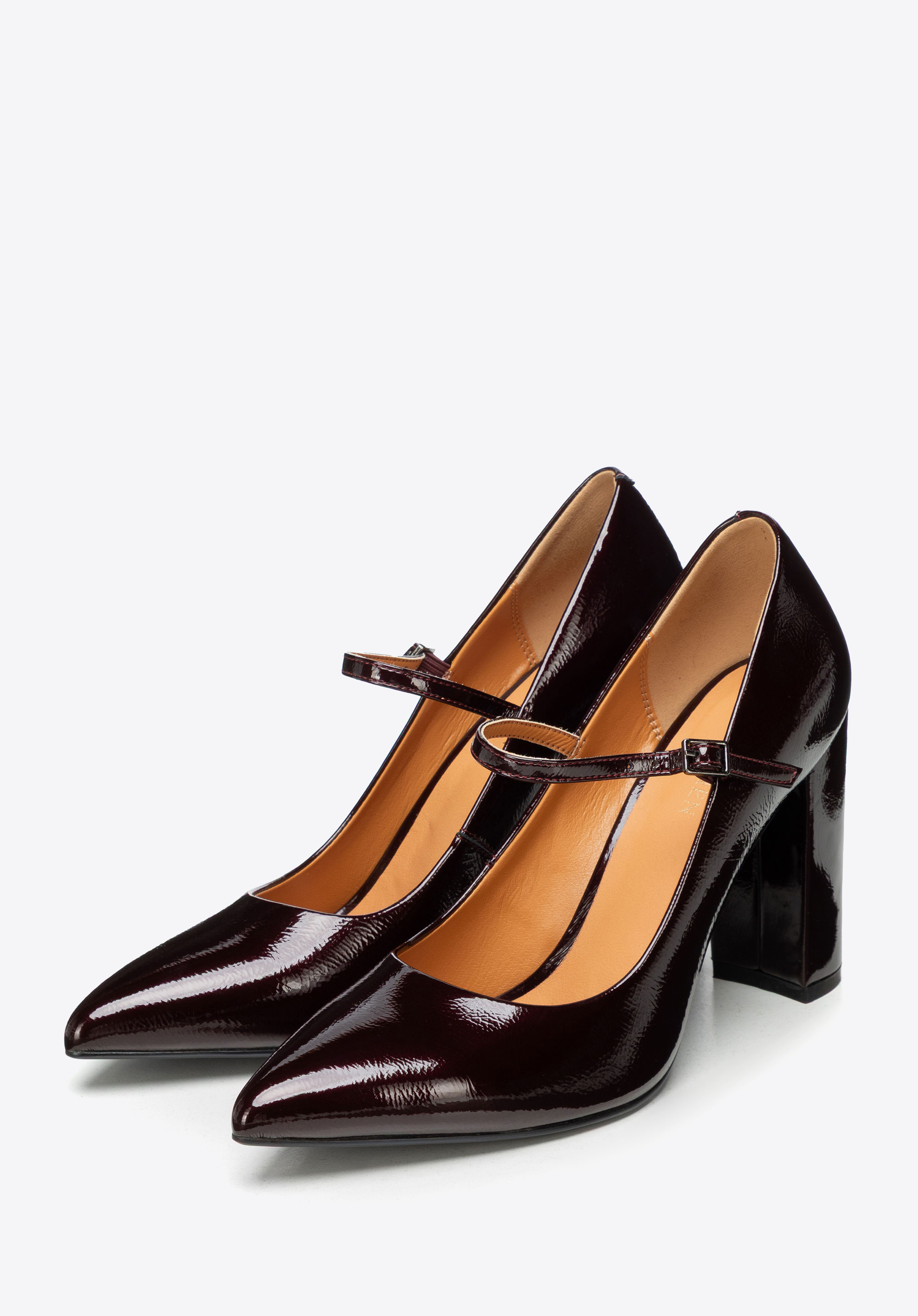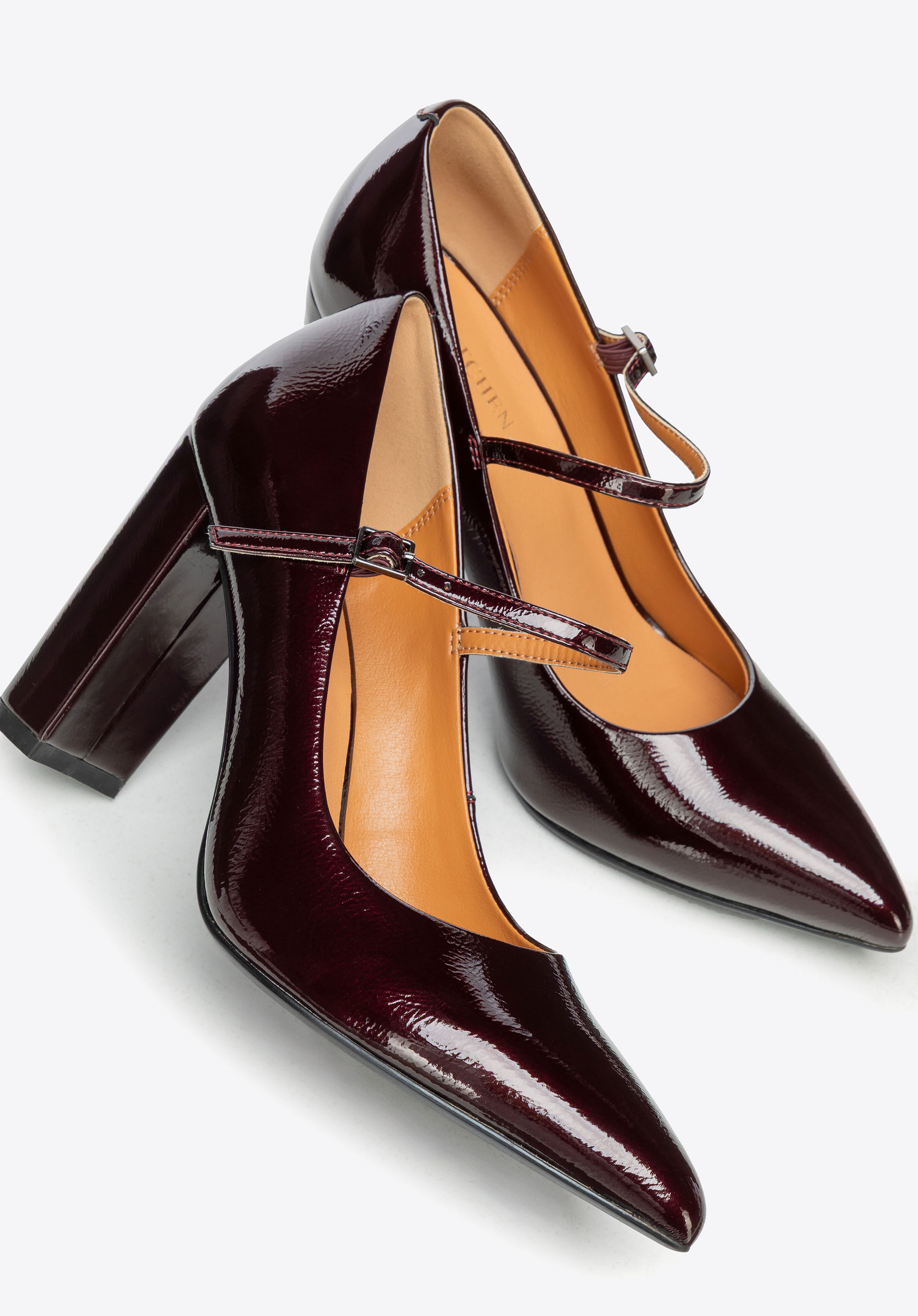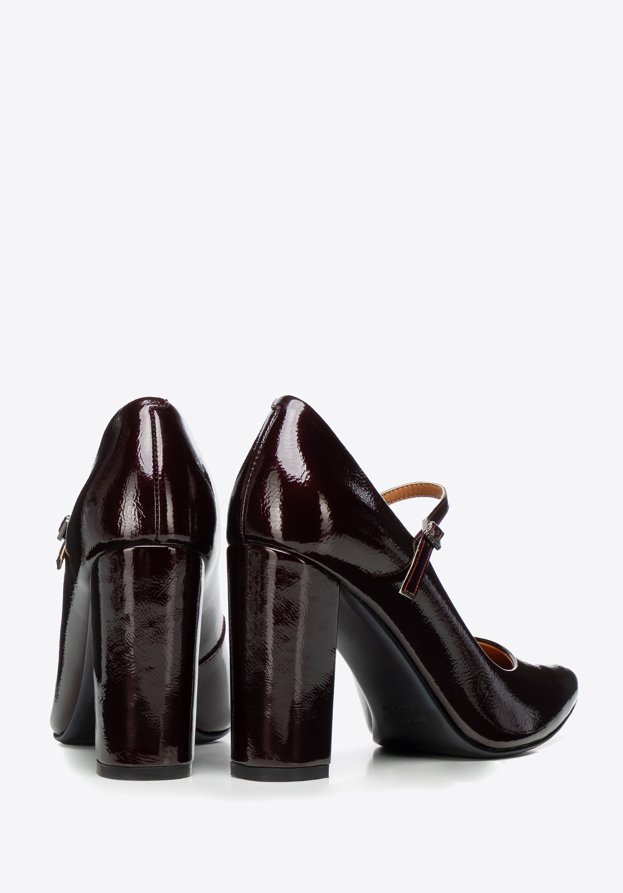 Czółenka ze skóry lakierowanej na wysokim słupku bordowe