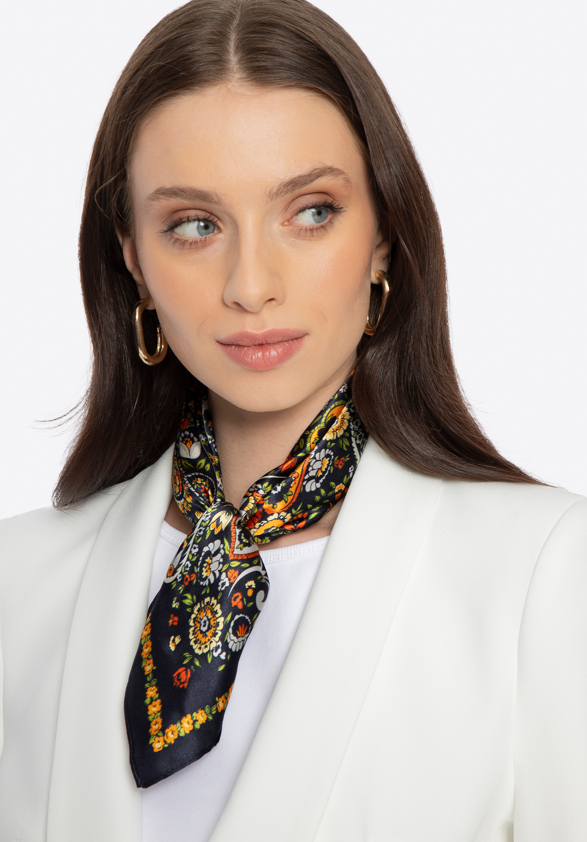 Dodaj swojej stylizacji nuty ponadczasowej elegancji dzięki tej wyjątkowej apaszce, wykonanej z gładkiego jedwabiu. Naturalny materiał o subtelnym połysku pięknie się układa i delikatnie otula skórę, zapewniając wyjątkowy komfort noszenia. Klasyczny wzór paisley nadaje apaszce charakteru – wygląda zjawiskowo zarówno po rozłożeniu, jak i po zawiązaniu. To kobiecy akcent, który podkreśli urok zarówno eleganckiej sukienki, jak i klasycznego trencza. Stylowy, a zarazem praktyczny dodatek – przewiązany na szyi, przy torebce lub we włosach – doda wyrafinowanego uroku każdej stylizacji.