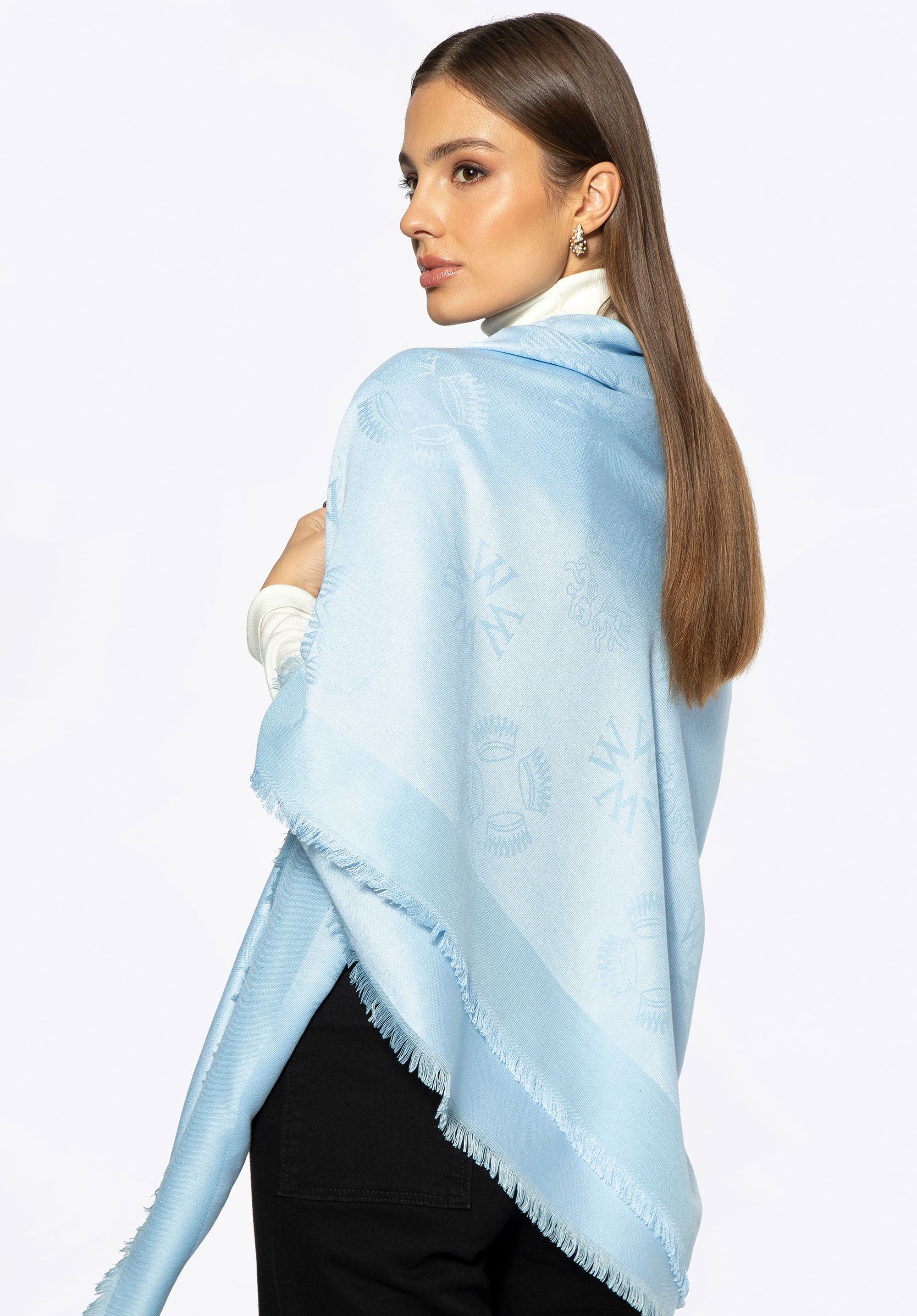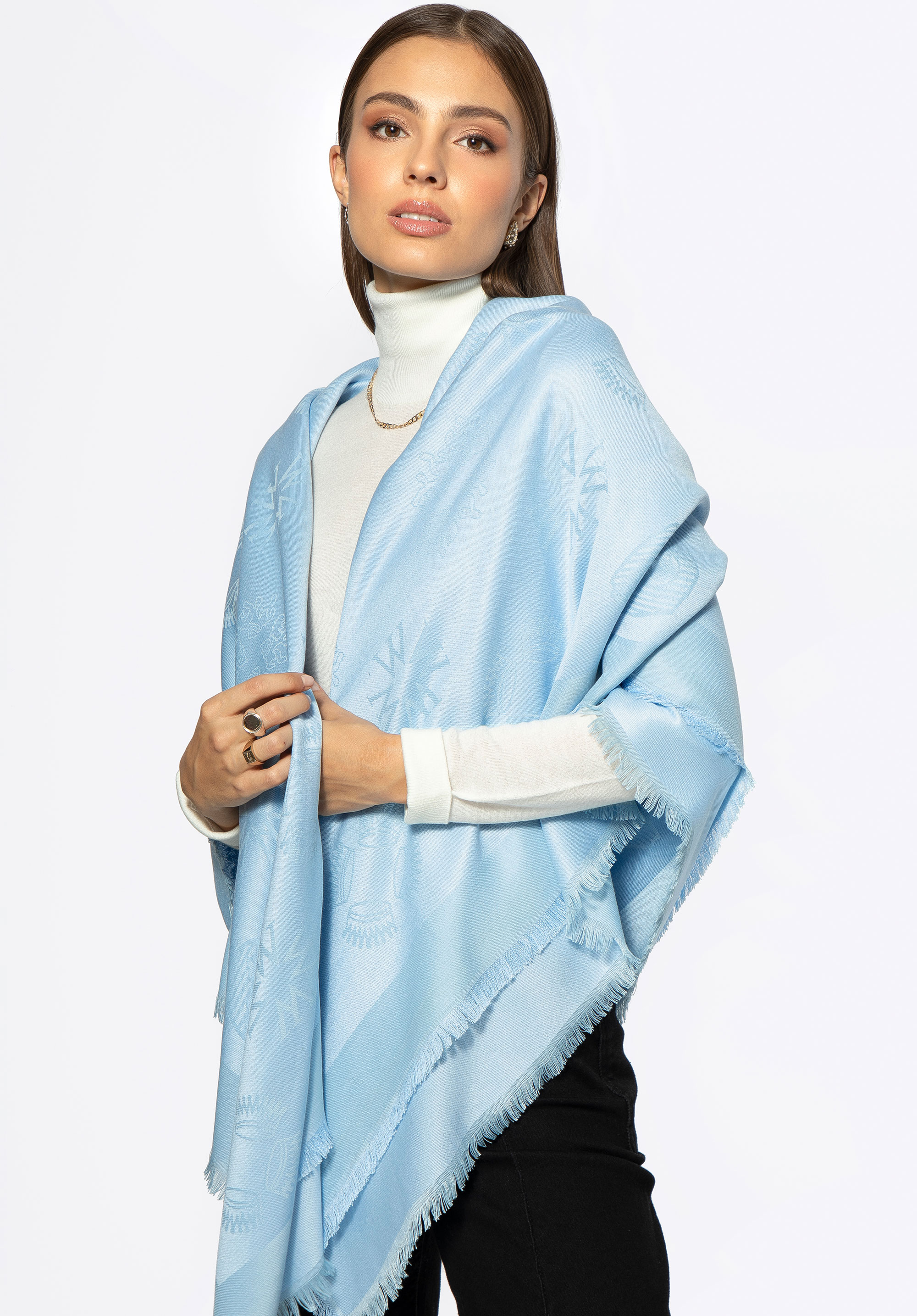 Damska chusta z bambusem w monogram pięknie uzupełni zarówno codzienny look, jak i bardziej formalne zestawy, gdy chcesz dodać stylizacji miękkości i światła. Bambusowa mieszanka zapewnia przewiewność, a duży format z frędzlami i monogramem pozwala układać ją na wiele sposobów — od szyi po narzutkę na ramiona.
