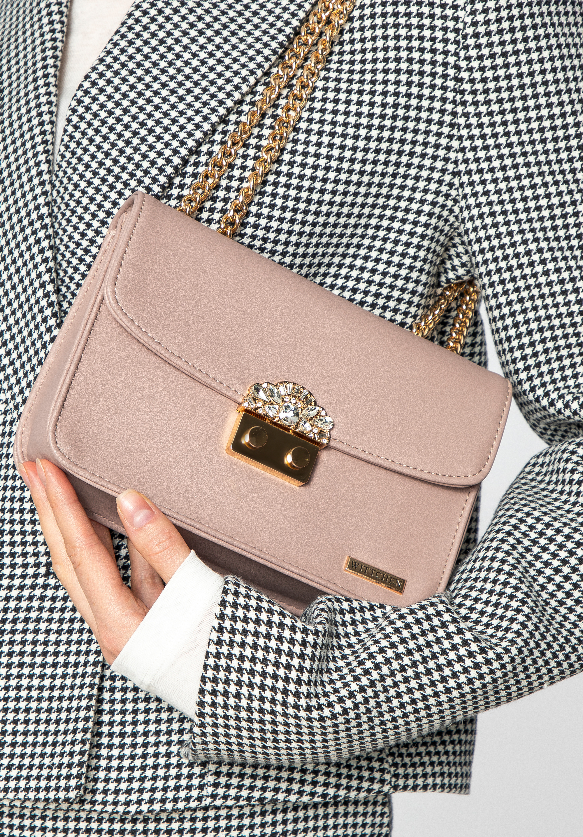 Damska torebka crossbody z ekoskóry to idealne połączenie elegancji i funkcjonalności. Wykonana ze skóry ekologicznej, przyciąga wzrok biżuteryjnymi zdobieniami na klamrze oraz subtelnym logo producenta z przodu. Model na łańcuszku dodaje nuty luksusu każdej stylizacji, a kompaktowy rozmiar sprawia, że jest poręczna i idealna zarówno na co dzień, jak i na wyjątkowe okazje.