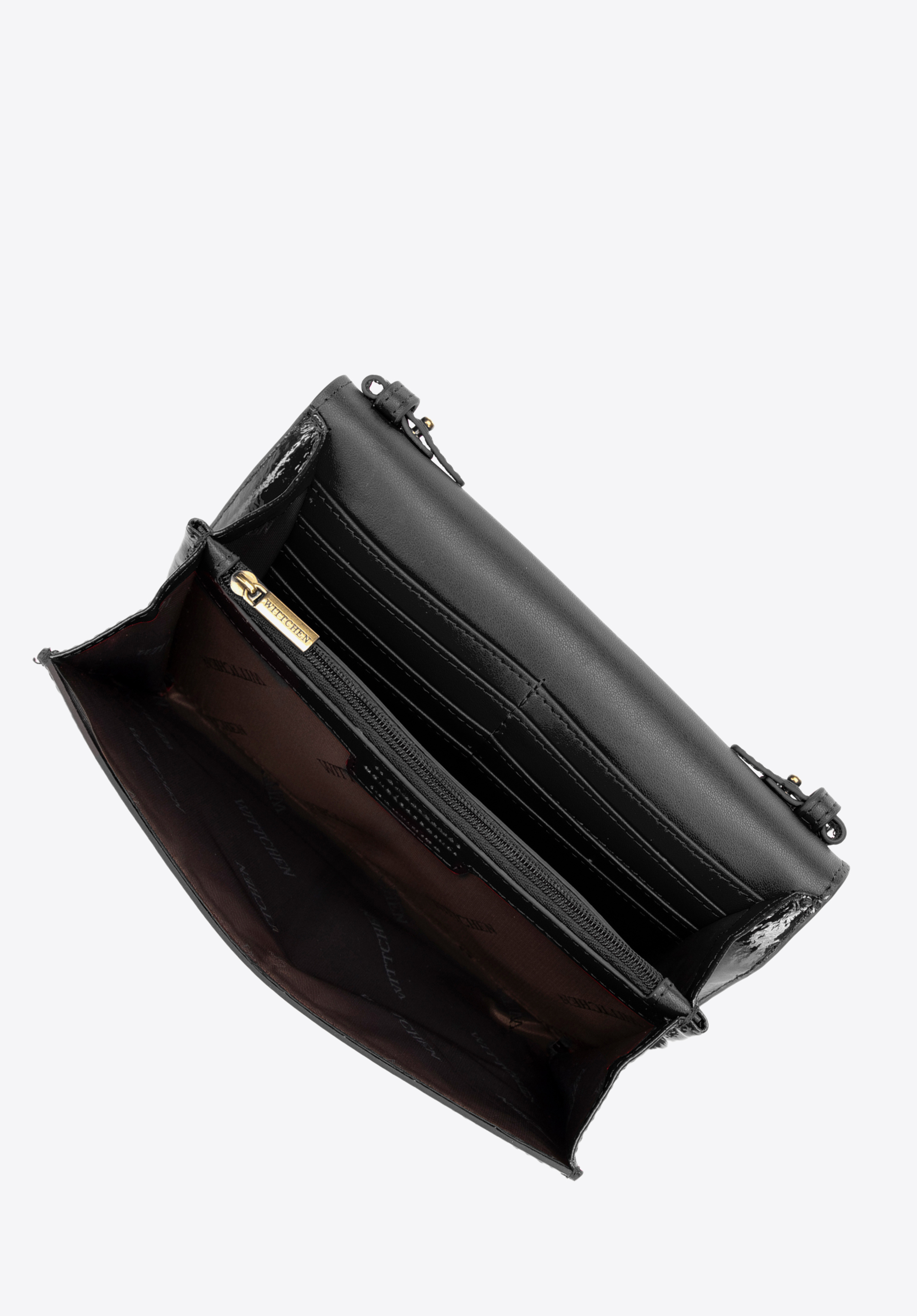 Damska kopertówka ze skóry lakierowanej sprawdzi się podczas uroczystości, kolacji i wieczornych wydarzeń, kiedy liczy się biżuteryjny detal i lekka forma. Odpinany łańcuszek, dwie komory oraz miejsce na karty pozwalają zabrać niezbędne drobiazgi bez dodatkowego portfela, zachowując elegancką linię.