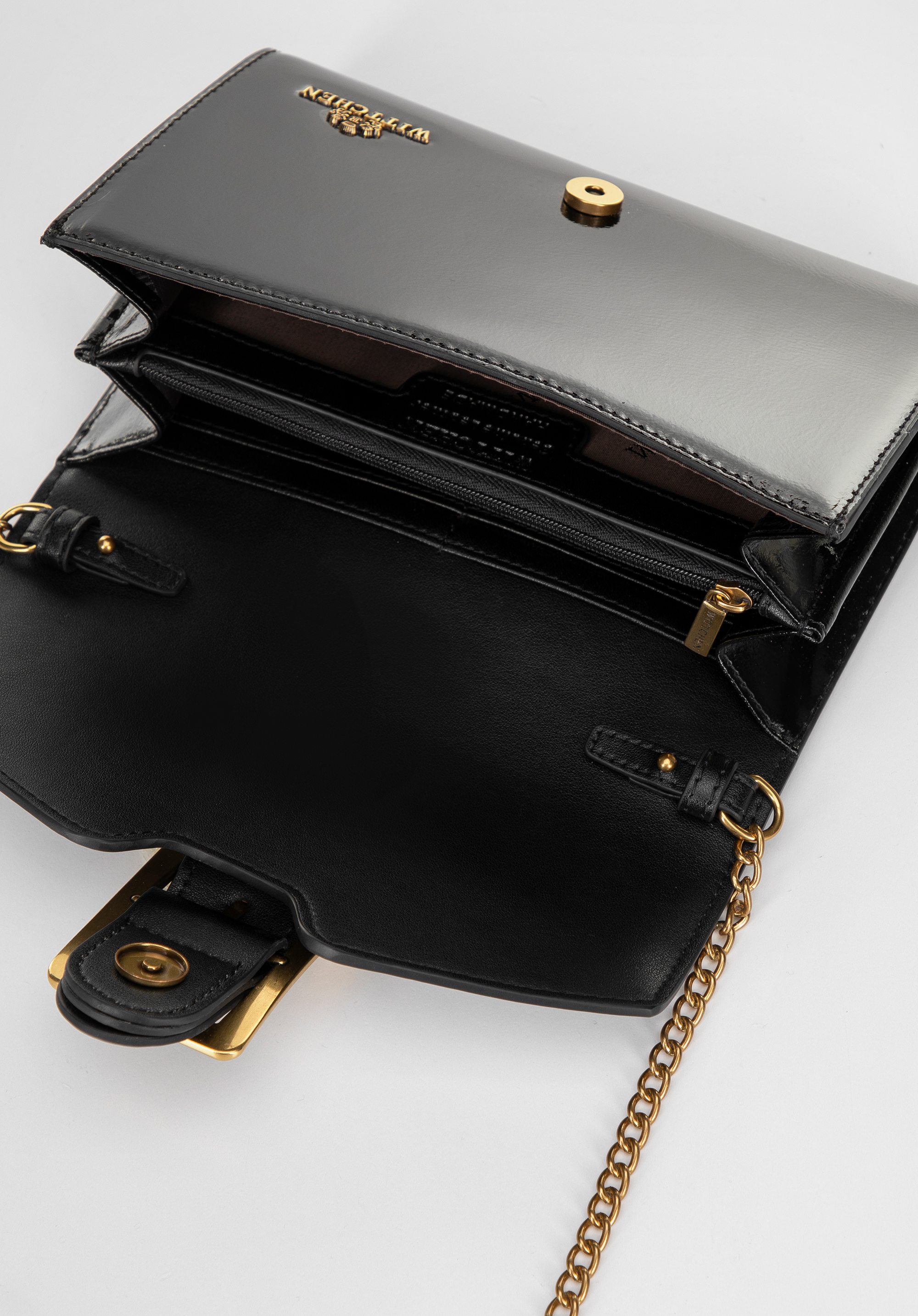 Odkryj połączenie elegancji i funkcjonalności! Nasza kopertówka ze skóry naturalnej łączy klasyczny design z nowoczesnym stylem. Błyszcząca skóra przyciąga wzrok, a dekoracyjna sprzączka na klapie nadaje jej unikalnego charakteru. Dzięki odpinanemu łańcuszkowi możesz nosić ją zarówno jako klasyczną kopertówkę, jak i wygodną torbę crossbody. Zapięcie na magnes, dwie przestronne komory, kieszeń na zamek i 8 miejsc na karty sprawiają, że jest to idealny wybór na każdą okazję.