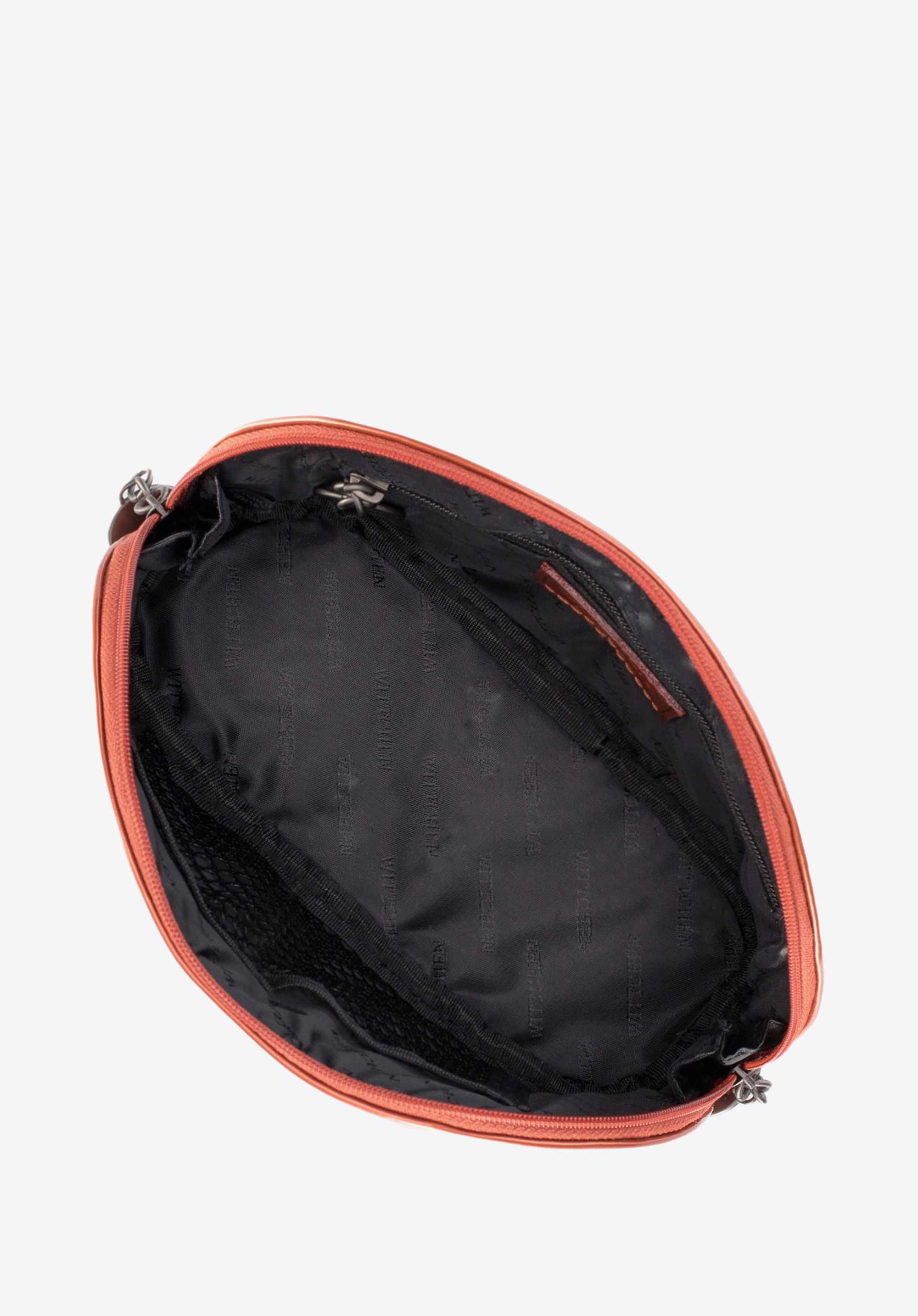 Półokrągła kosmetyczka damska średniej wielkości. Dzięki lekkości i niedużemu rozmiarowi najbardziej niezbędne akcesoria pielęgnacyjne będą zawsze w zasięgu ręki. Posiada charakterystyczne zdobienie w postaci tłoczenia logotypu marki. Akcesorium dostępne w kilku eleganckich odcieniach.