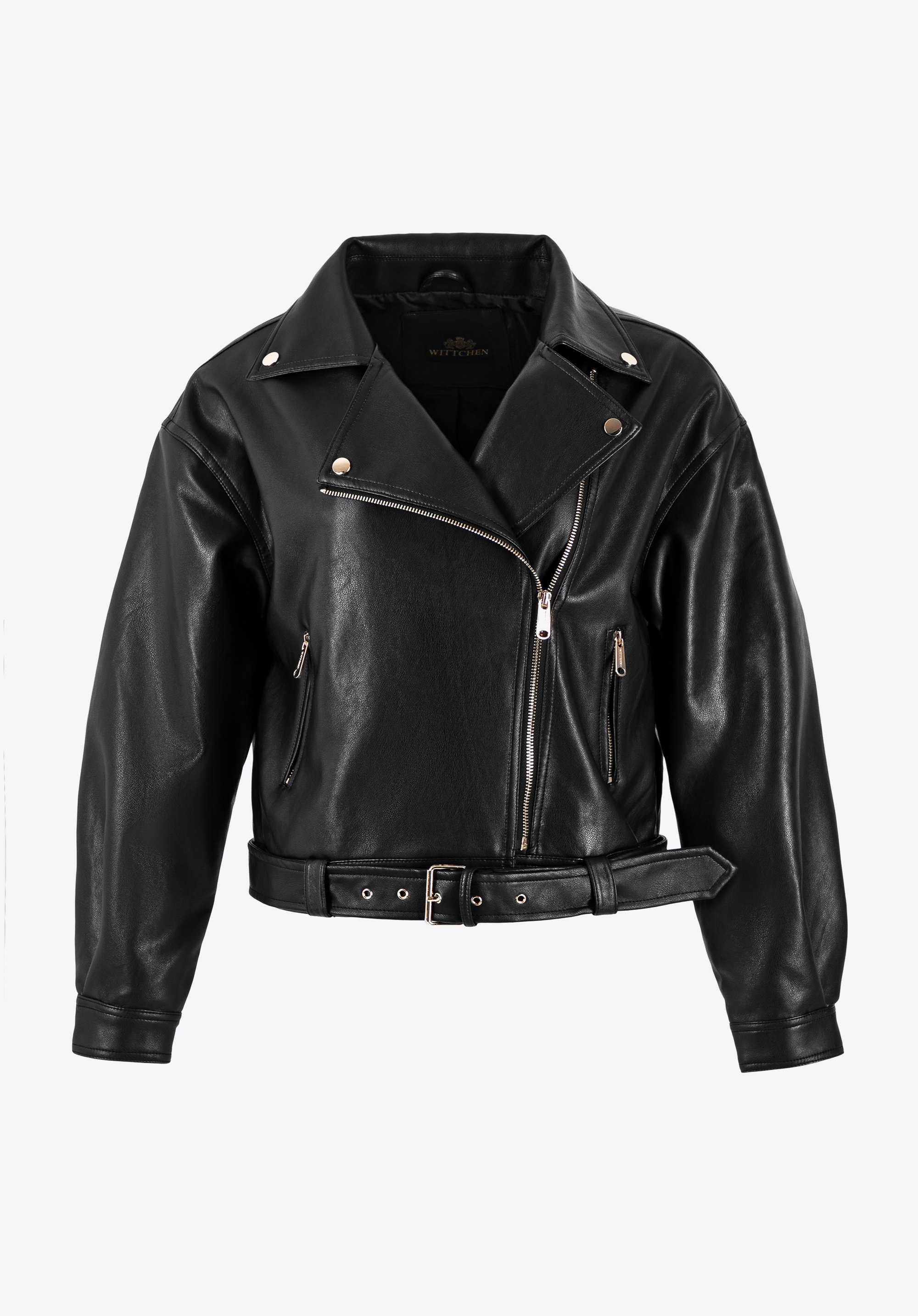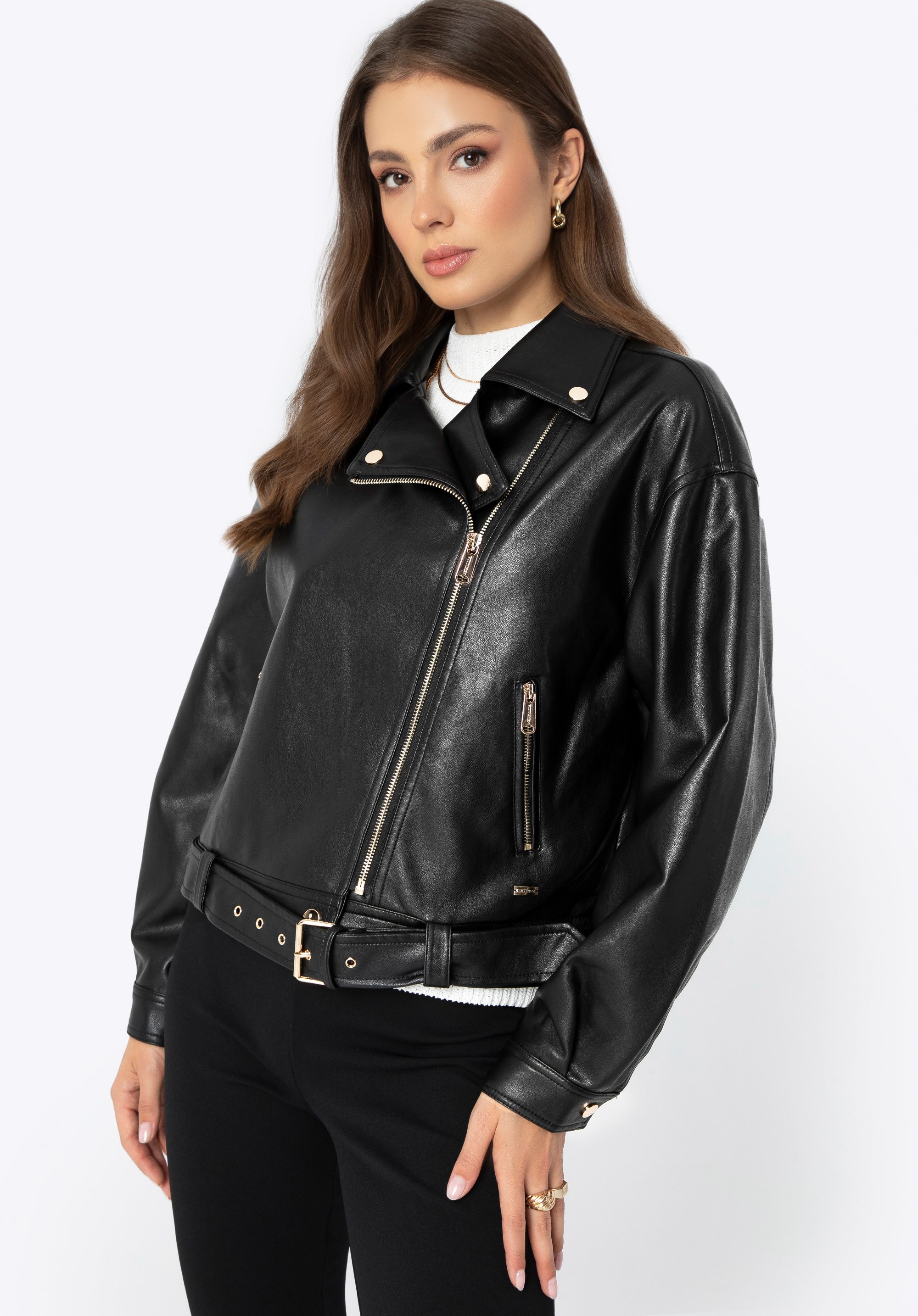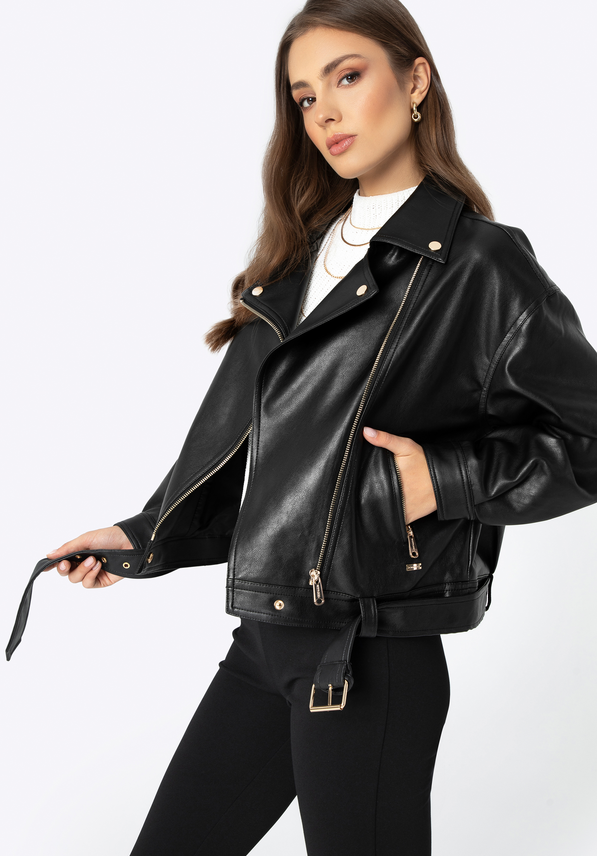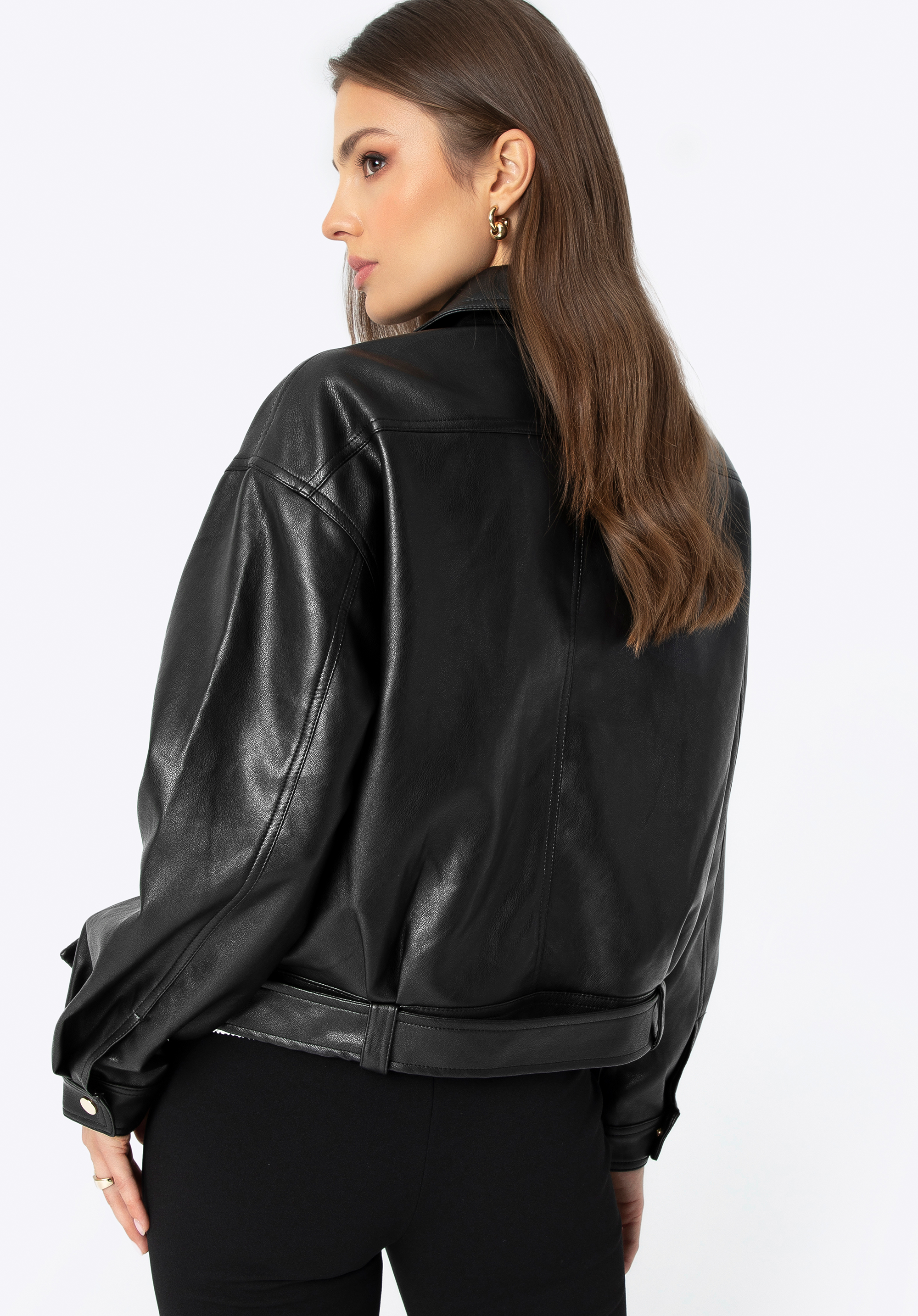Odkryj naszą damską kurtkę z ekoskóry, która łączy elegancję z nowoczesnym fasonem. Jej krój z obniżoną linią ramion i krótką długością tworzy modny, luźny look. Długie rękawy z zatrzaskami oraz kołnierz z ozdobnymi detalami dodają klasy, podczas gdy kieszenie na zamek są zarówno praktyczne, jak i stylowe. Wyjmowany, regulowany pasek z metalową klamrą pozwala dostosować kurtkę do własnych potrzeb. Idealna na każdą okazję, od casualowych dni po eleganckie wyjścia.