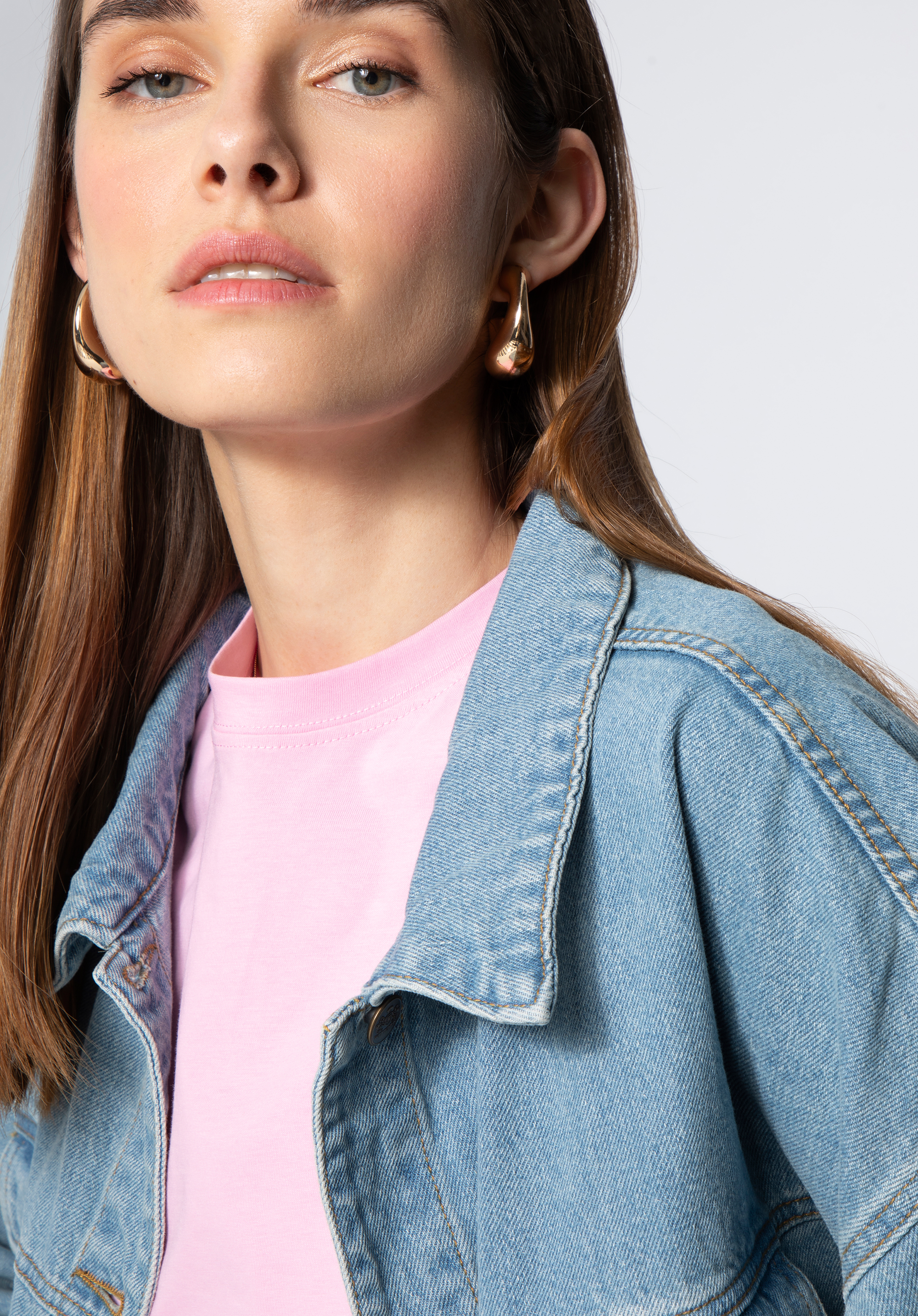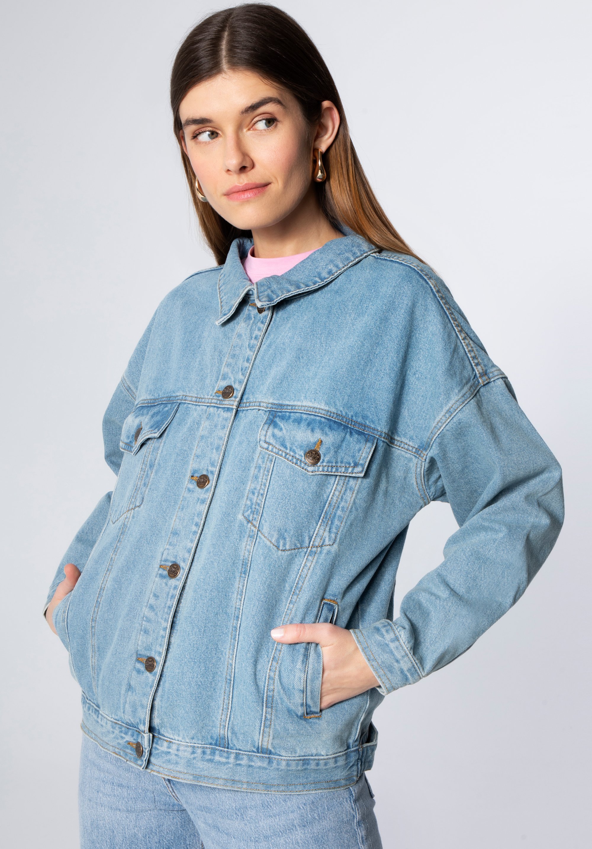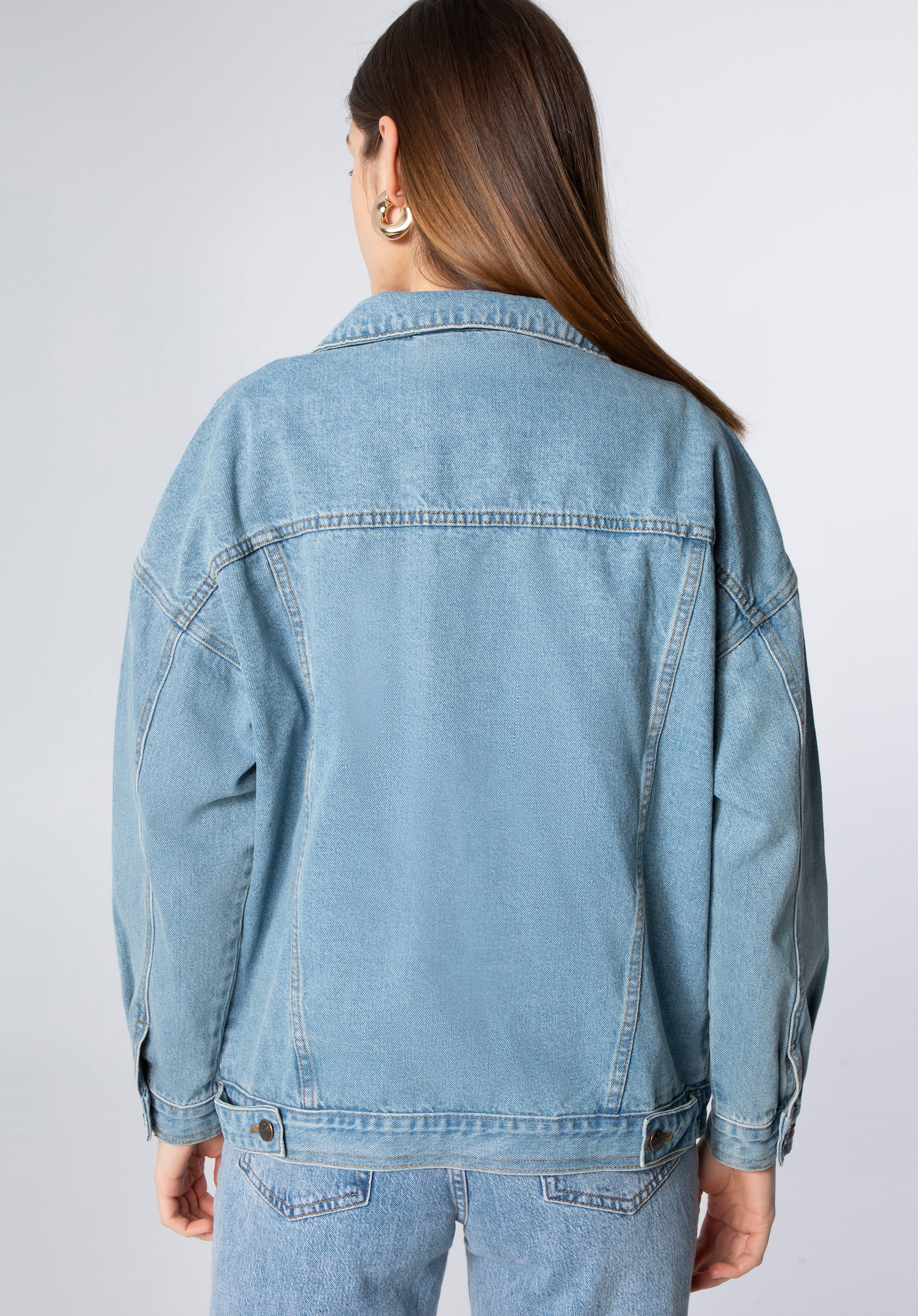 Damska kurtka dżinsowa oversize sprawdzi się w stylizacjach warstwowych na przejściowe pory roku, gdy chcesz zbudować luz z modowym wyczuciem. Oversizowy fason, klasyczny kołnierzyk i zestaw kieszeni tworzą ponadczasową bazę, którą łatwo zestawisz zarówno z sukienką, jak i z ulubionymi jeansami.