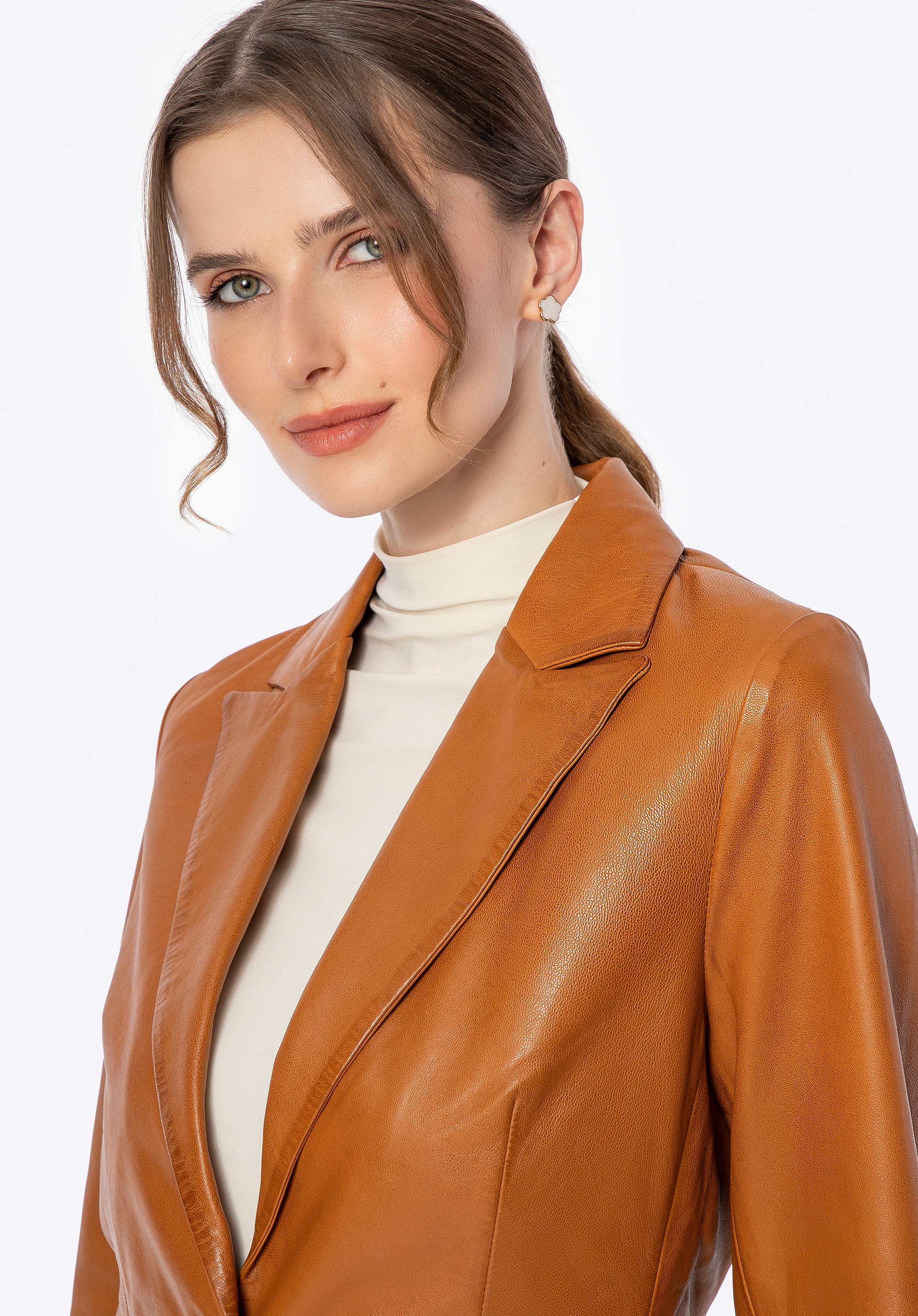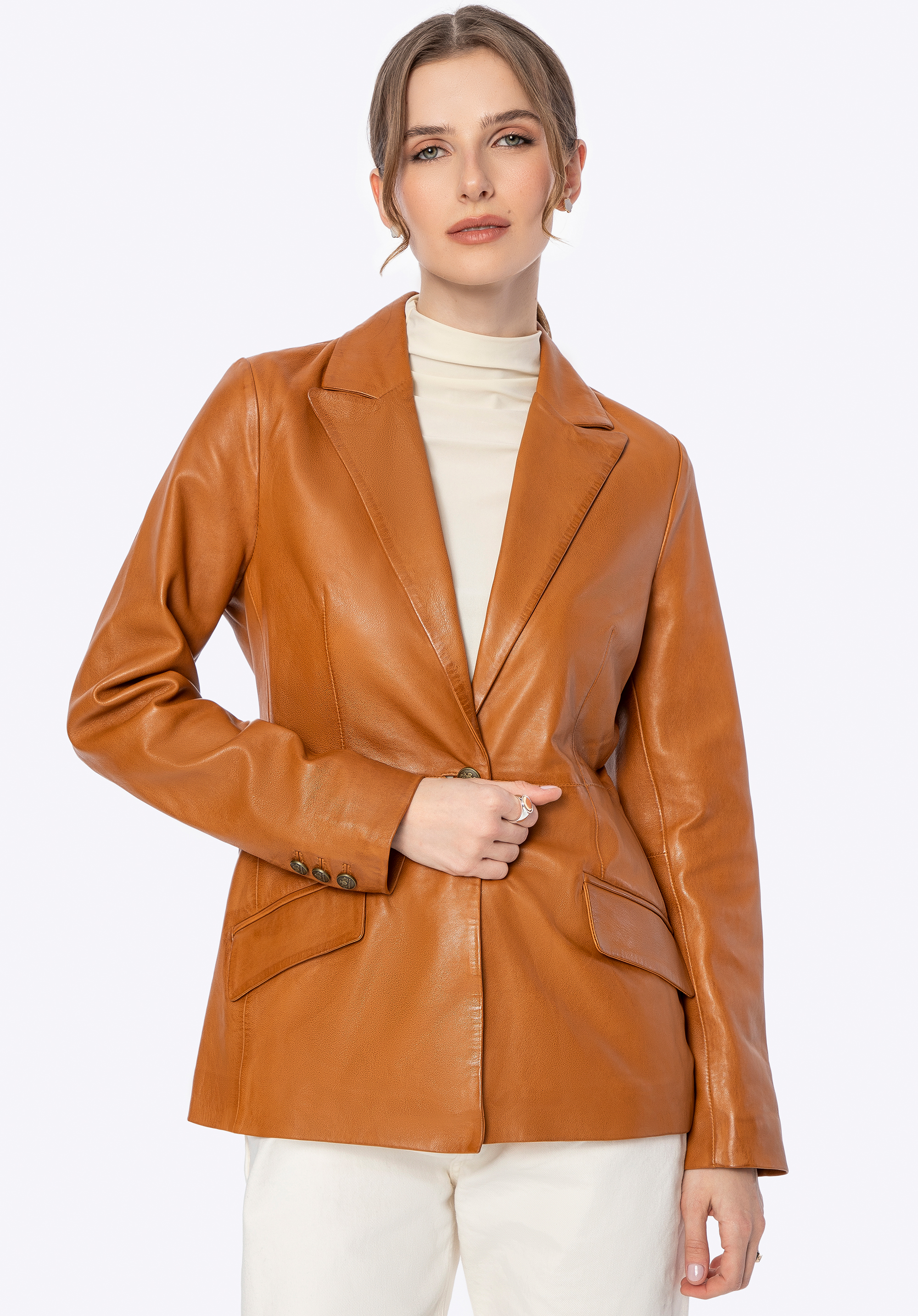 Luksus, który mówi sam za siebie. Ta wyjątkowa kurtka w fasonie marynarki z naturalnej skóry owczej to kwintesencja ponadczasowego stylu i nowoczesnej elegancji. Każdy detal – od prestiżowych metalowych guzików sygnowanych logo producenta po dopracowany, elegancki fason – został zaprojektowany z myślą o kobietach, które cenią doskonałą jakość i wyrafinowany styl. Taliowany krój pięknie podkreśla sylwetkę, a kołnierz rewers nadaje całości wyrafinowanego charakteru.