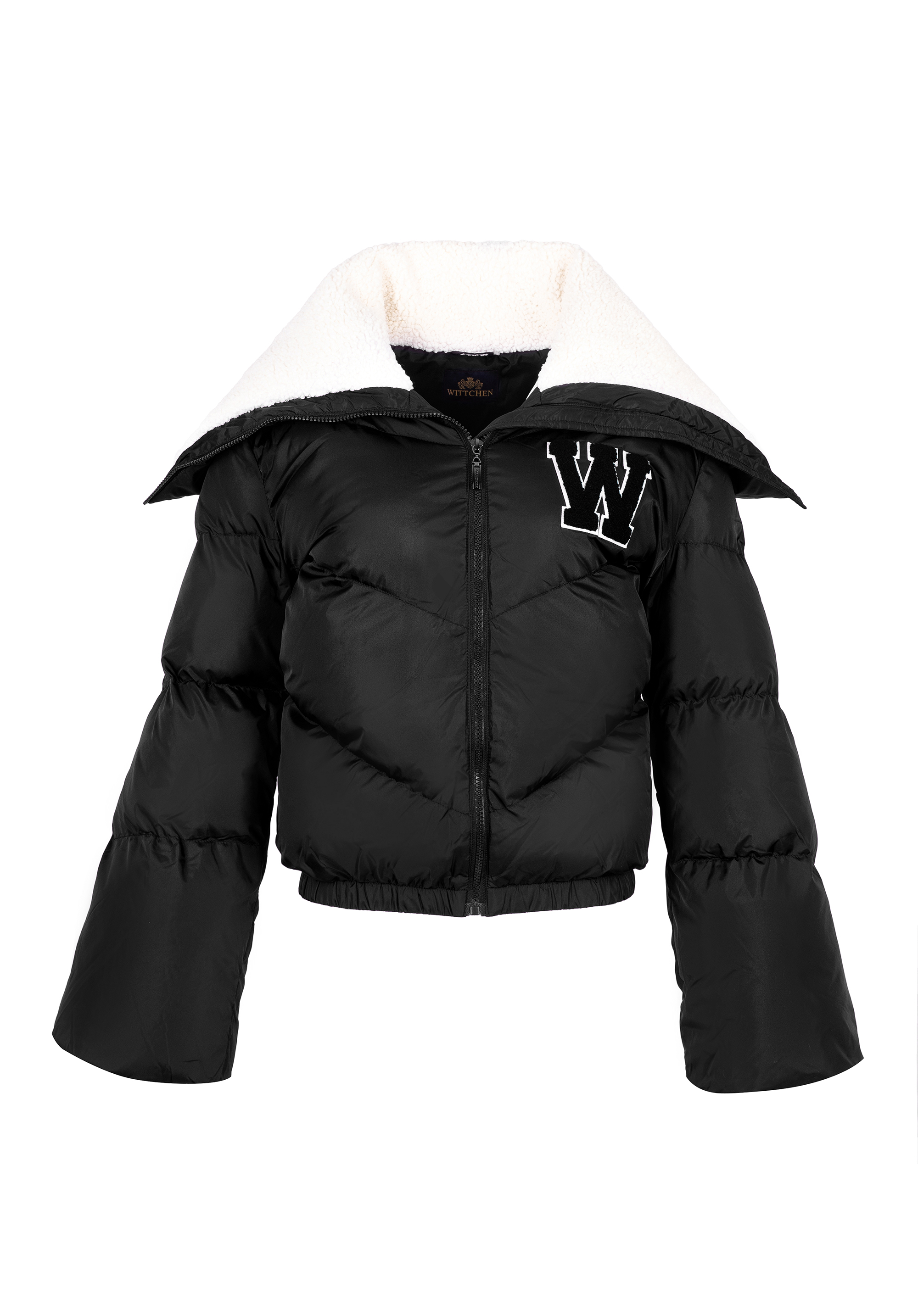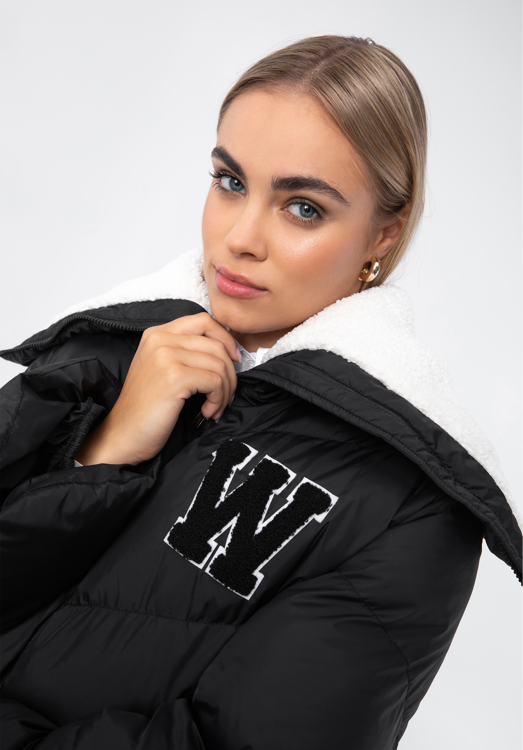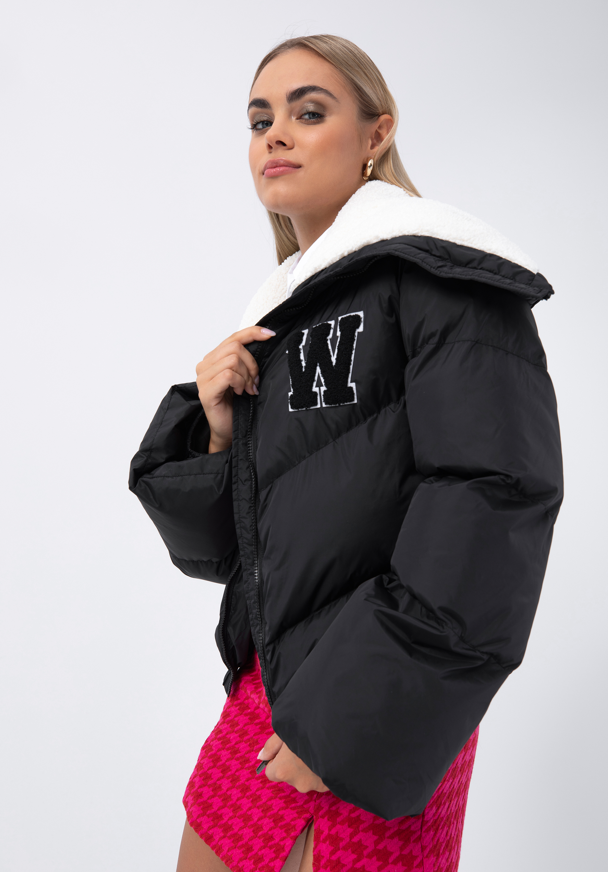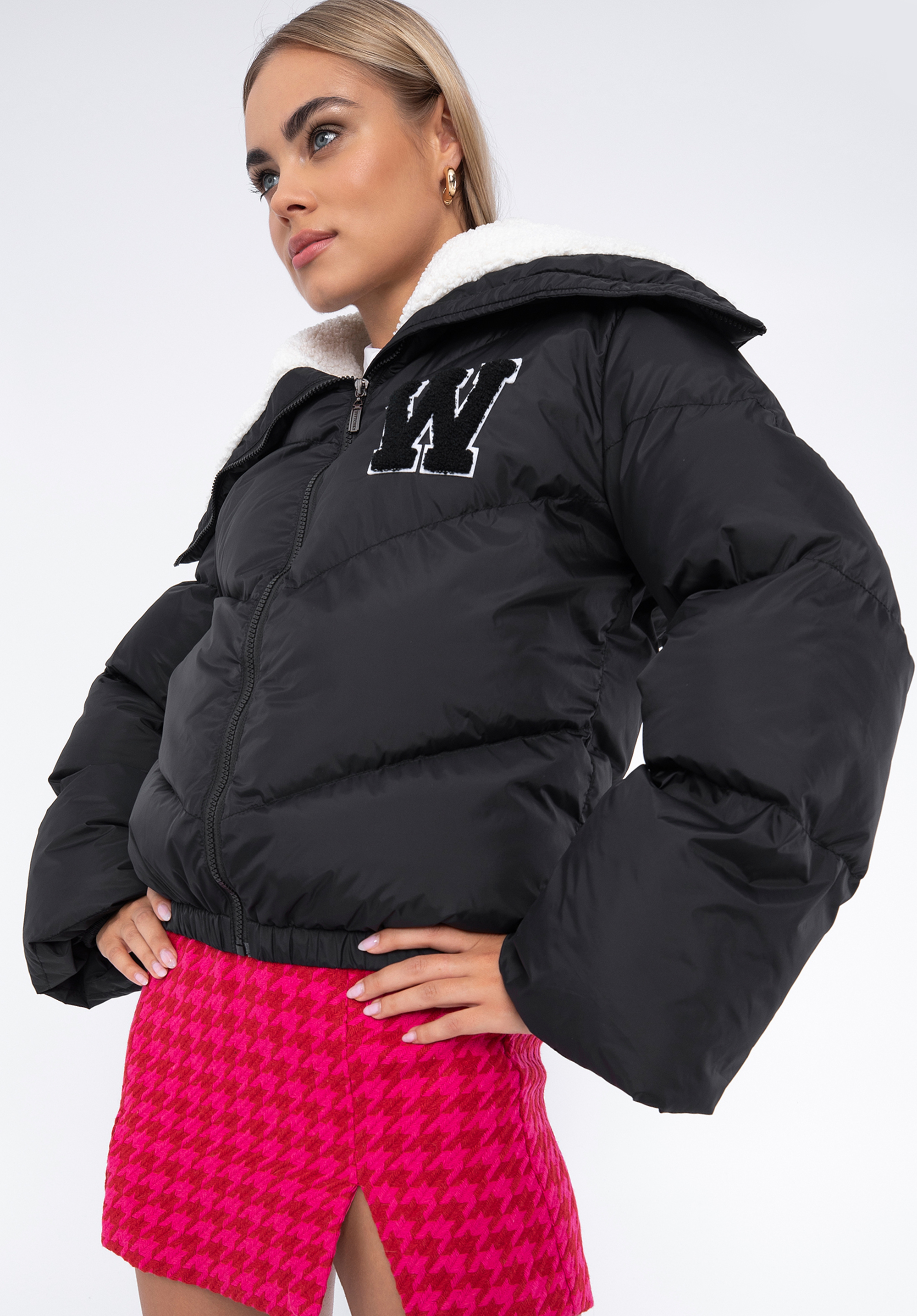 Duży kołnierz podszyty sztucznym barankiem oraz wyszyta literka „W” dodaje całości wyjątkowego charakteru. Ten model jest
