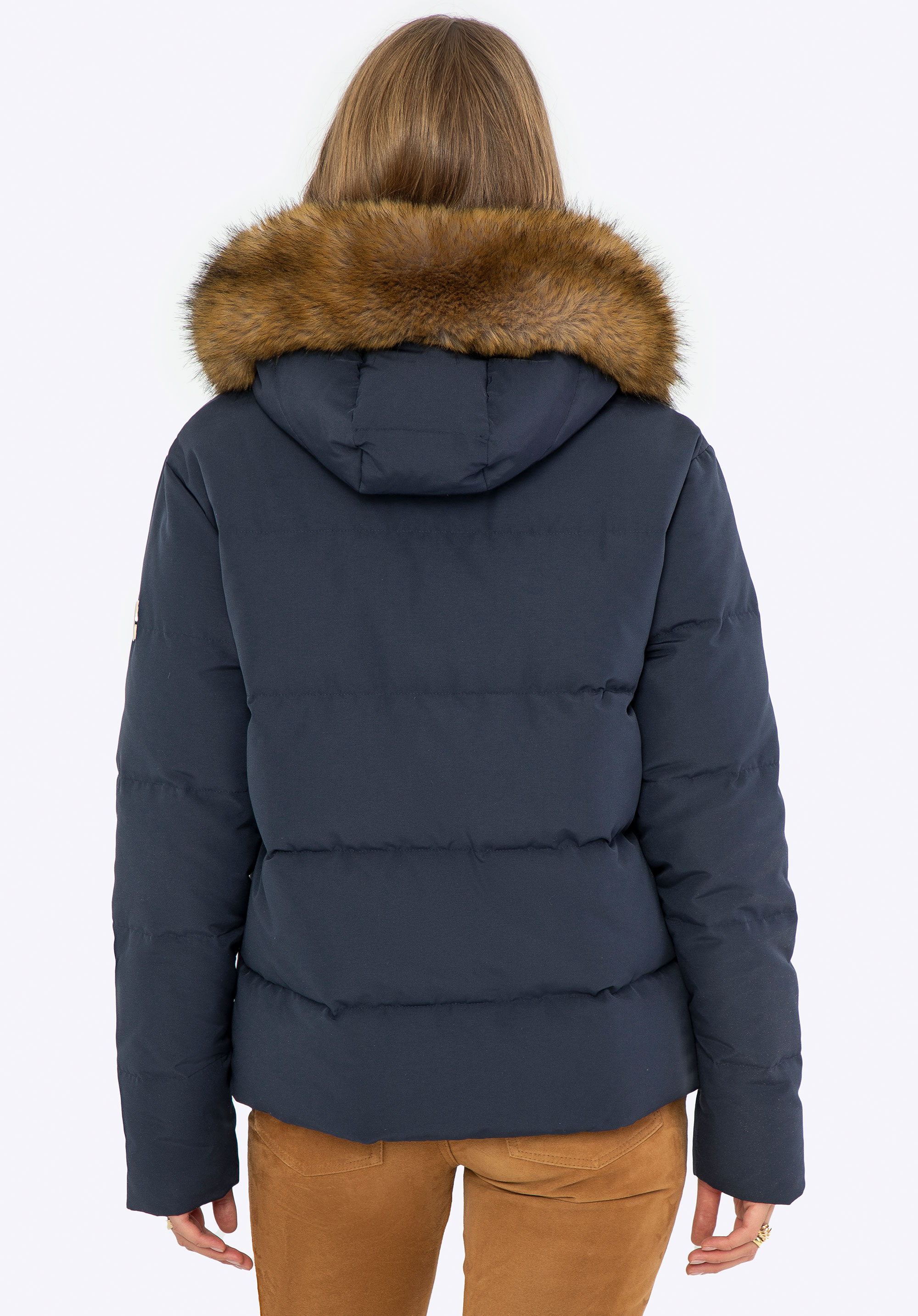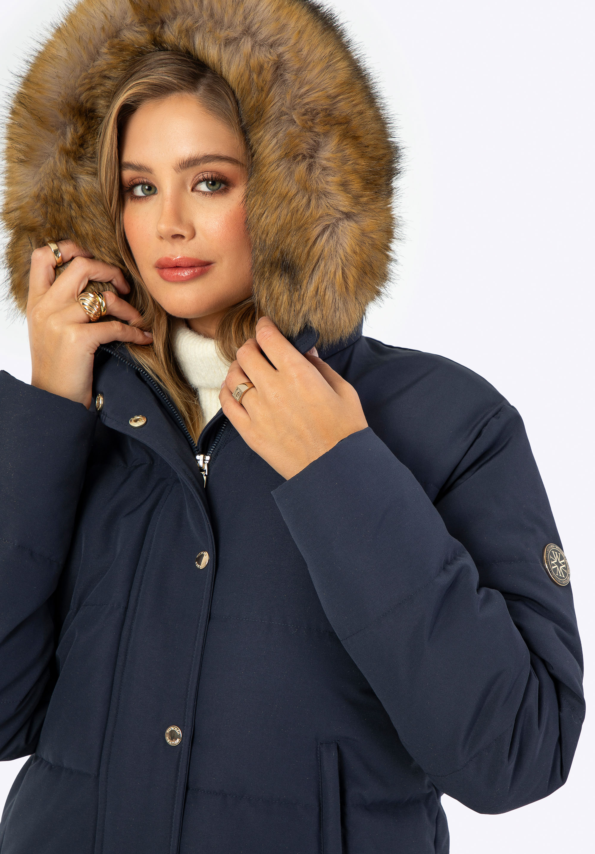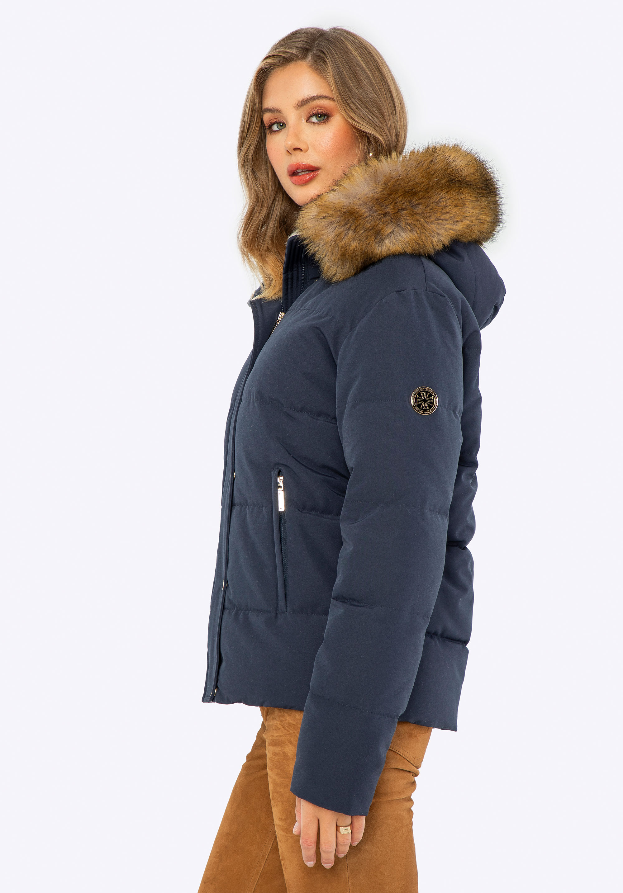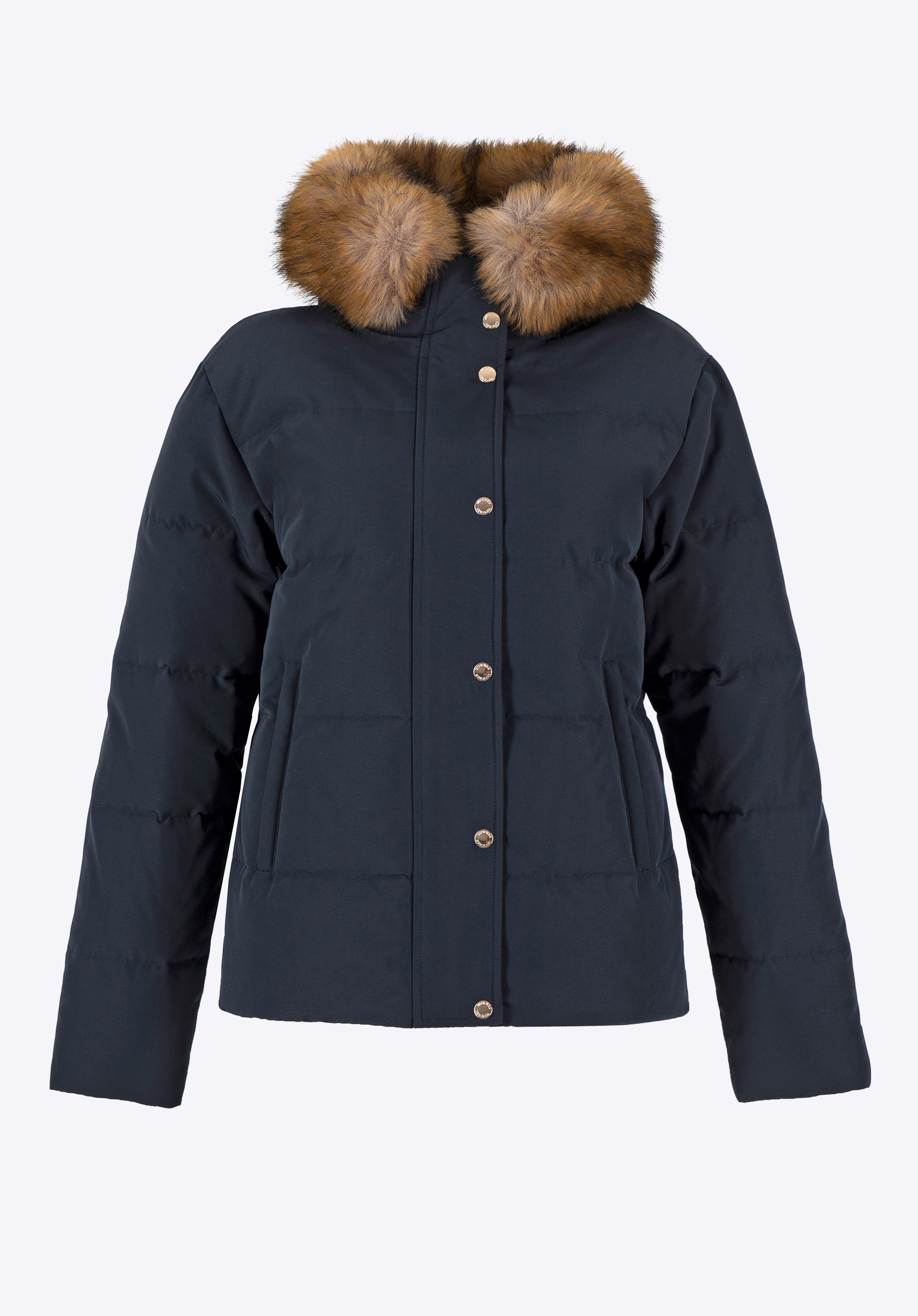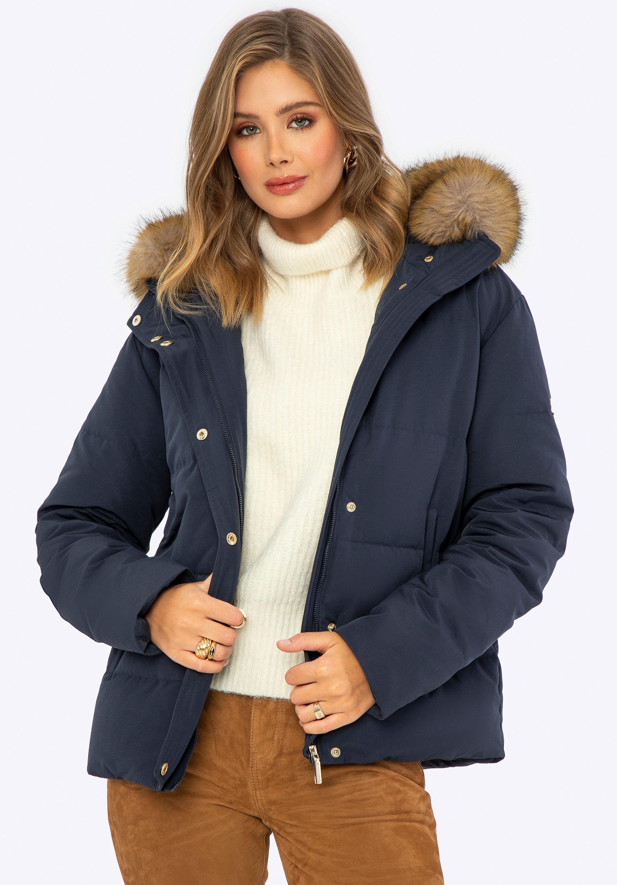 Damska kurtka puchowa z futerkowym kapturem granatowa