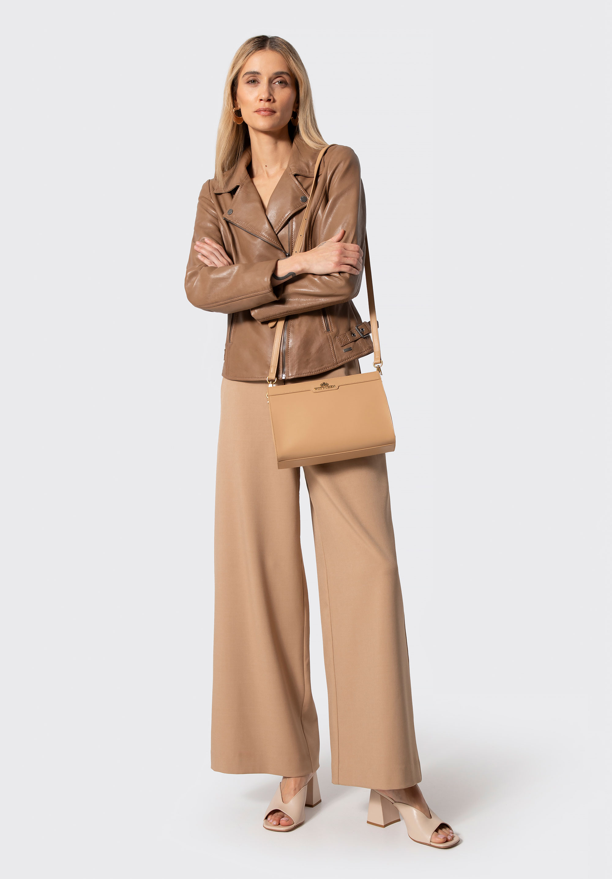 Kurtka, która od pierwszego założenia dodaje charakteru każdej stylizacji i sprawia, że czujesz się pewnie w każdej sytuacji. Wykonana z naturalnej skóry owczej zachwyca miękkością, szlachetną strukturą i dopracowanym wykończeniem. Taliowany krój subtelnie podkreśla sylwetkę, a ukośny zamek oraz ozdobne napy na kołnierzu nadają jej nowoczesny, lekko drapieżny wyraz. To ramoneska, która harmonijnie łączy luksusowy wygląd z codziennym komfortem – ponadczasowa inwestycja w styl na lata.