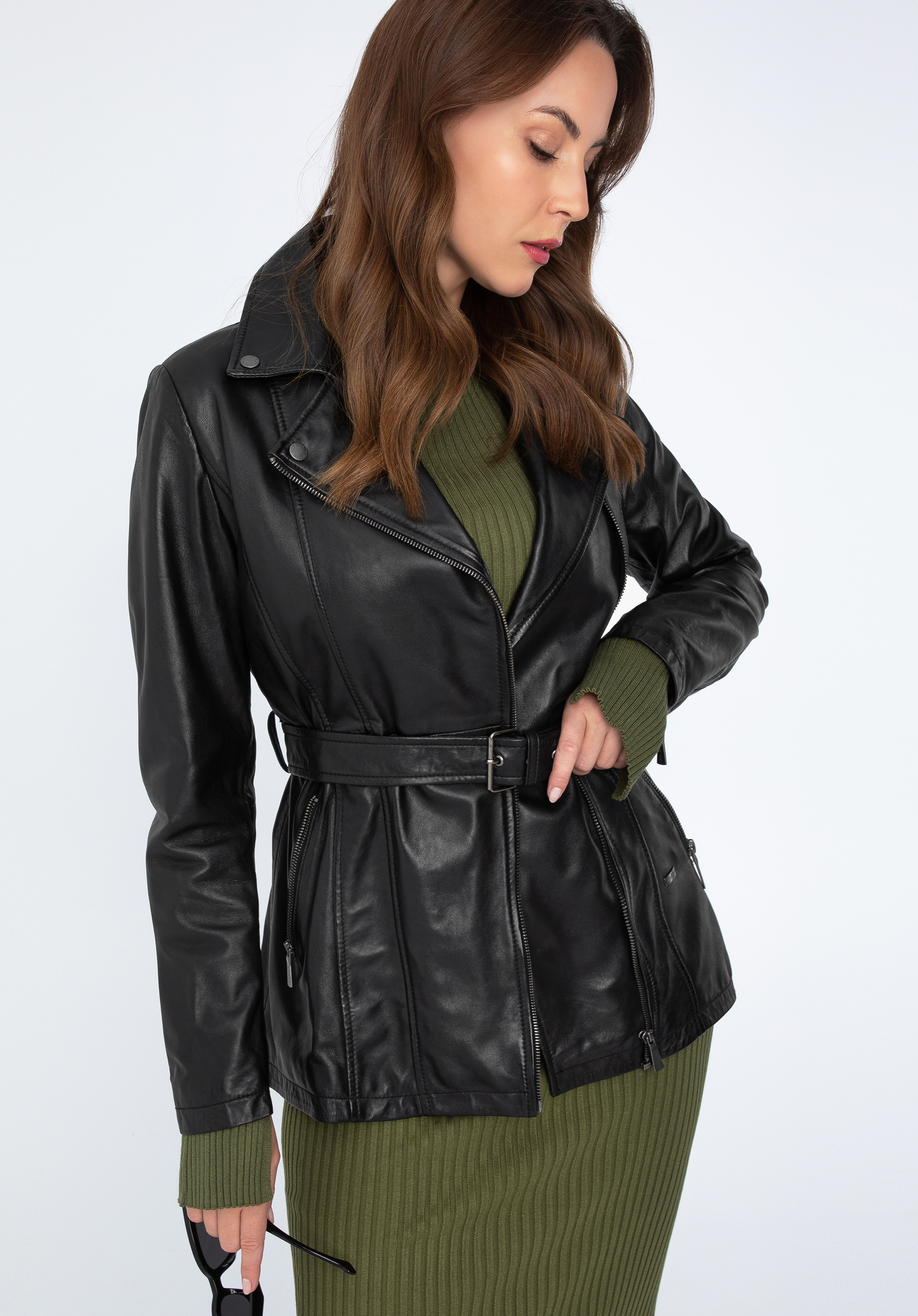 z wysokiej jakości skóry naturalnej, bardzo przyjemnej w dotyku. Noś go do ulubionej minisukienki lub casualowego zestawu z dżinsami i bluzą – w każdej sytuacji będziesz wyglądała stylowo. Damska kurtka skórzana z paskiem to dodatek, który przyda Ci się na każdy dzień jesieni i wiosny.