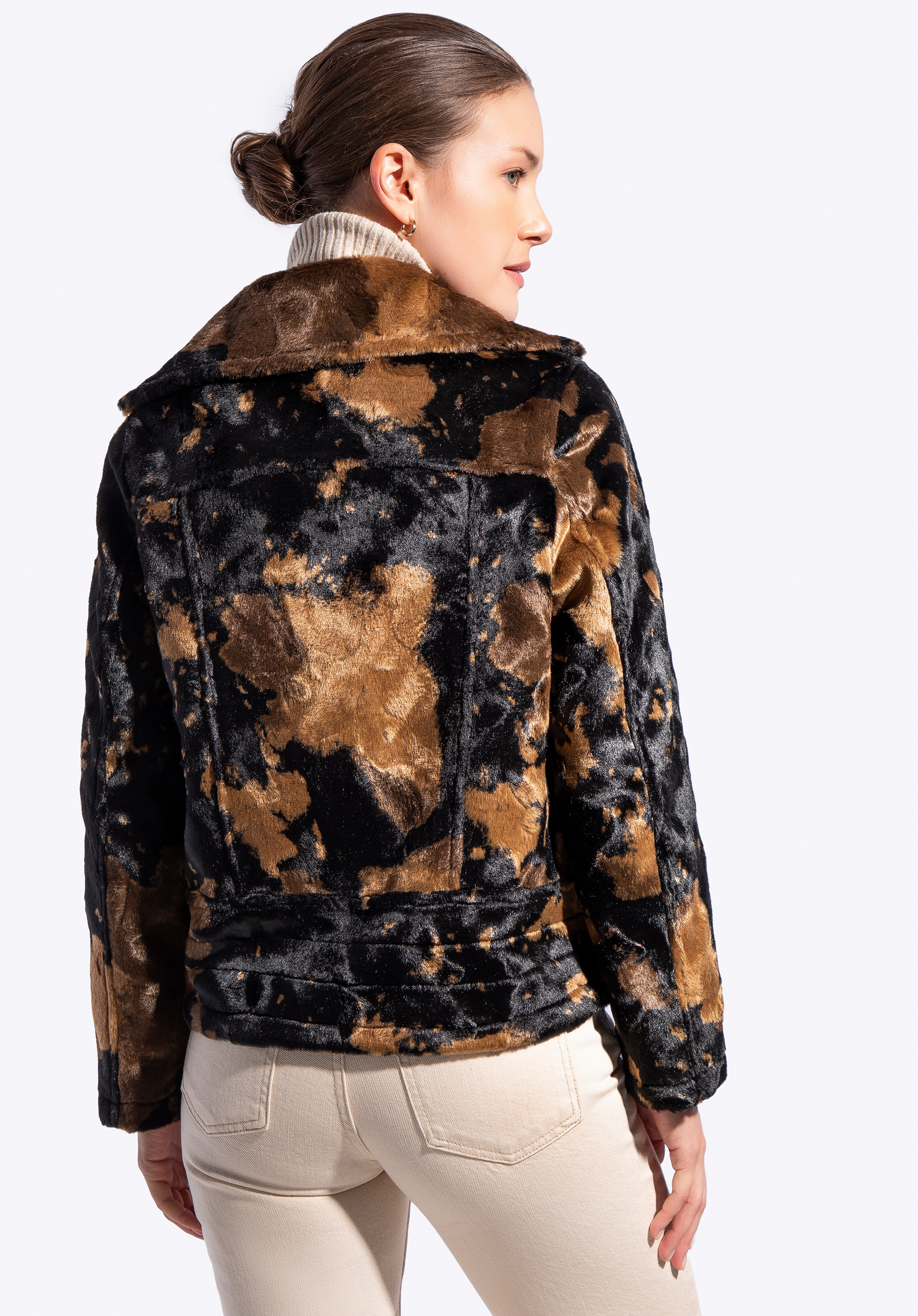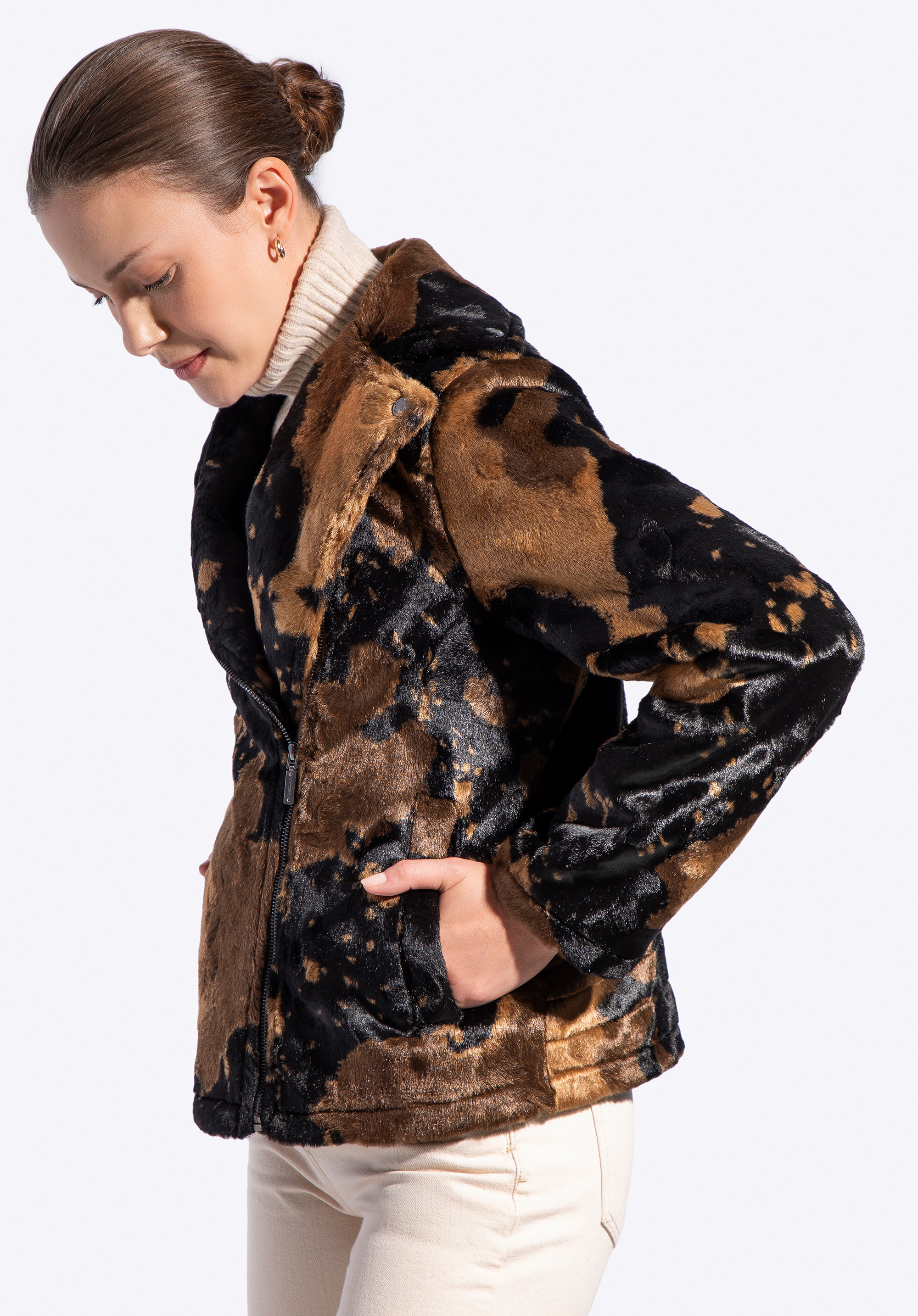 Postaw na styl, który przyciąga spojrzenia. Ta damska kurtka oversize z miękkiego, sztucznego futerka we wzór inspirowany krowimi łatami to niebanalne połączenie komfortu i mody. Luźny fason zapewnia swobodę ruchów i miejski luz, a prosty zamek z przodu podkreśla minimalistyczną formę. Kołnierz zaprojektowano tak, aby efektownie komponował się z całością, dodając charakteru każdej stylizacji.