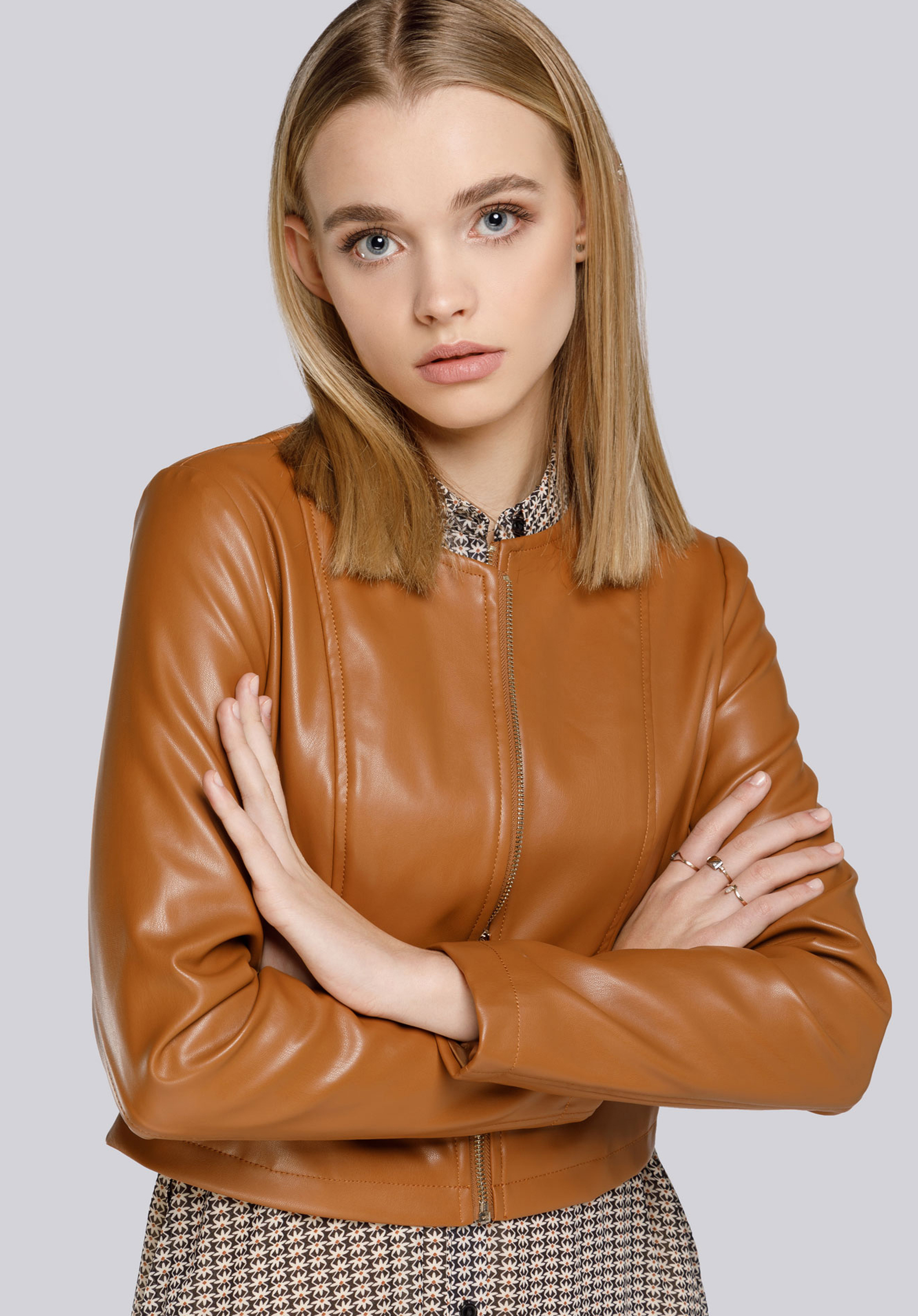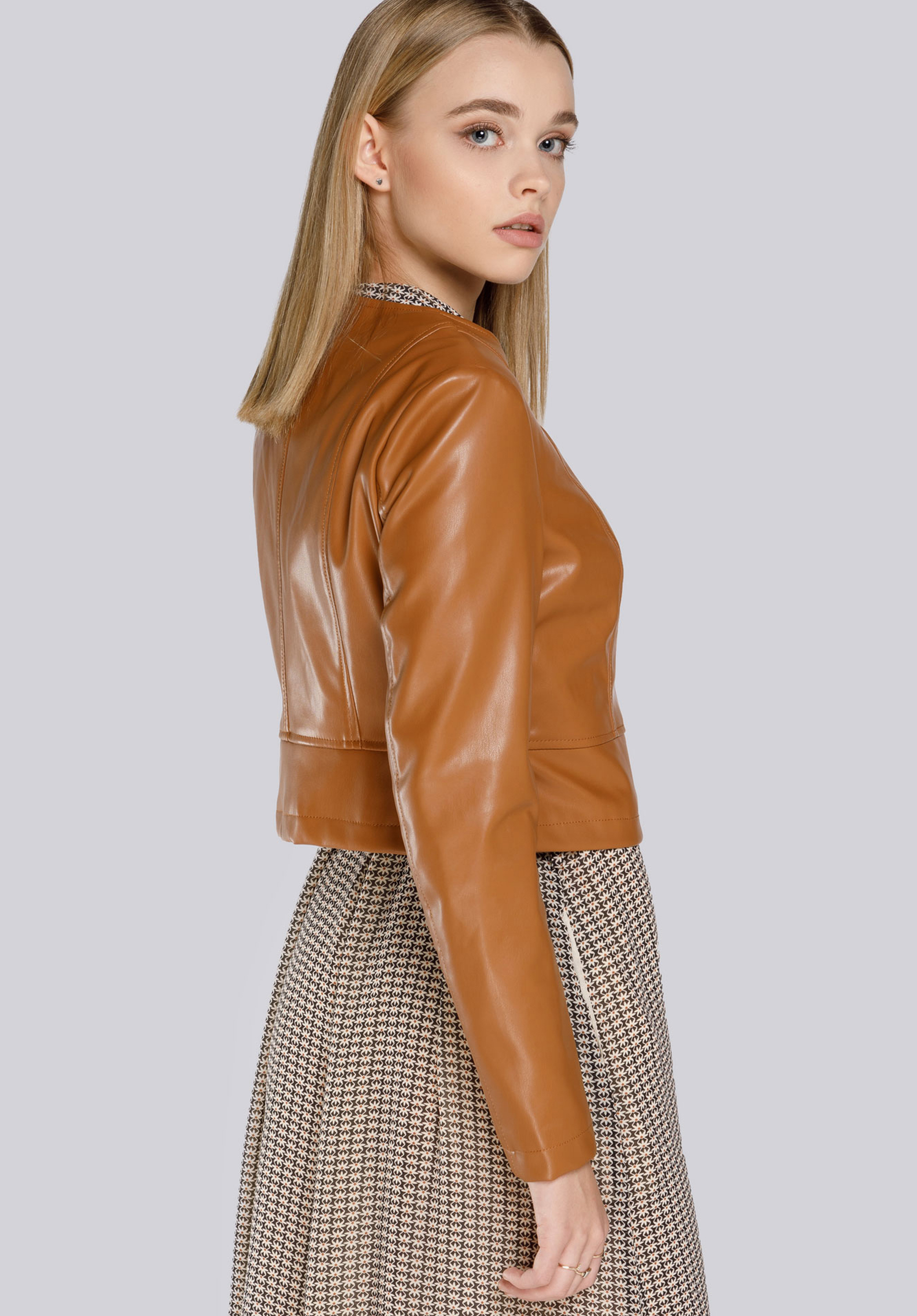 Damska kurtka z ekoskóry krótka sprawdzi się do pracy i na eleganckie spotkania, gdy szukasz zgrabnego okrycia podkreślającego talię. Prosty krój z zaokrąglonym dekoltem i miękka ekoskóra tworzą ponadczasową bazę, która pięknie domyka zarówno sukienki, jak i zestawy z dżinsami.