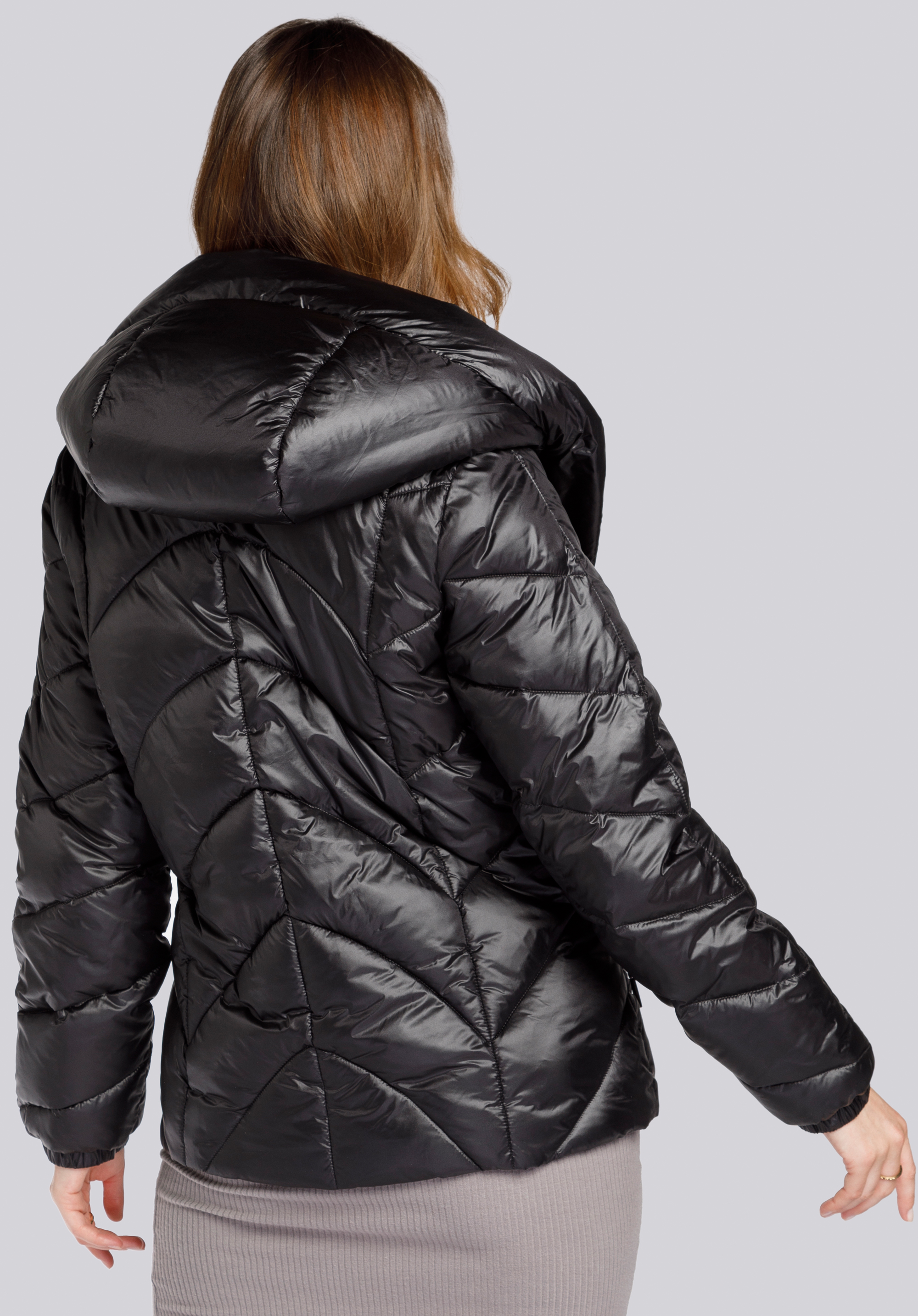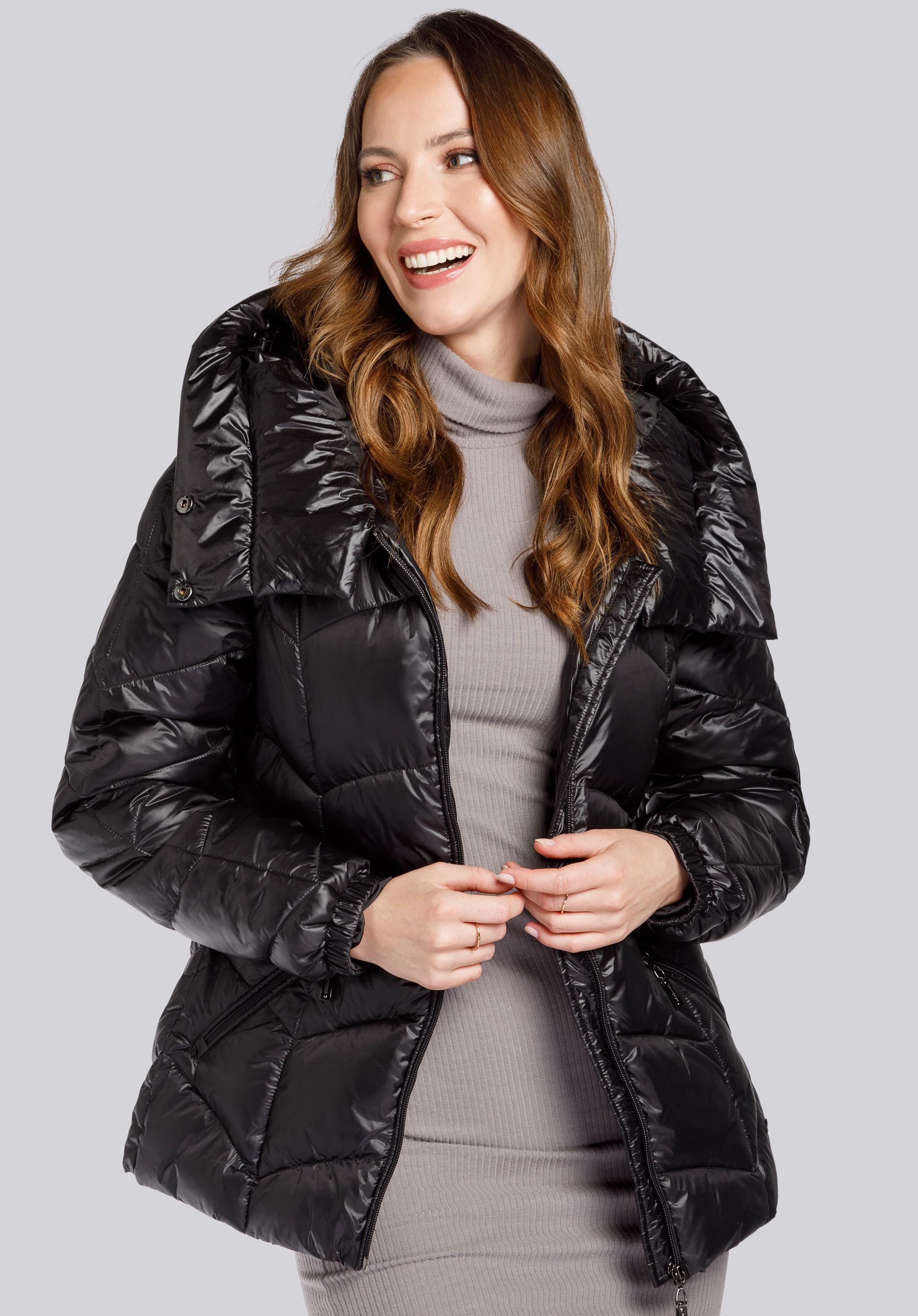 Damska kurtka z nylonu z pikowaniem w zygzaki to doskonały dodatek do Twoich jesiennych i zimowych stylizacji, zwłaszcza że pasuje zarówno do strojów casualowych, jak i szykownych sukienek. Ma wygodną długość do bioder, dzięki czemu zachowasz pełną swobodę ruchów. Jest to zarówno kurtka jesienna, jak i zimowa - w zależności od tego, co założysz pod spód. Uszyta jest wysokogatunkowego nylonu o delikatnym połysku. Po bokach znajdziesz dwie ukośne kieszenie z zapięciem na suwak. Kurtka ma obszerny, miękki kaptur z wypełnieniem, który zapniesz pod szyją, tworząc szeroką stójkę. Ta połyskliwa pikowana kurtka z nylonu wygląda efektownie i przyjemnie otuli Cię w czasie jesiennych i zimowych chłodów.