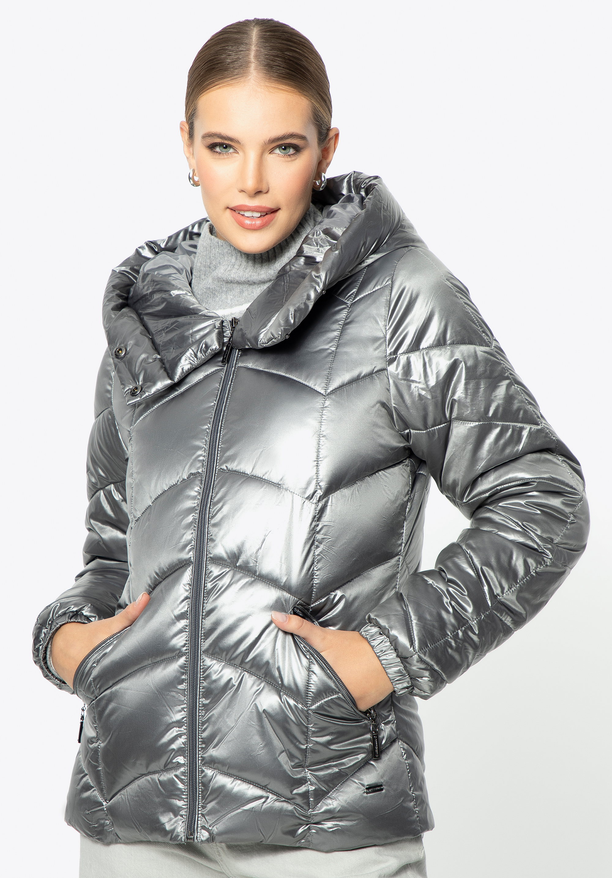 Damska kurtka z nylonu pikowana w zygzaki srebrna