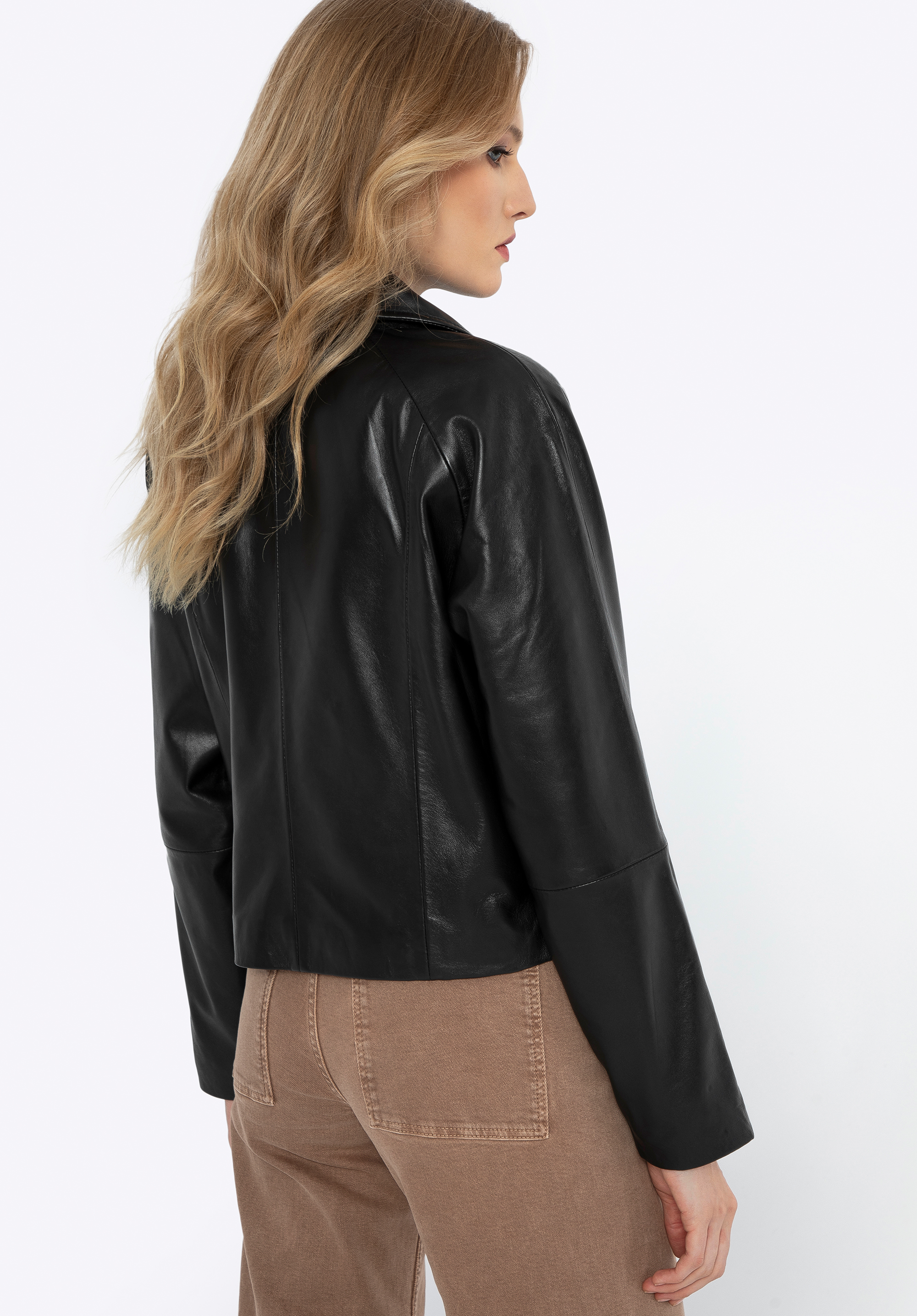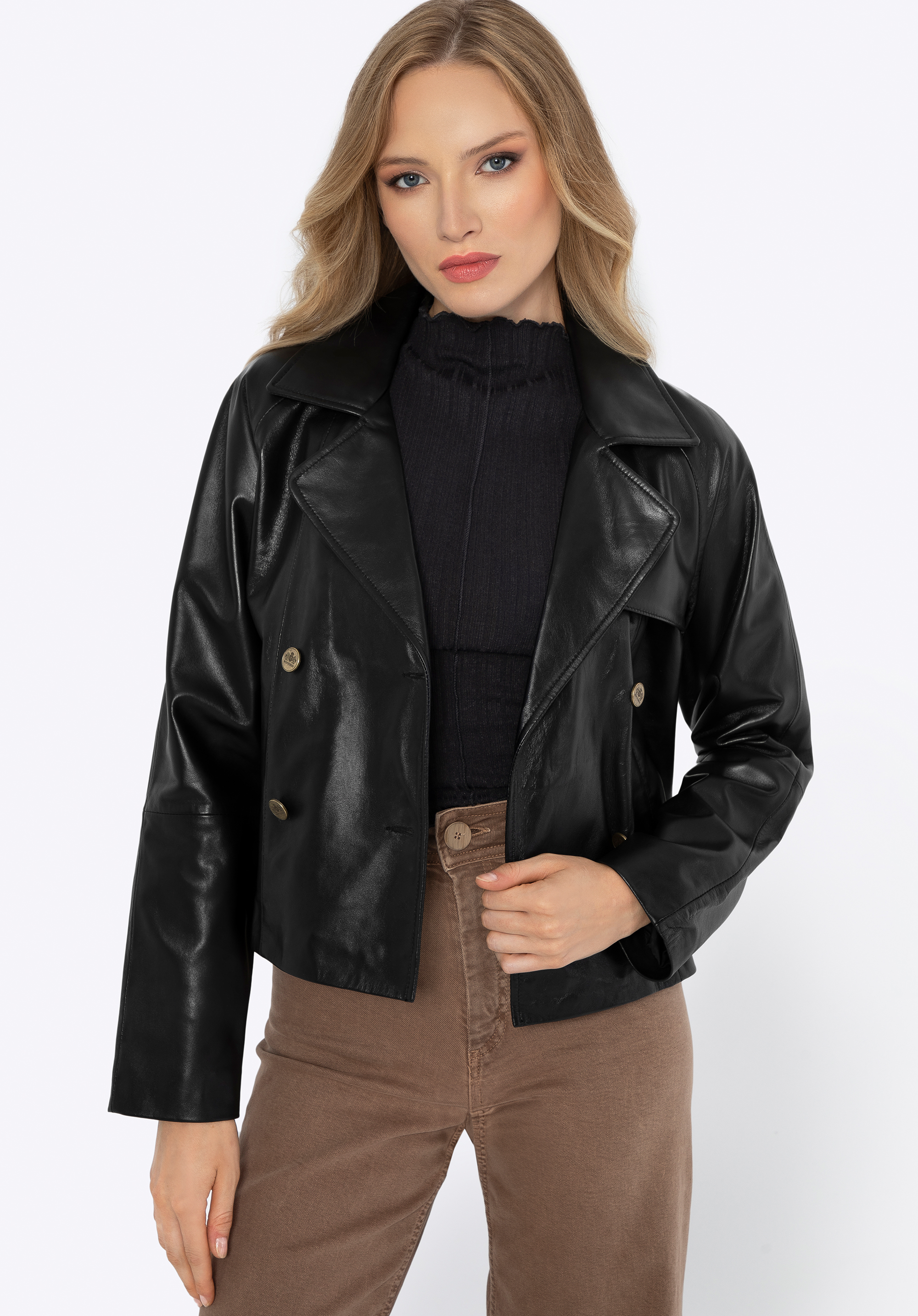 Damska kurtka ze skóry – dwurzędowa z guzikami