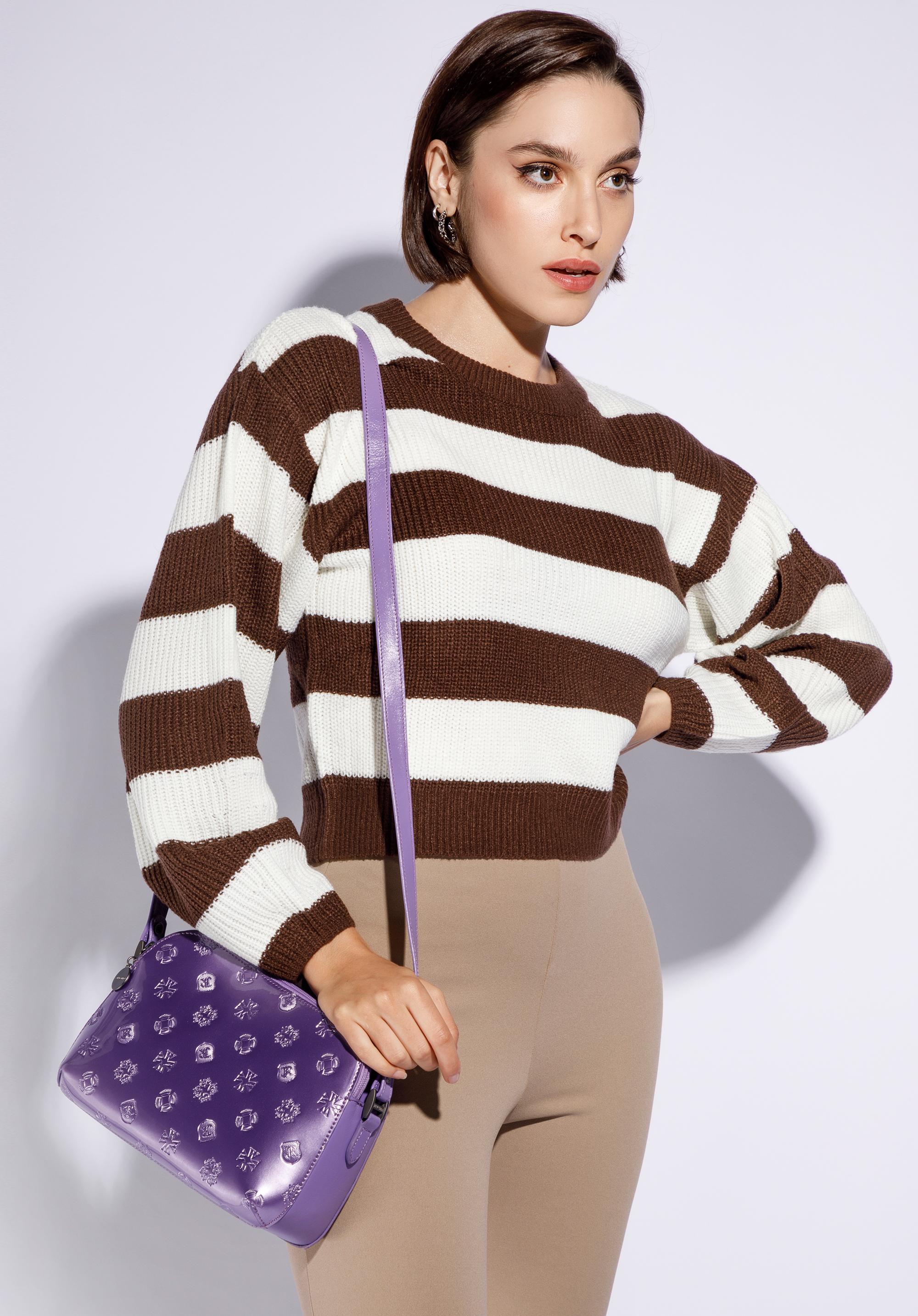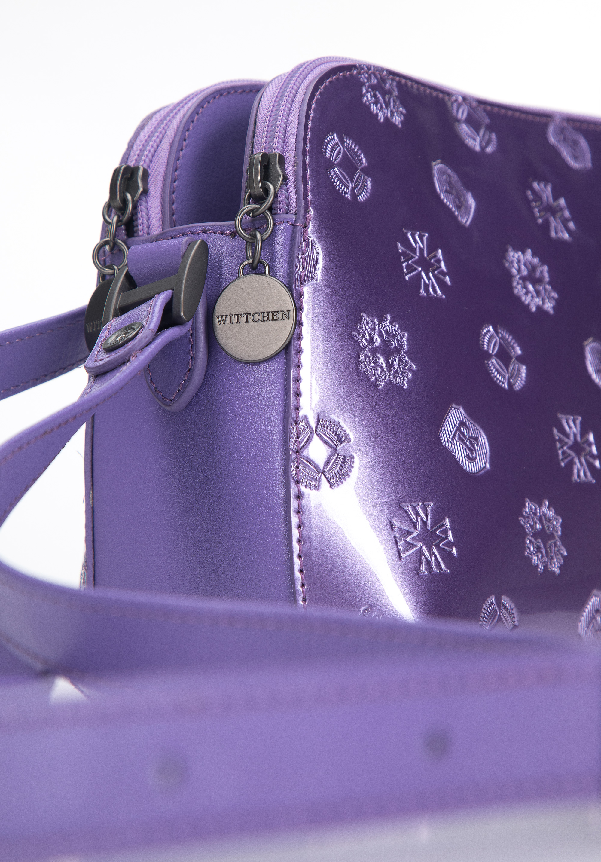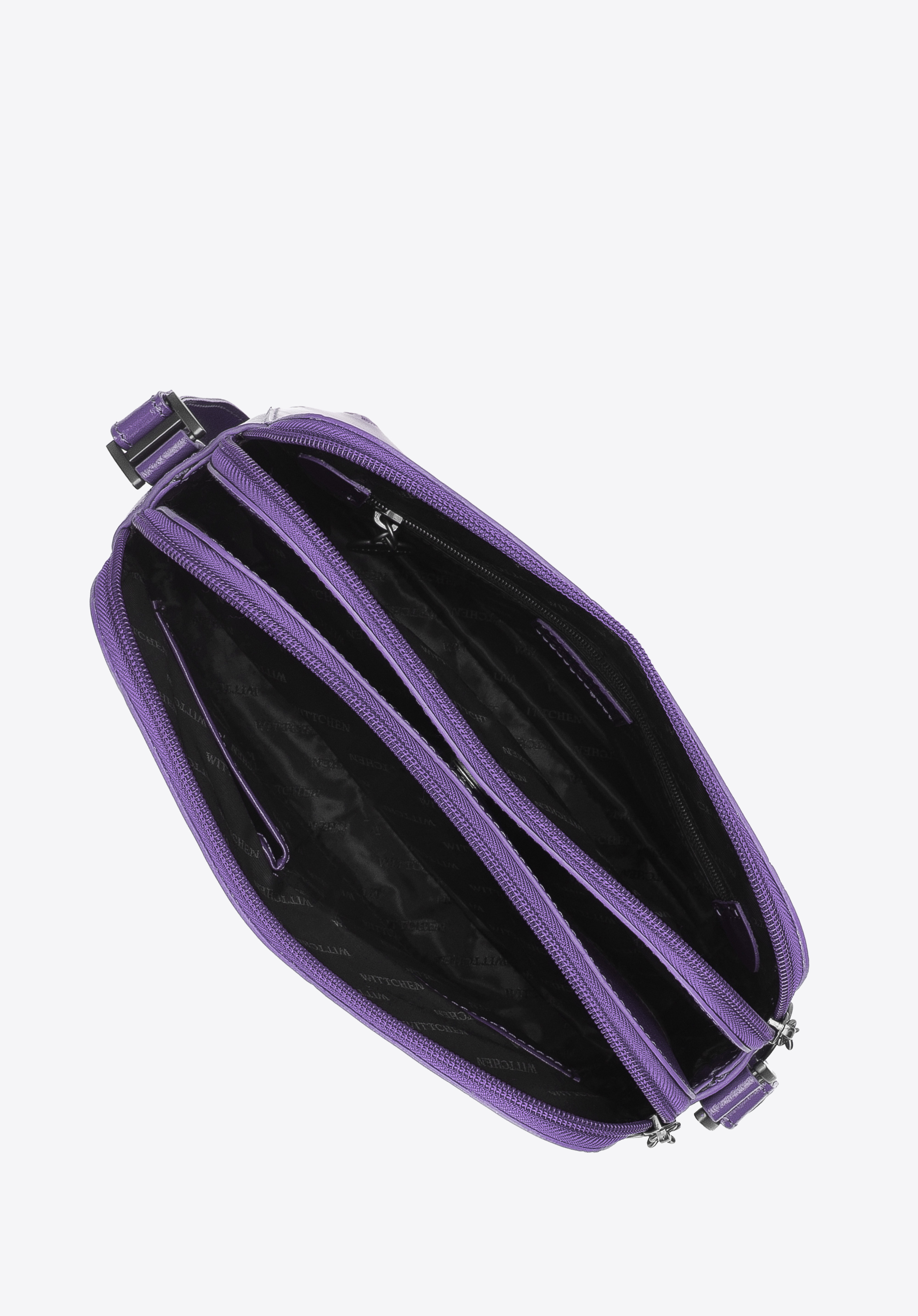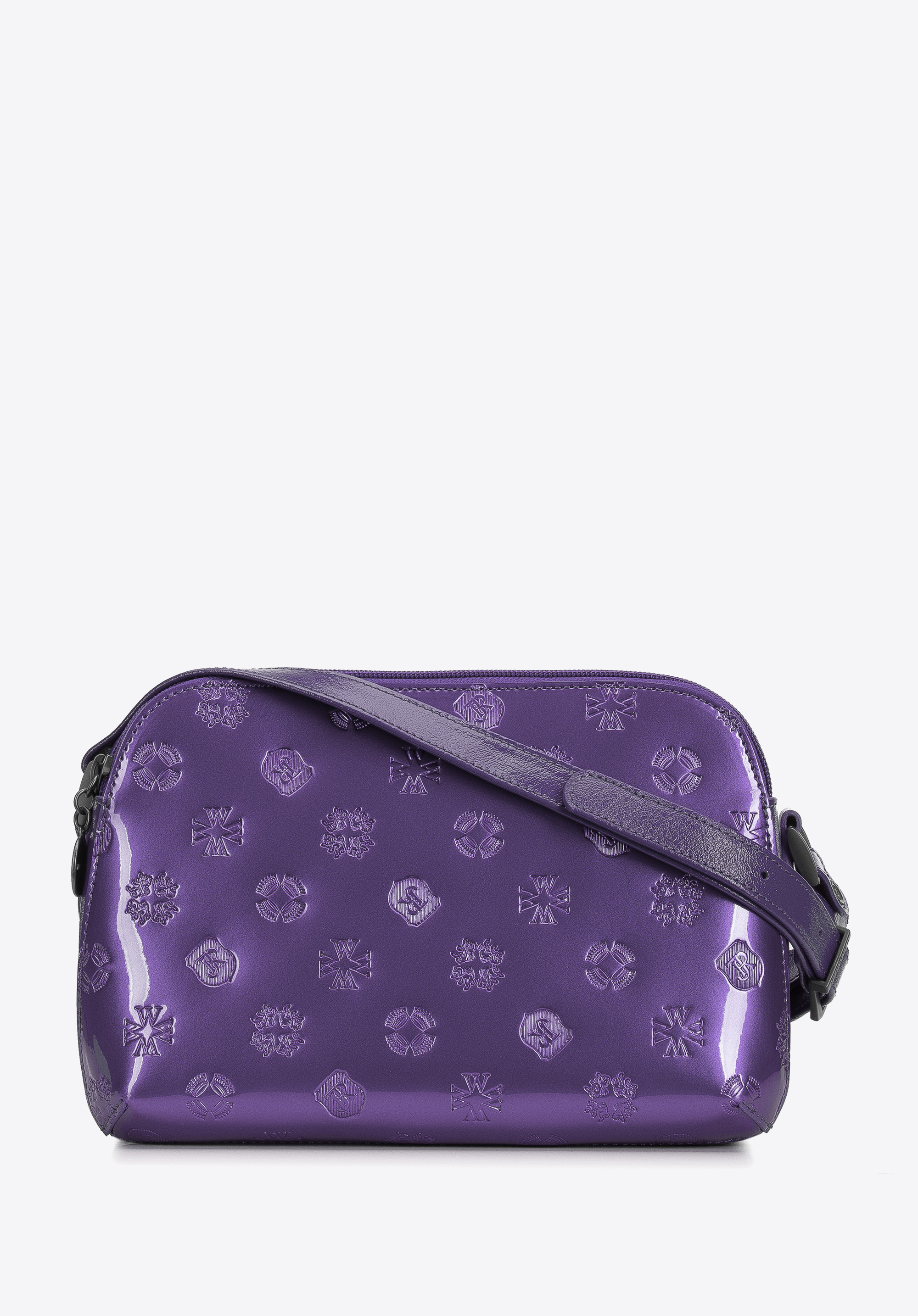Damska listonoszka skórzana lakierowana z monogramem fioletowa