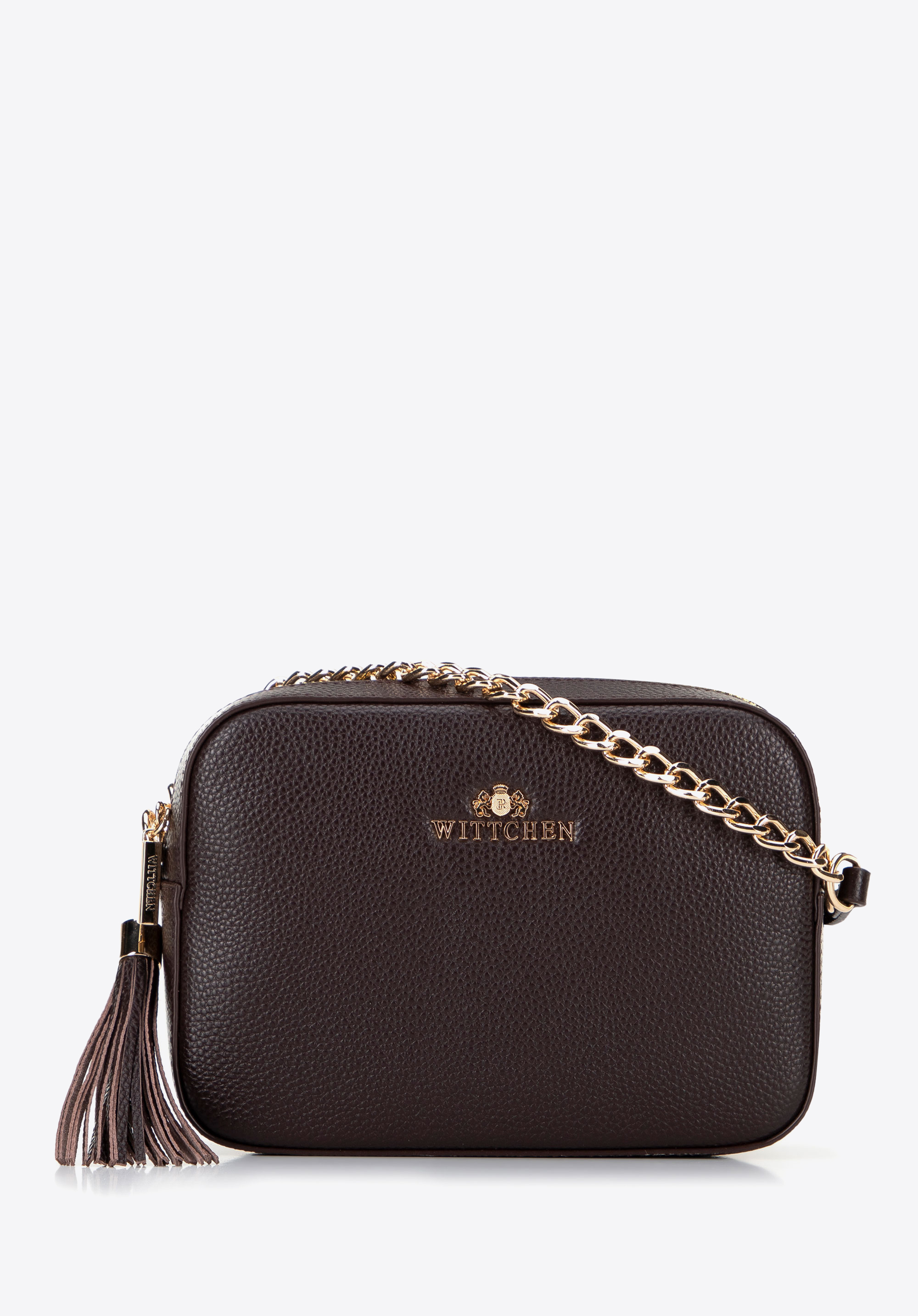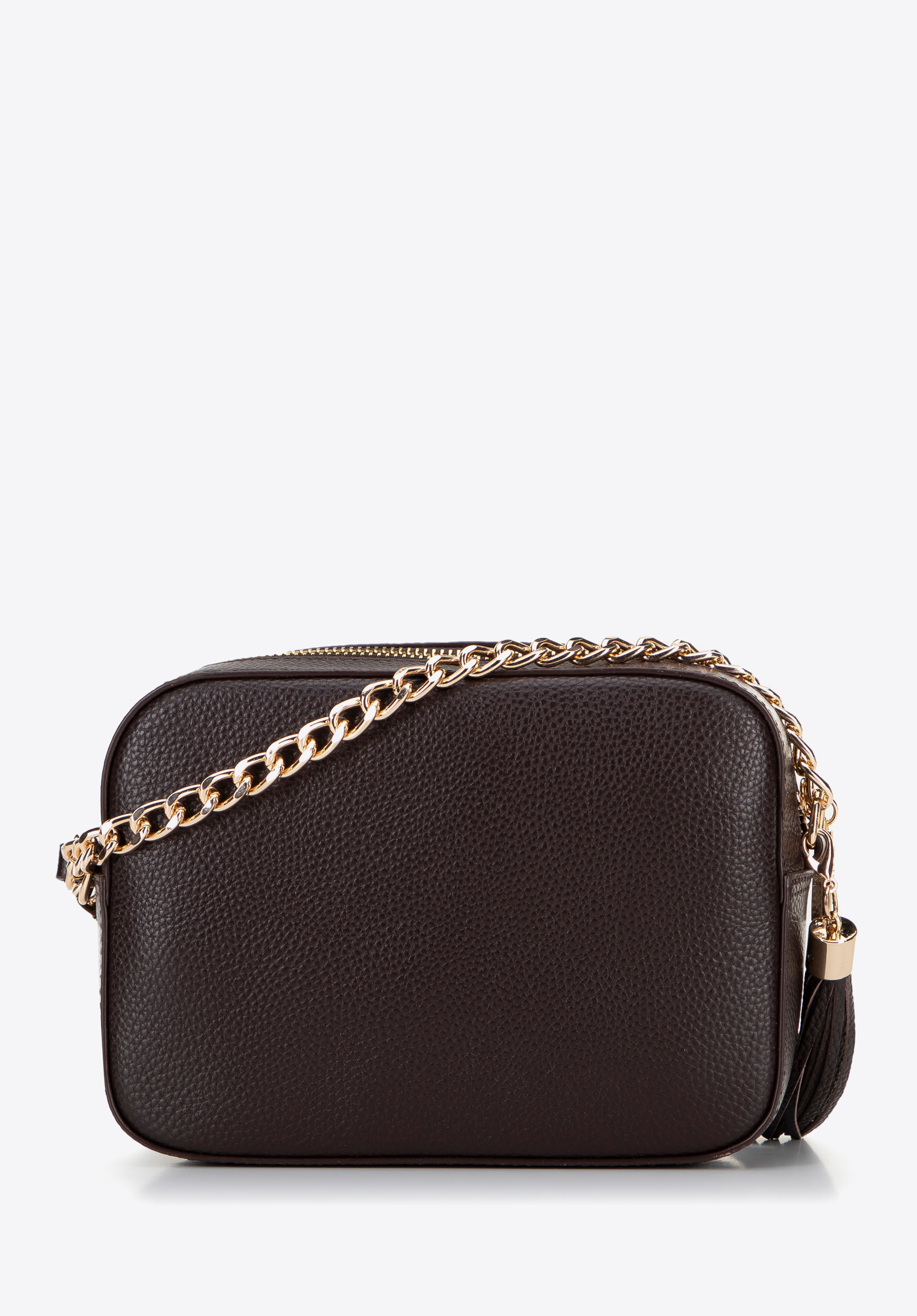 Elegancka torebka na błyszczącym łańcuszku z pudełkowym, sztywnym kształtem to perfekcyjny wybór na wyjątkowe okazje. Mimo swojej kompaktowej formy pomieści najpotrzebniejsze rzeczy, takie jak portfel, telefon, chusteczki czy krem do rąk. Wykonana z wysokiej jakości skóry naturalnej o subtelnym groszkowym wzorze, zapewnia elegancję i trwałość na długie lata.