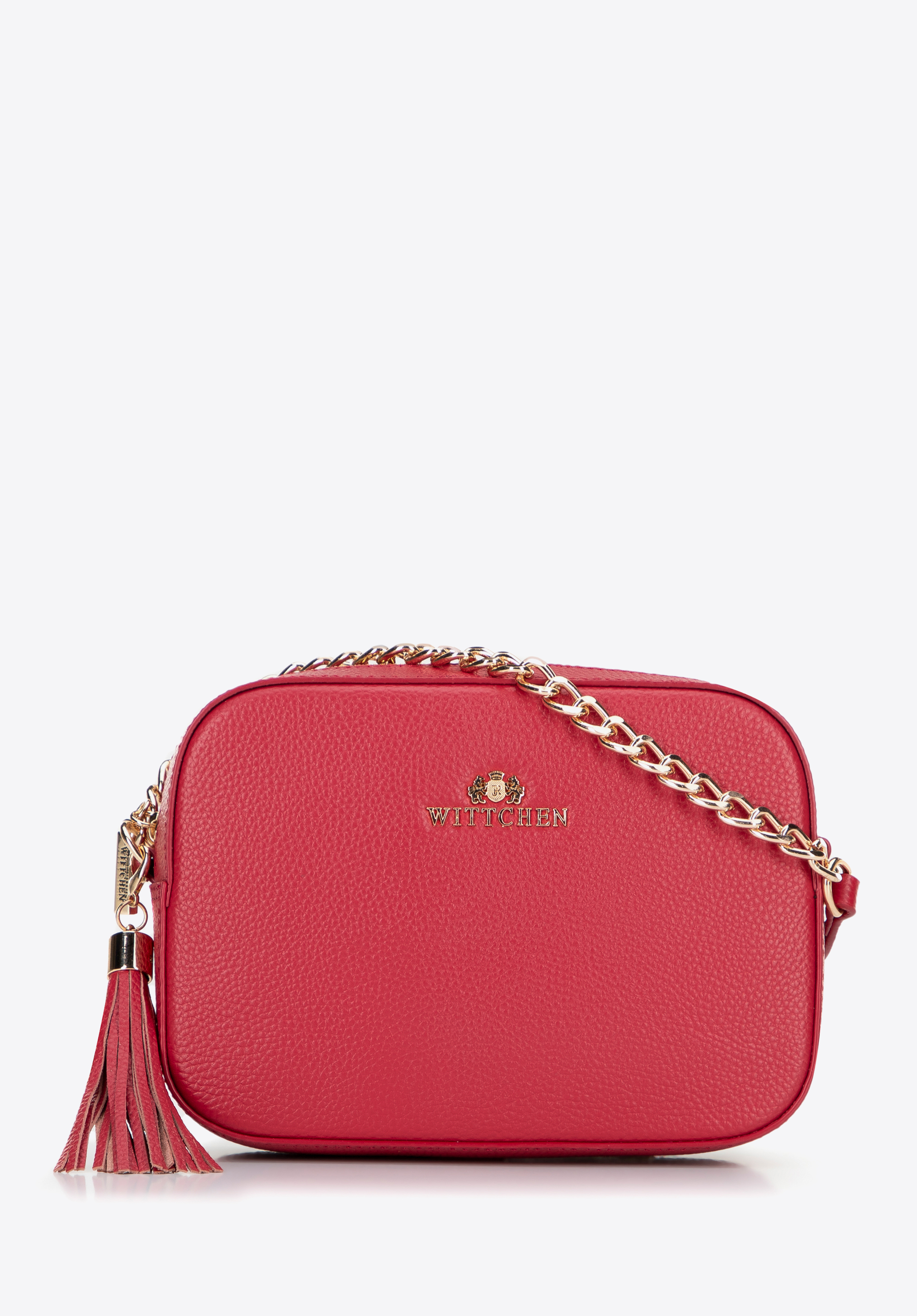 Elegancka torebka na błyszczącym łańcuszku z pudełkowym, sztywnym kształtem to perfekcyjny wybór na wyjątkowe okazje. Mimo swojej kompaktowej formy pomieści najpotrzebniejsze rzeczy, takie jak portfel, telefon, chusteczki czy krem do rąk. Wykonana z wysokiej jakości skóry naturalnej o subtelnym groszkowym wzorze, zapewnia elegancję i trwałość na długie lata.