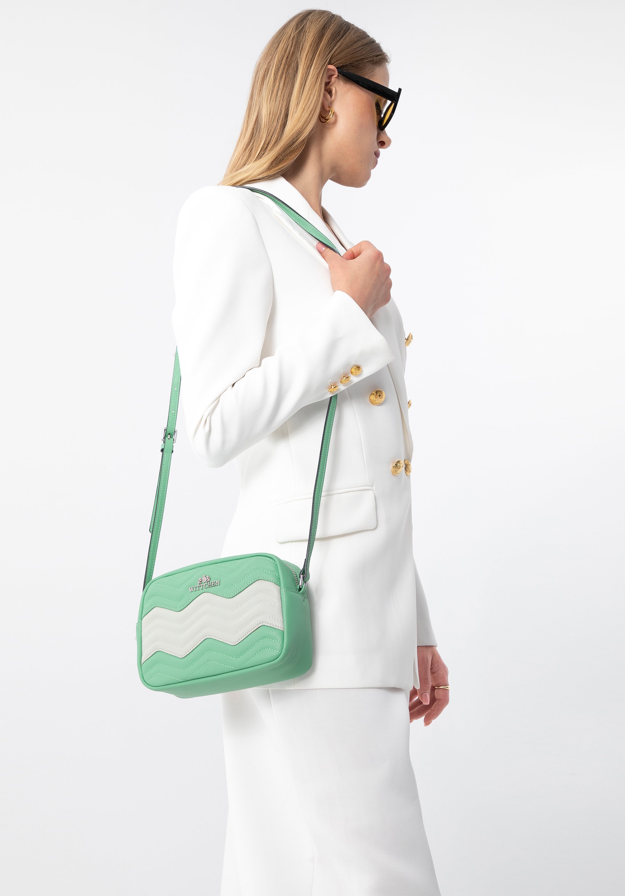Pudełkowy fason na cienkim, regulowanym pasku jest funkcjonalny i prezentuje się nowocześnie.