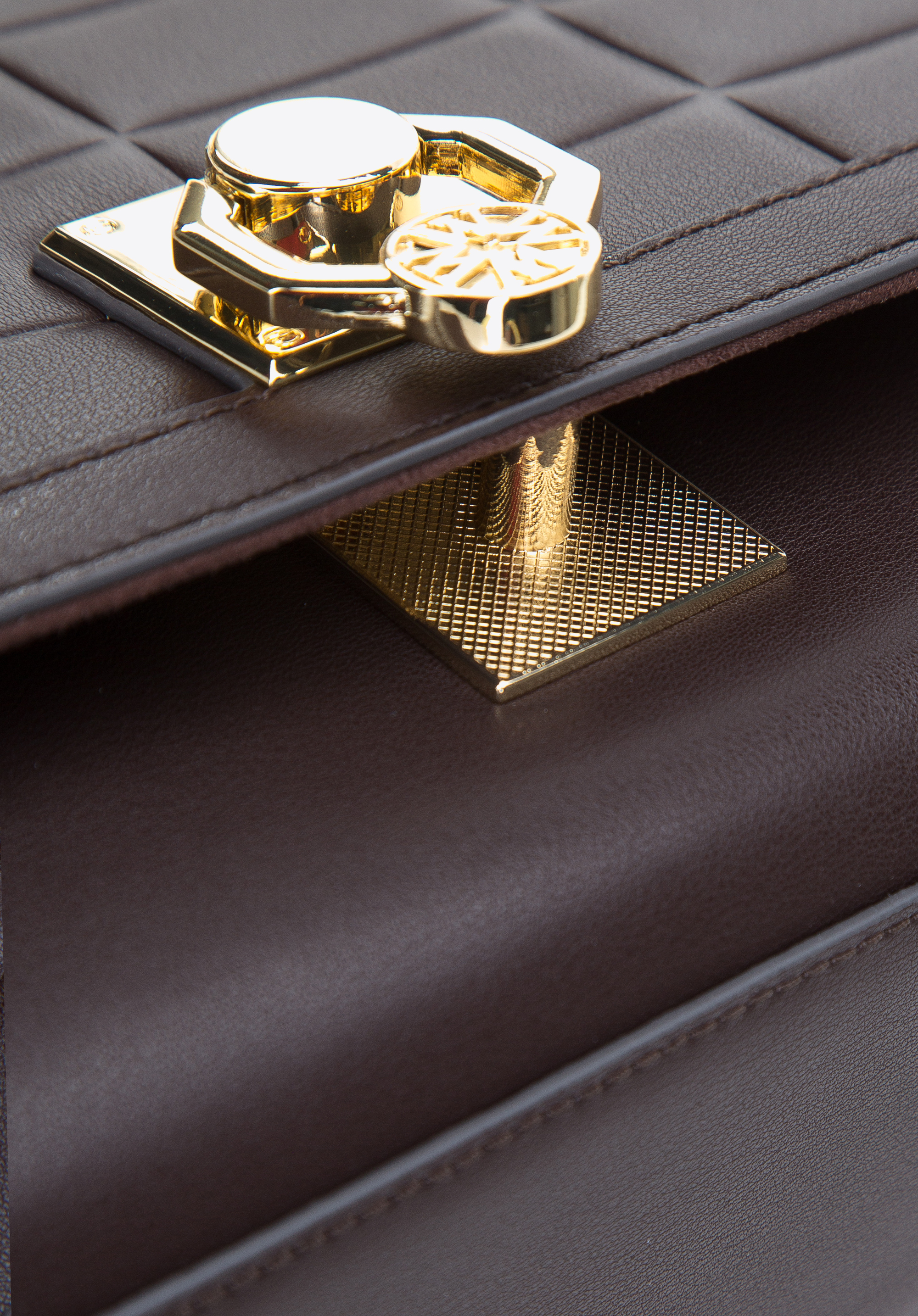 Aby otworzyć torebkę podnieś klamrę z monogramem.Wewnątrz:
