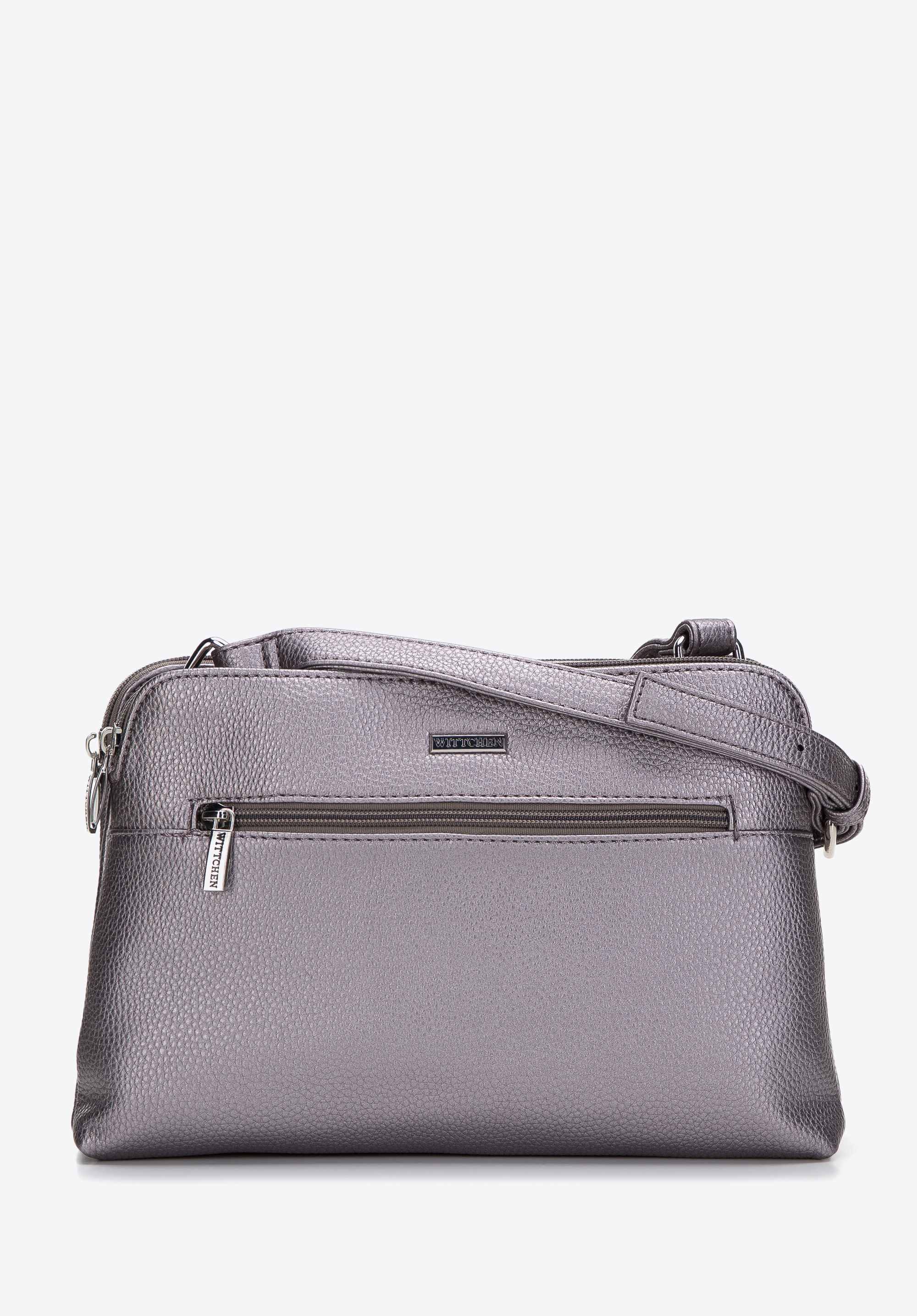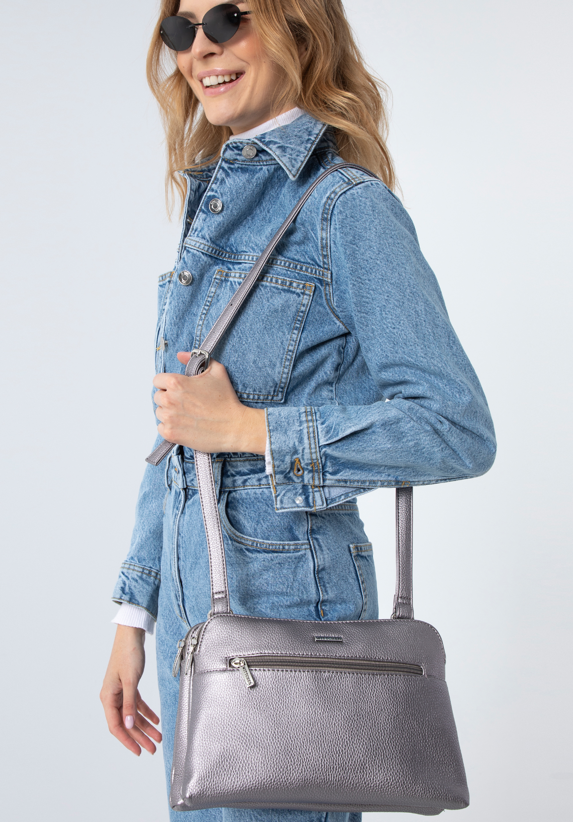 średni rozmiar podzielony na dwie praktyczne, otwierane niezależnie komory, przypominające dwie zszyte ze sobą torebki. Zmieścisz w niej telefon, portfel, małą książkę, kilka kosmetyków i inne drobiazgi, które wygodnie uporządkujesz. Prosty design będzie pasował do wielu stylów i sytuacji. Sprawdzi się i do dżinsów i koszulki, jak i do eleganckiej marynarki i szpilek. Torebka ma