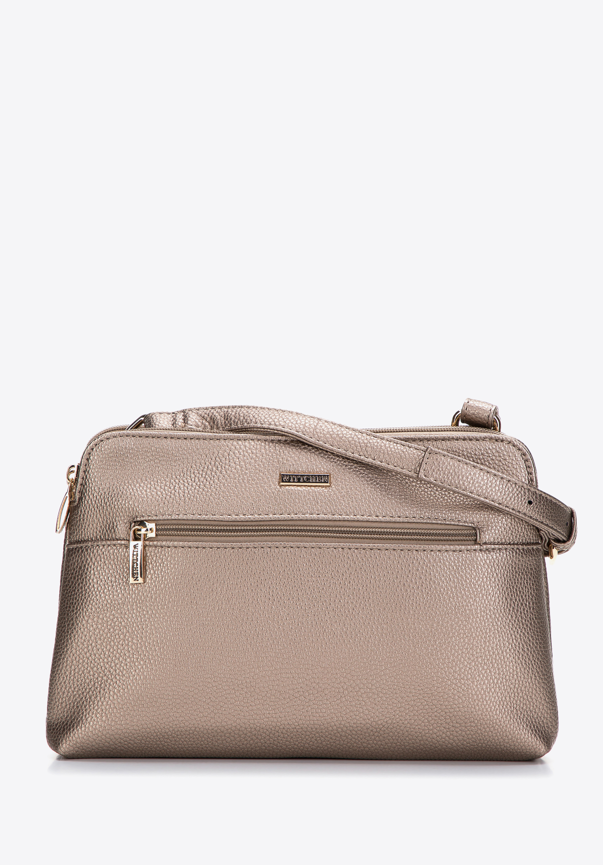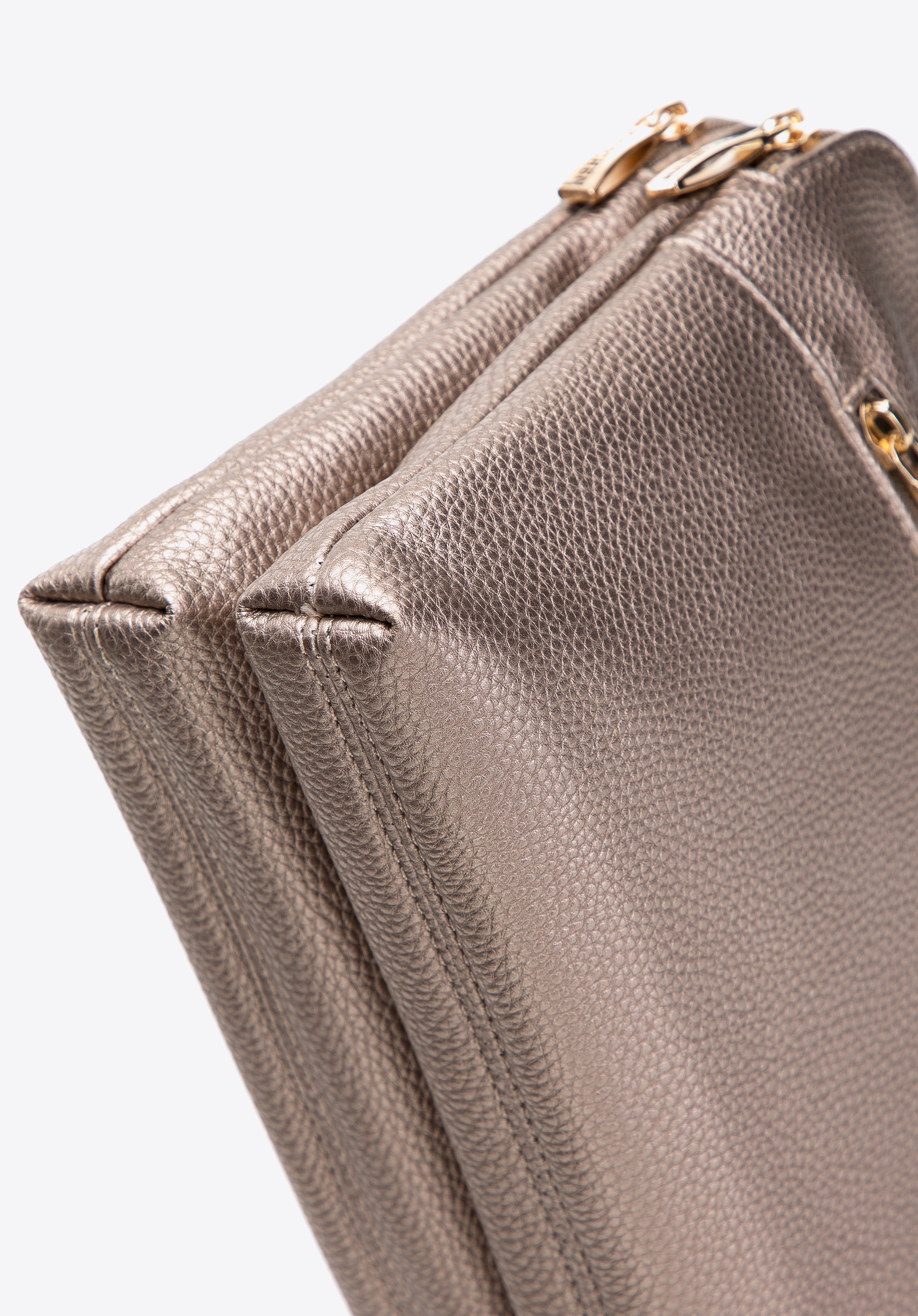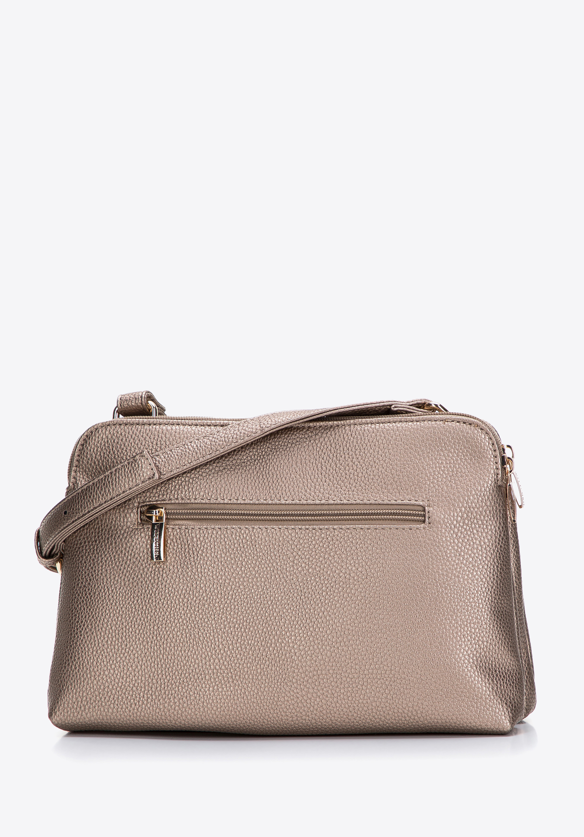 średni rozmiar podzielony na dwie praktyczne, otwierane niezależnie komory, przypominające dwie zszyte ze sobą torebki. Zmieścisz w niej telefon, portfel, małą książkę, kilka kosmetyków i inne drobiazgi, które wygodnie uporządkujesz. Prosty design będzie pasował do wielu stylów i sytuacji. Sprawdzi się i do dżinsów i koszulki, jak i do eleganckiej marynarki i szpilek. Torebka ma