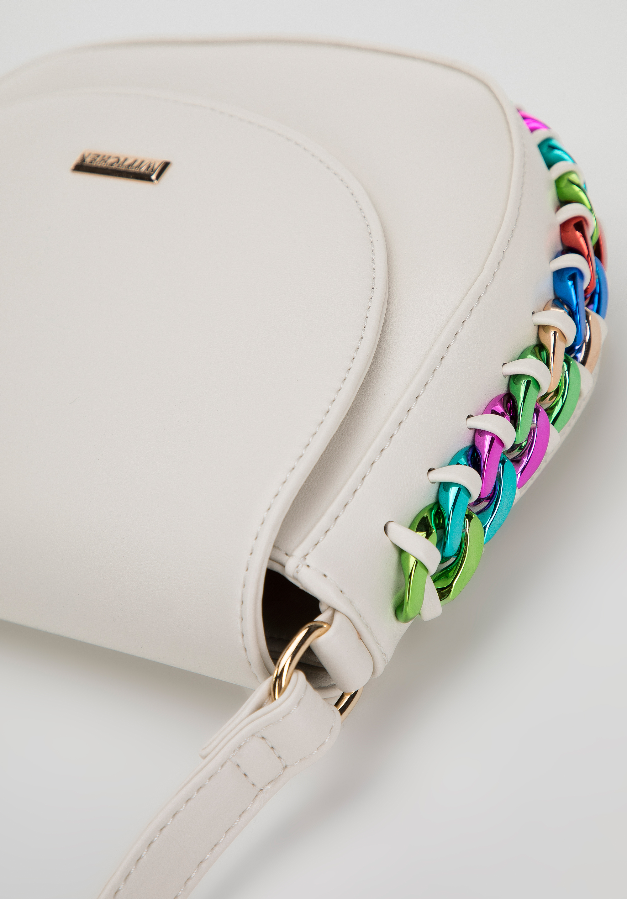połyskujący łańcuch o grubych ogniwach, który podkreśla kształt torebki i dodaje jej blasku. Wykonana została