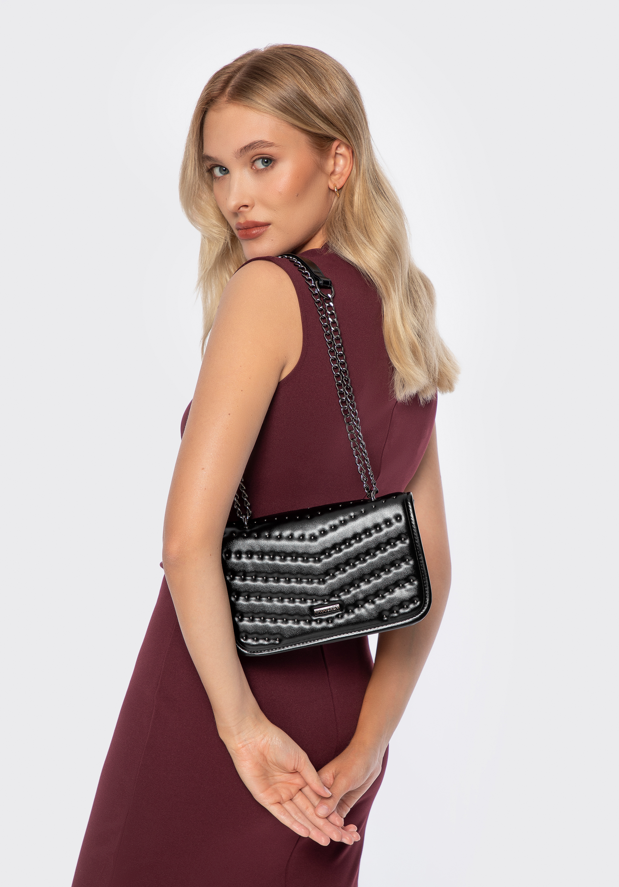 Postaw na torebkę, która łączy elegancję z odrobiną rockowego charakteru. Listonoszka z ekoskóry, ozdobiona błyszczącymi dżetami, wyróżnia się nowoczesnym designem i uniwersalnym stylem, dzięki czemu doskonale dopełni zarówno codzienne, jak i wieczorowe stylizacje. Klapa zamykana na zatrzask magnetyczny zapewnia wygodę i bezpieczeństwo, a praktyczny łańcuszek pozwala nosić torebkę na dwa sposoby – na ramieniu na całej długości lub na pół, tworząc modny, kompaktowy look. W środku znajdują się dwie kieszenie, w tym jedna na zamek, które ułatwiają utrzymanie porządku i szybki dostęp do najważniejszych drobiazgów.