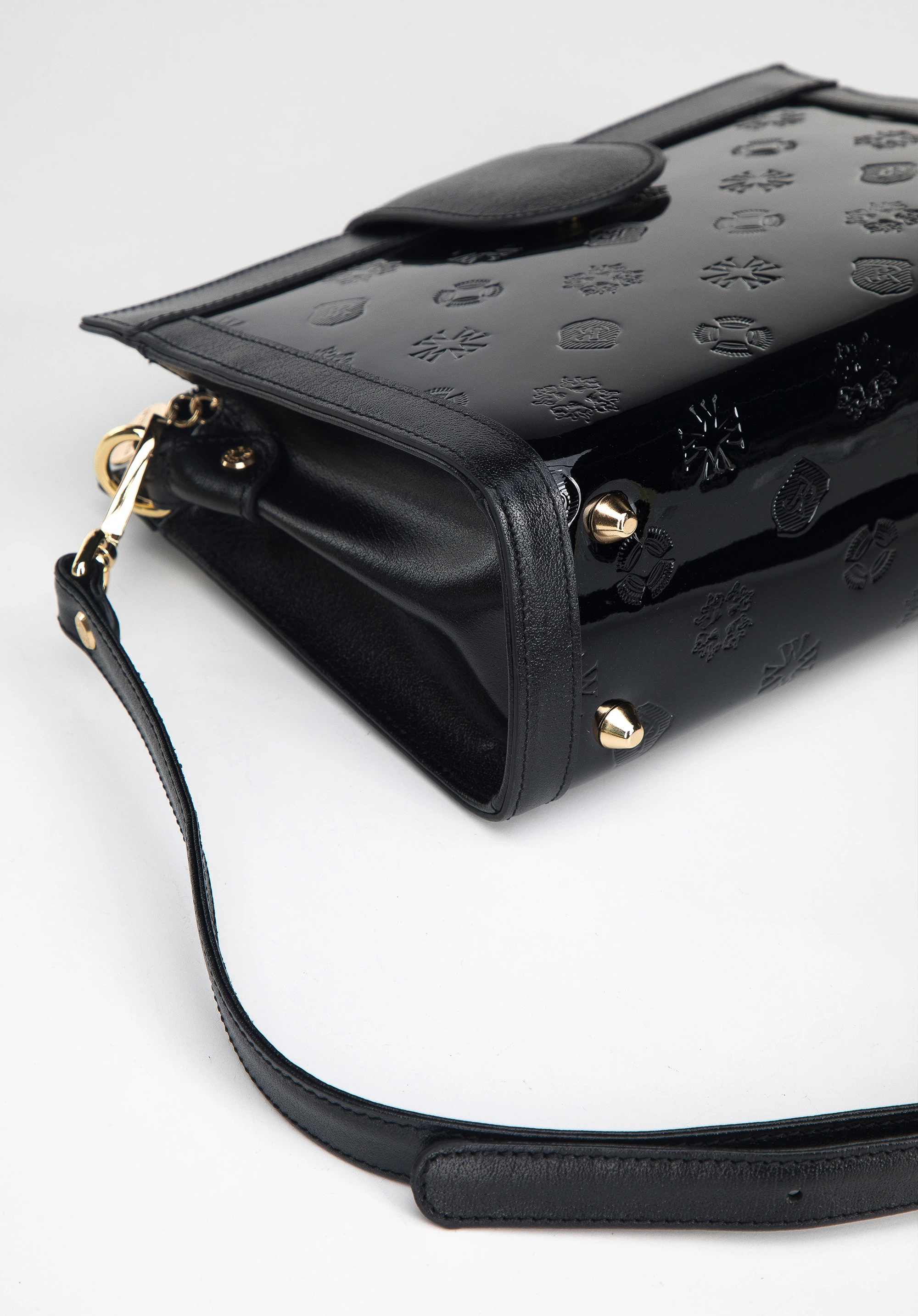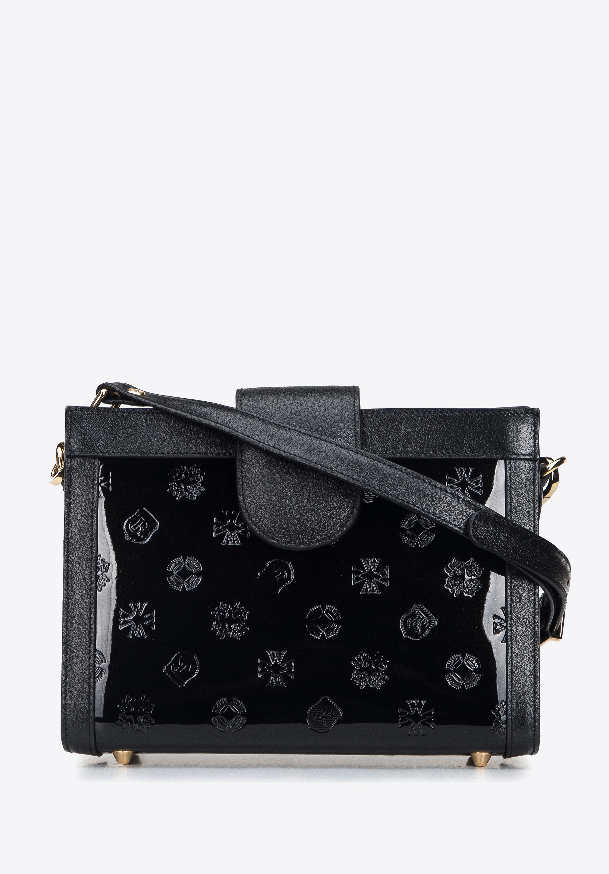 z dwóch rodzajów skór: lakierowanej w monogram z przodu i z tyłu oraz połyskującej po bokach i na brzegach. Dzięki