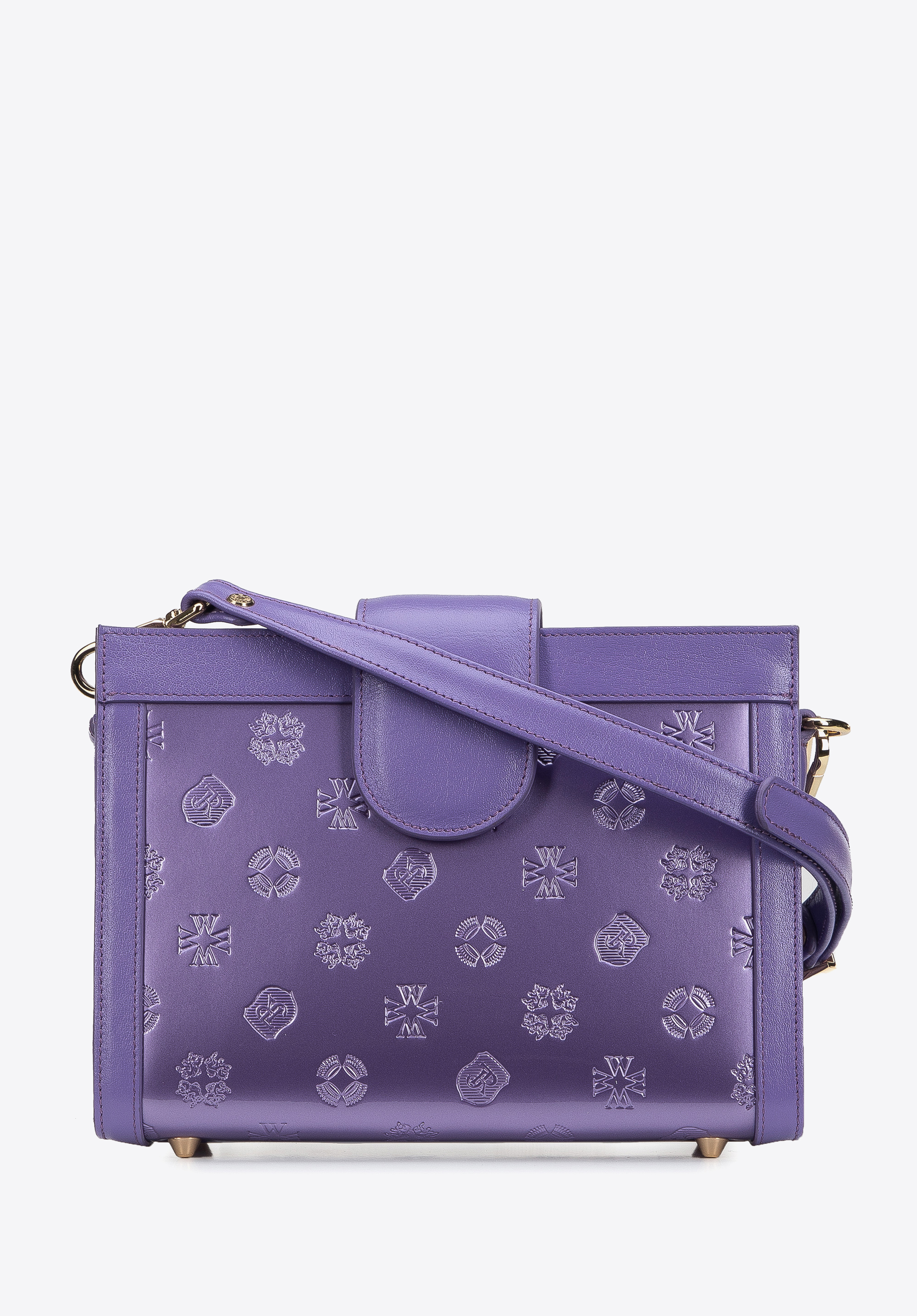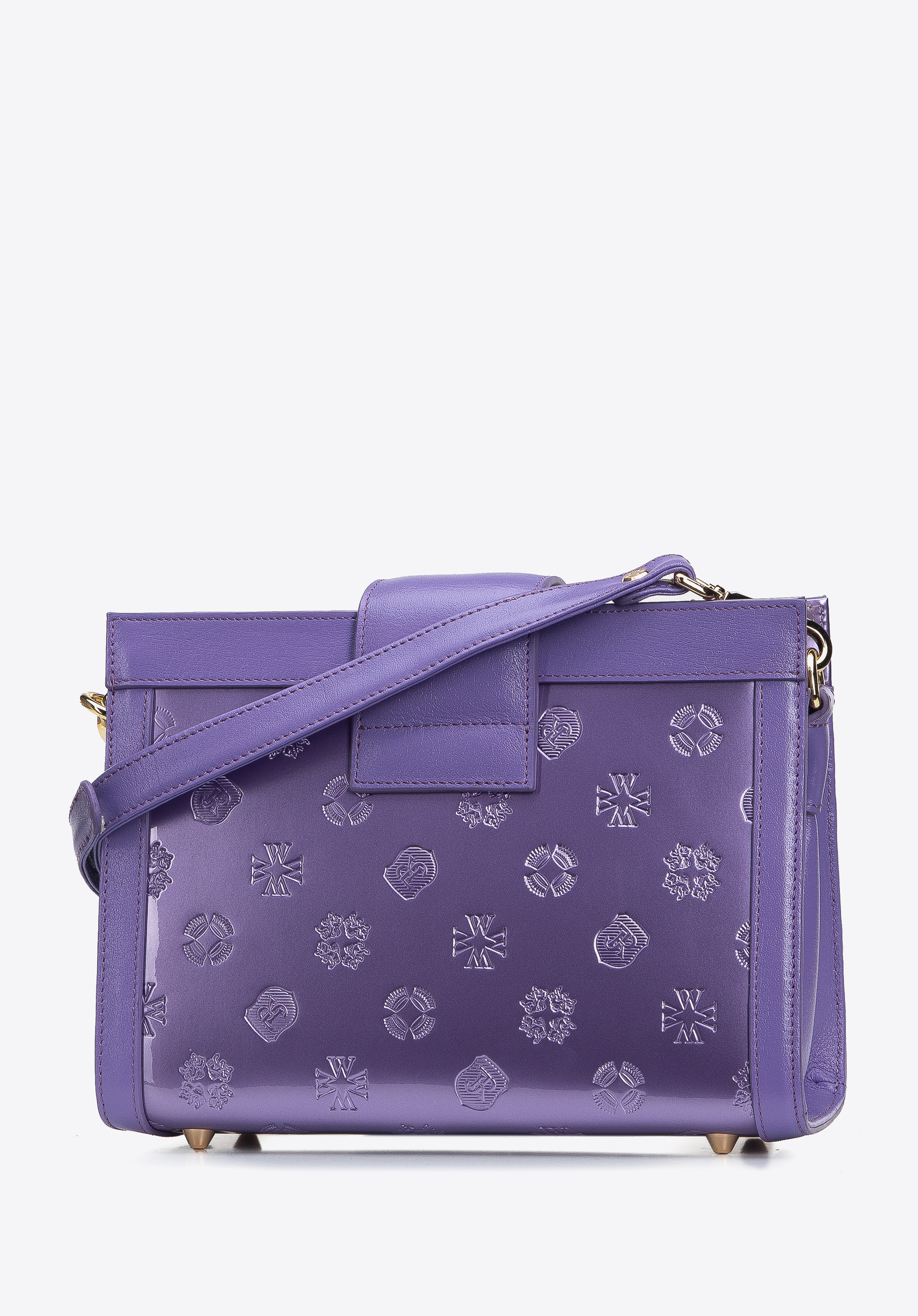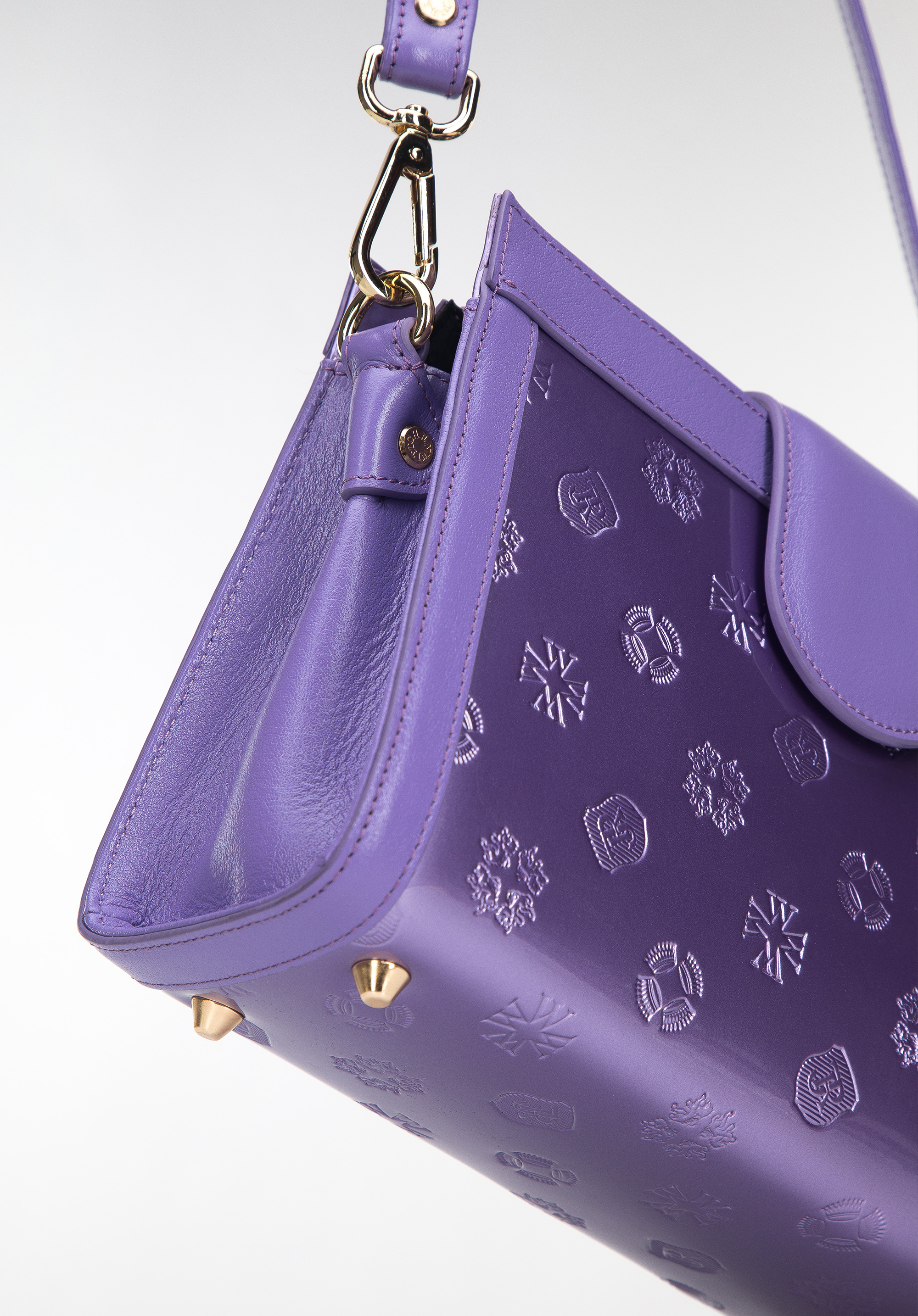 z dwóch rodzajów skór: lakierowanej w monogram z przodu i z tyłu oraz połyskującej po bokach i na brzegach. Dzięki
