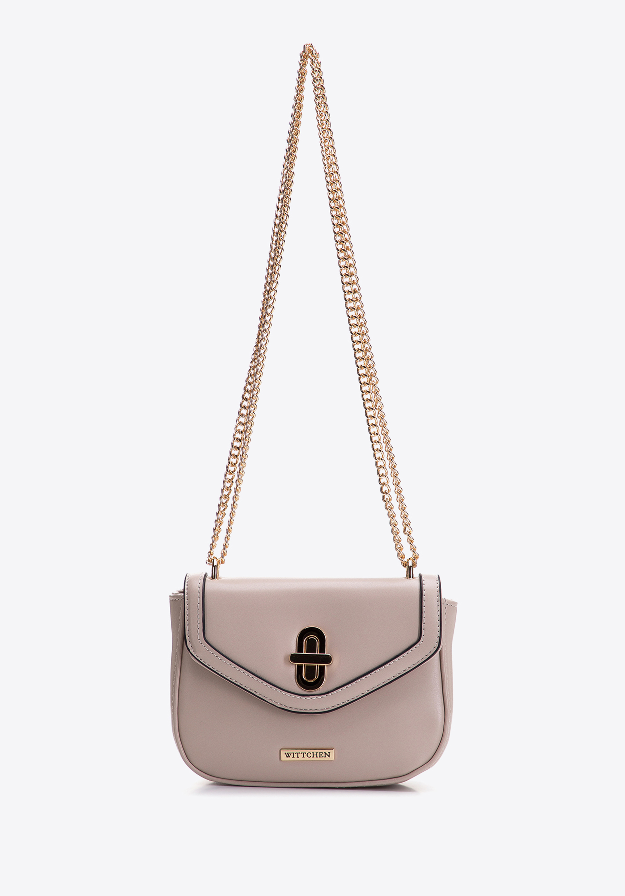 błyszczącą, przekręcaną klamrę oraz łańcuszek, który możesz nosić jak lubisz: na ramieniu lub na skos.