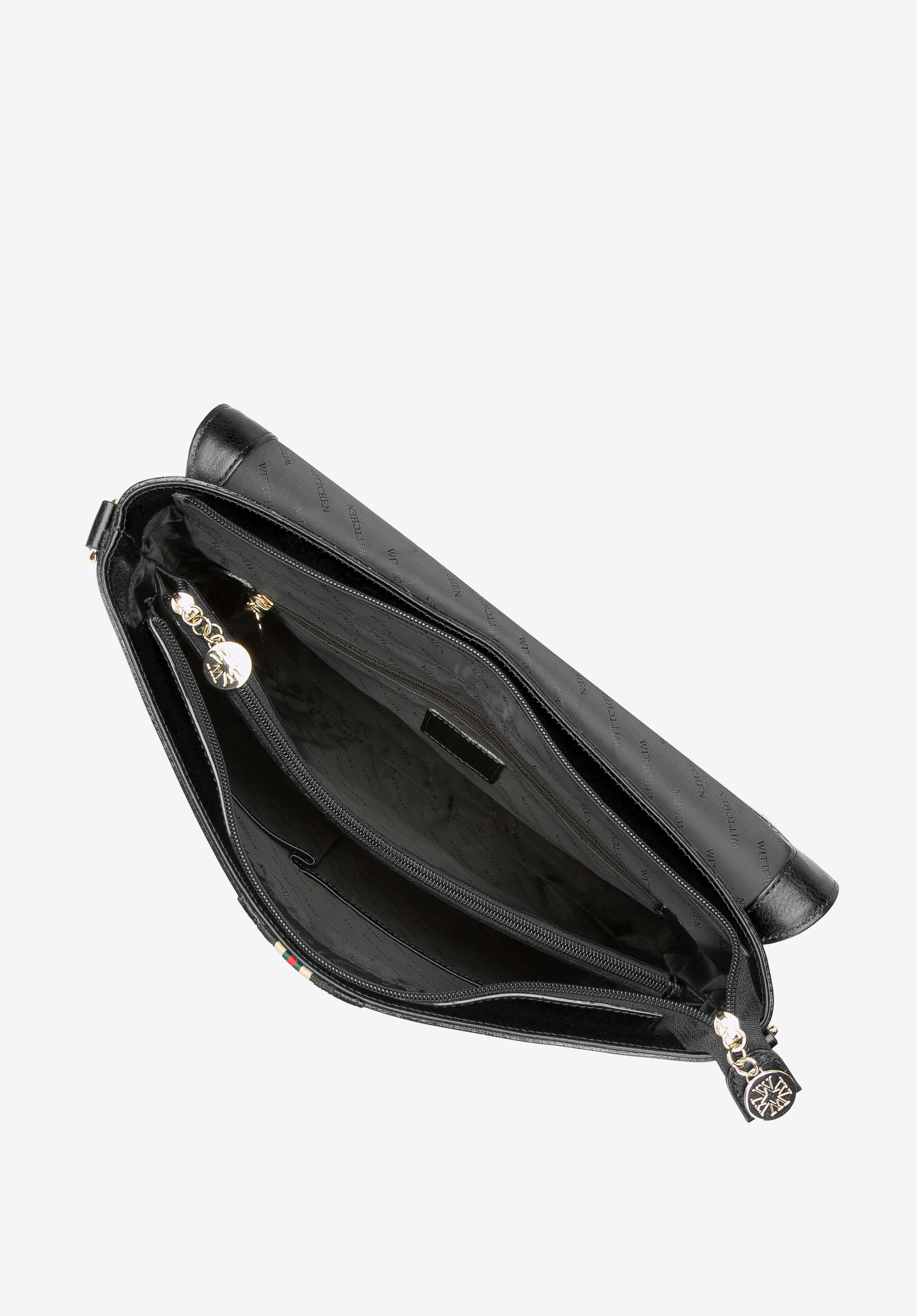 Przesuniesz dłonią po body torebki i już będziesz wiedziała, że masz przy sobie wyjątkowy model. Stylowy monogram nie tylko dodaje jej elegancji, ale pomoże ukoić skołatane nerwy. Listonoszka uszyta jest z usztywnionej skóry lakierowanej i przyozdobiona wielokolorową taśmą. Nowoczesna ozdoba inspirowana sportowymi dodatkami to sprytne rozwiązanie. Nie będziesz musiała każdego poranka przepakowywać się do innej torebki – ta pasuje zarówno do joggersów i sneakersów, jak i ołówkowej spódnicy z białą koszulą. W środku ma dwie oddzielne komory, mieszczące nie tylko najbardziej niezbędne rzeczy, ale i dokumenty i teczki w formacie A4. Damska listonoszka ze skóry lakierowanej z monogramem i tasiemką to doskonały wybór do pracy, na uczelnię czy jednodniową wycieczkę do innego miasta.