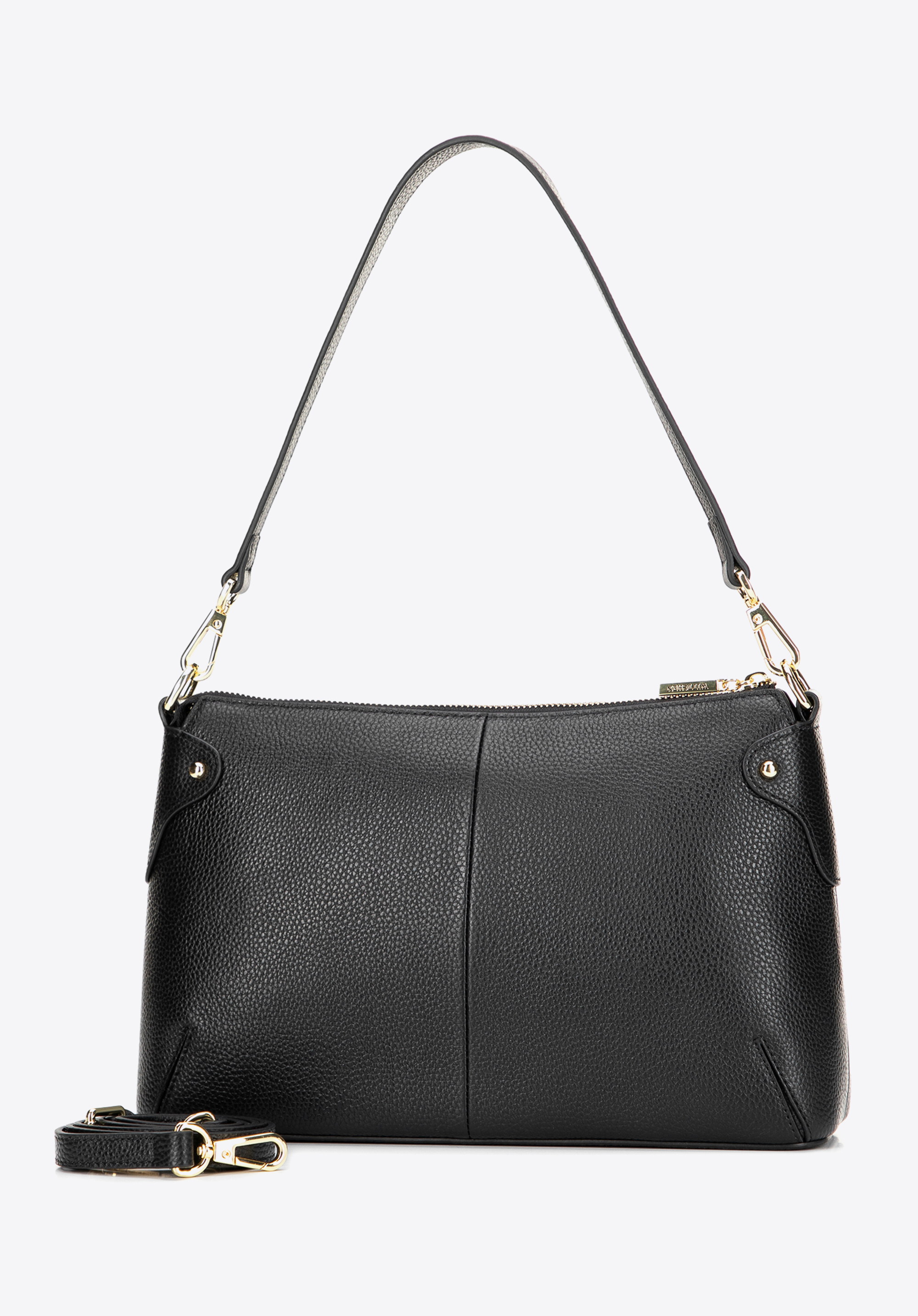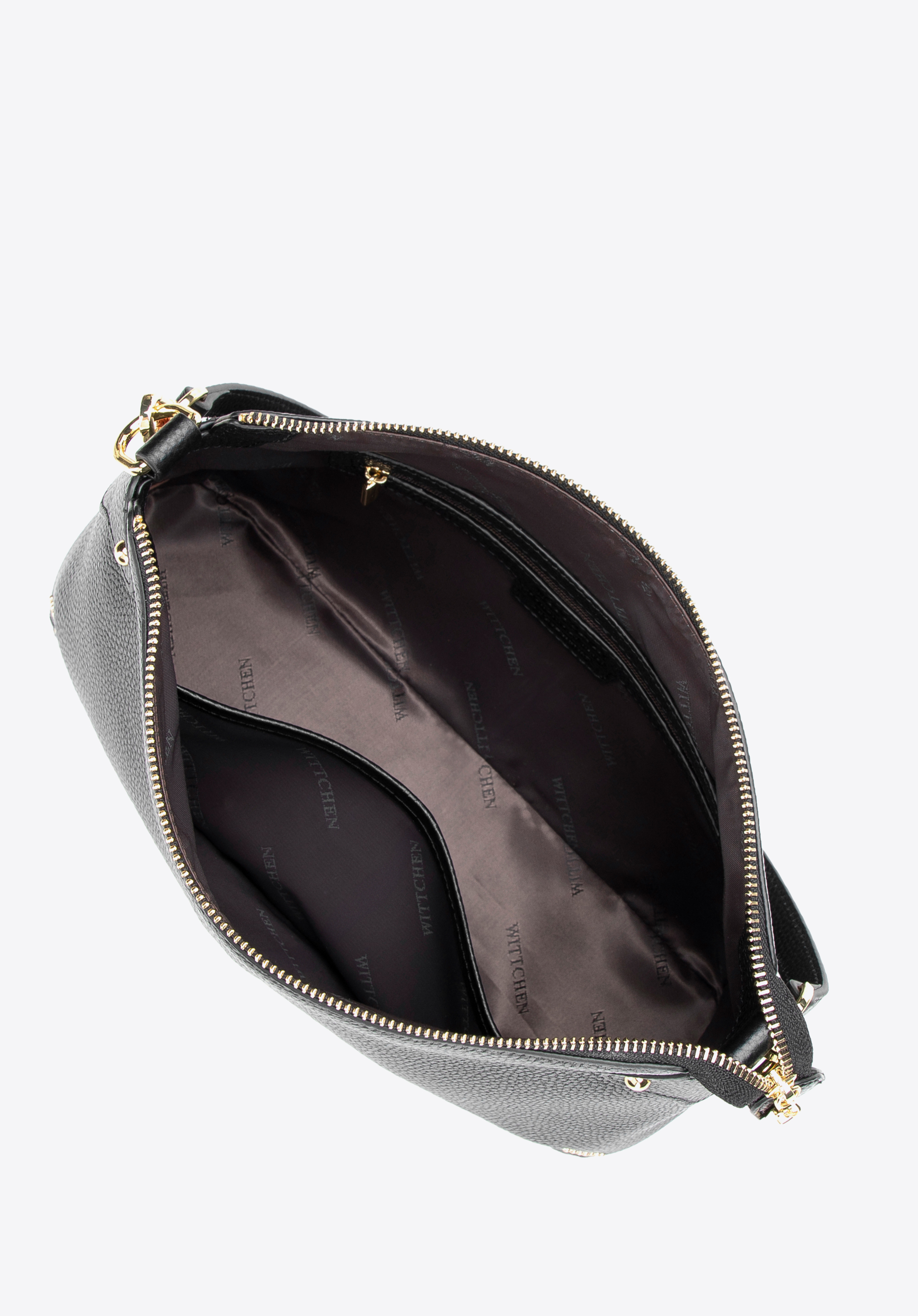 Ta damska listonoszka wykonana z wysokiej jakości skóry naturalnej łączy w sobie elegancję i praktyczność, idealna na codzienne wyjścia. Jej kompaktowy kształt i staranne wykończenia podkreślają ponadczasowy charakter, a drobne, dekoracyjne dżety nadają subtelny, modny akcent. Wnętrze listonoszki zostało zaprojektowane z myślą o wygodzie – znajdziesz w nim dwie kieszenie, w tym jedną zamykaną na zamek, która doskonale zabezpieczy Twoje najważniejsze drobiazgi.